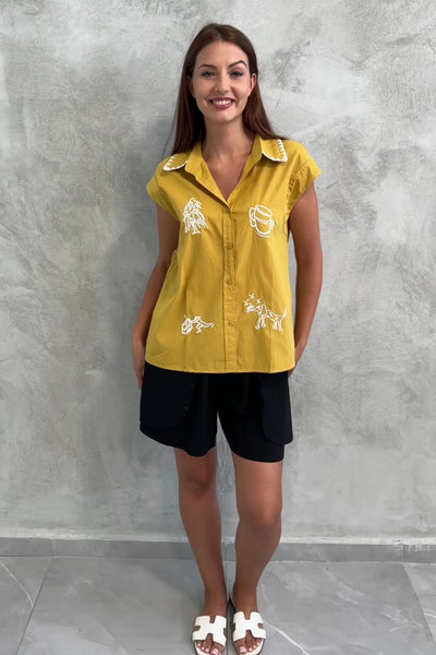 חולצה בגזרת כפתורים קלאסית, בצבע צהוב חרדל רך, עם עיטורי רקמה לבנה בדמויות אבסטרקטיות על פני כל החזית. הצווארון המעוצב עם תיפורי זיגזג לבנים מוסיף טאץ' צעיר.