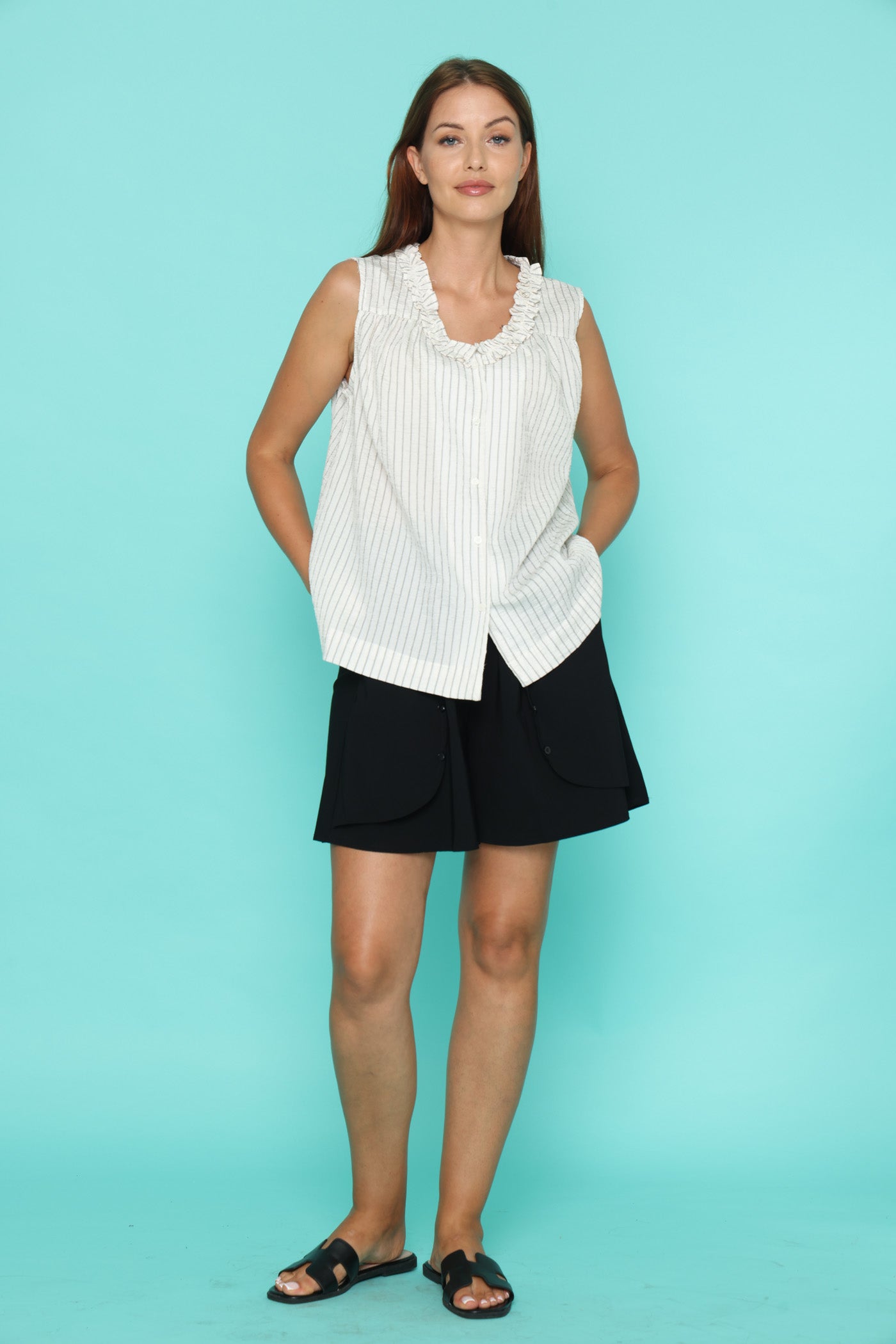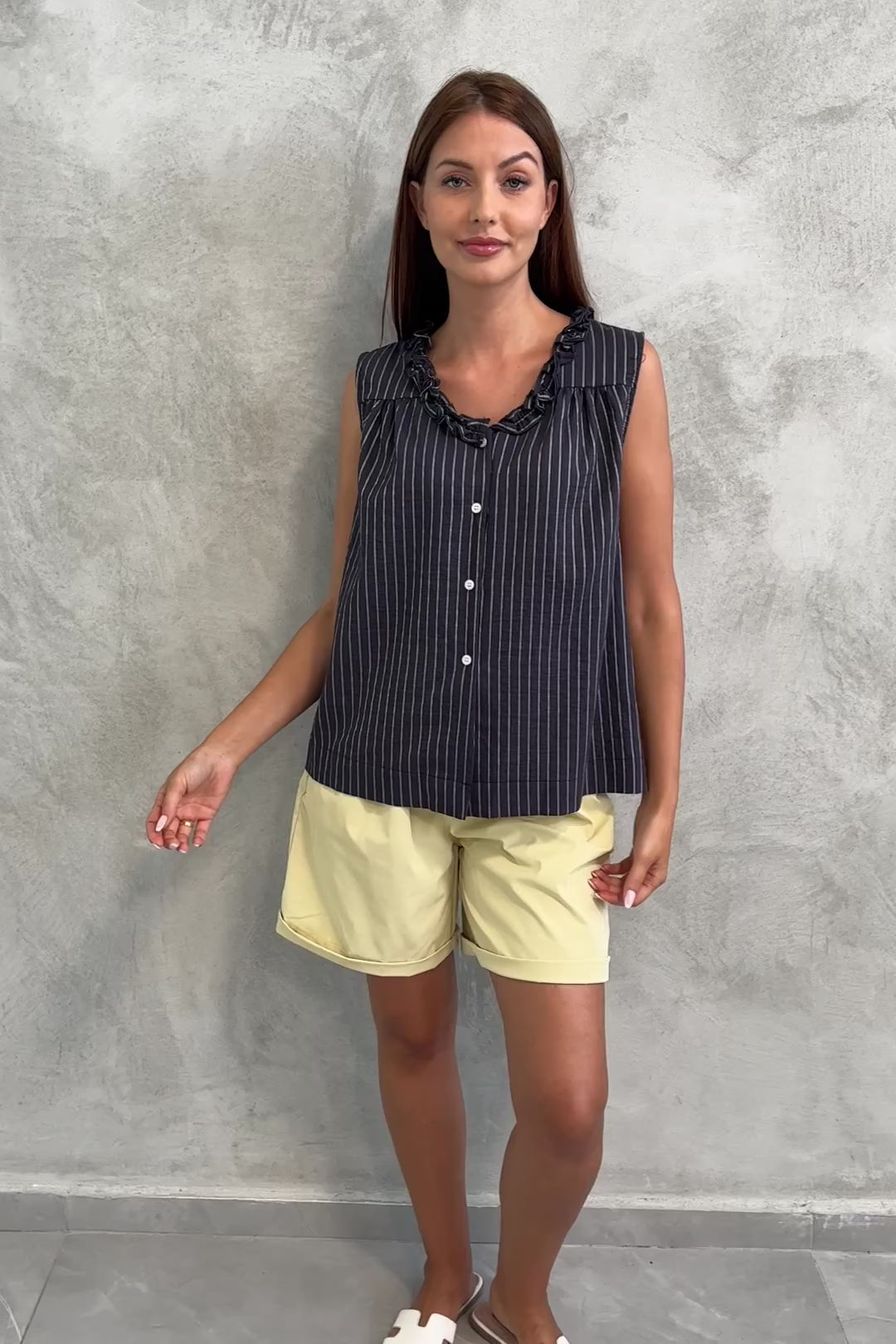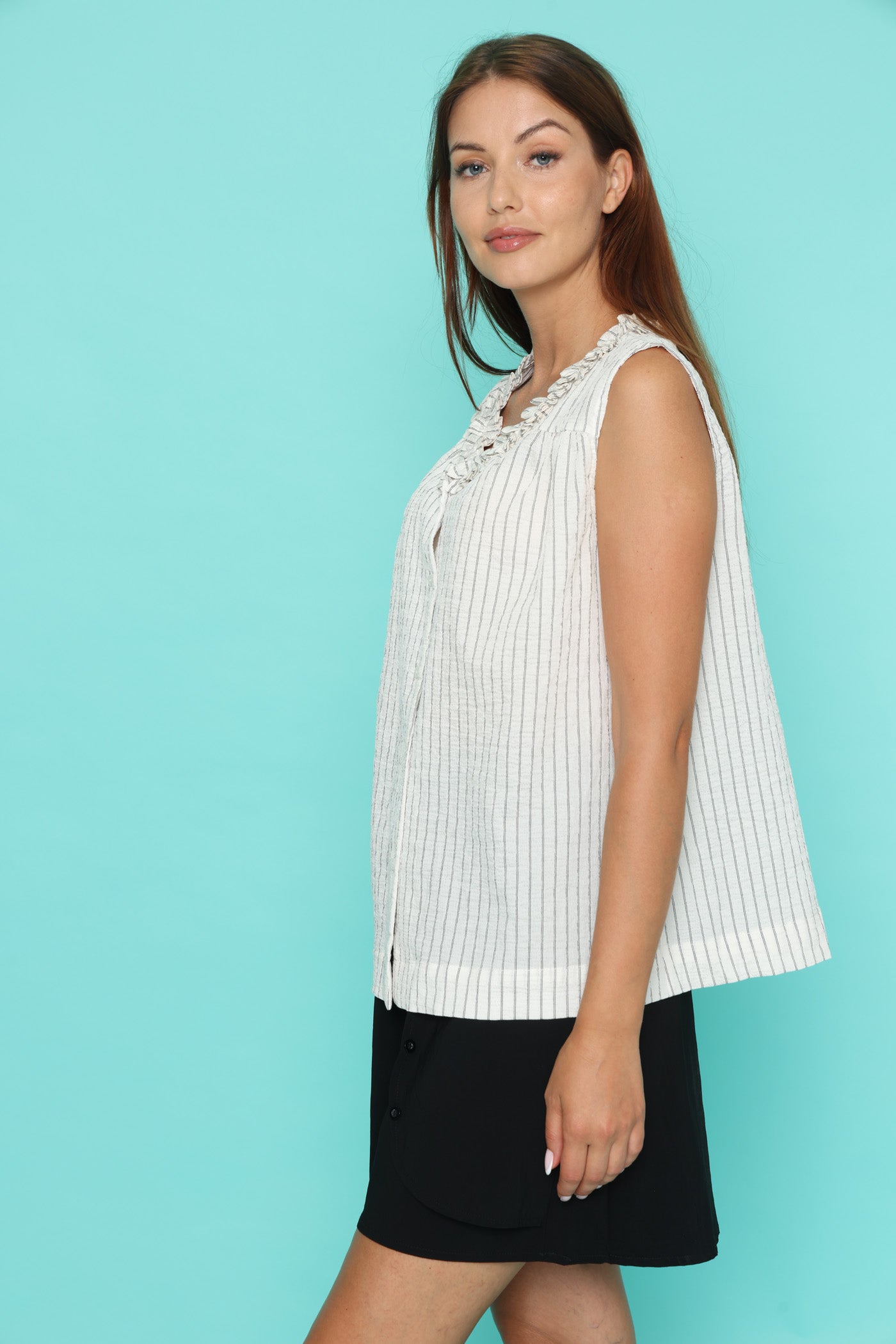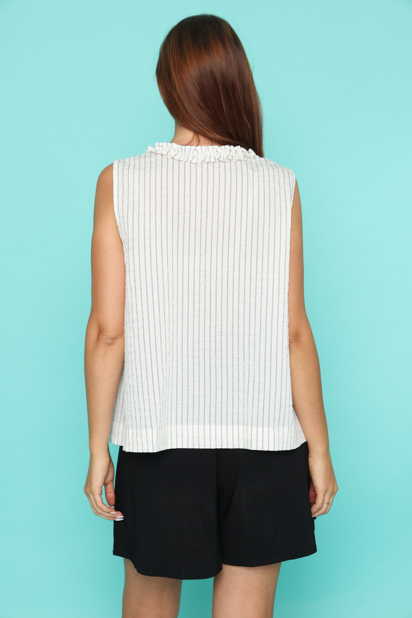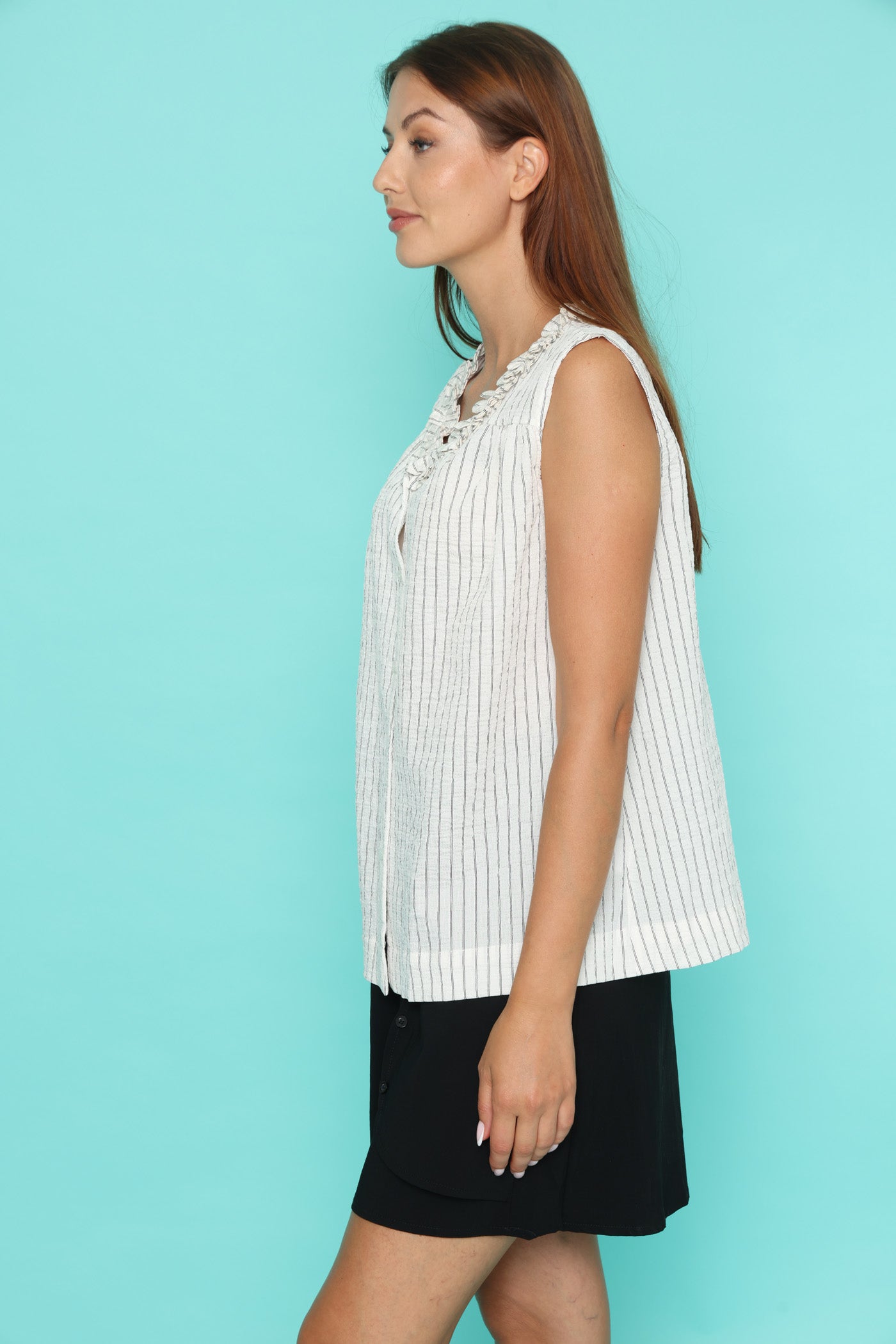 חולצה ללא שרוולים בגזרה ישרה ורכה, עשויה בד קליל עם פסים אנכיים. באזור המחשוף מלמלה עדינה שיוצרת מראה רומנטי ומעודן.