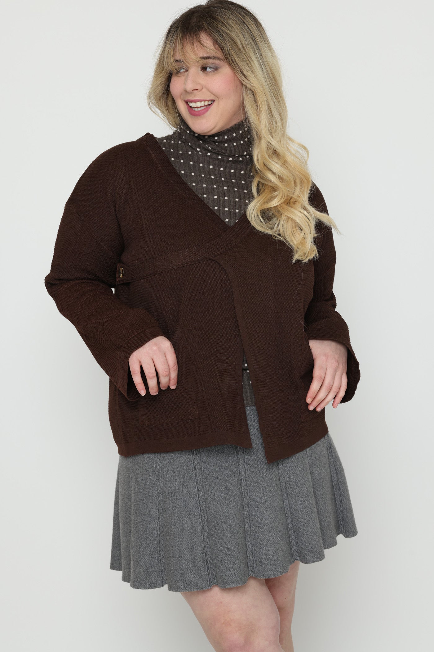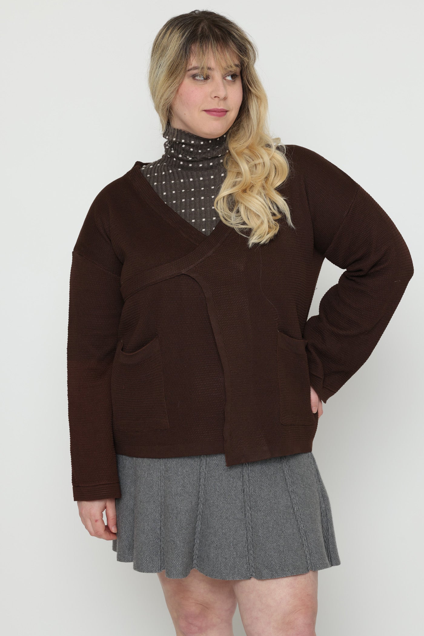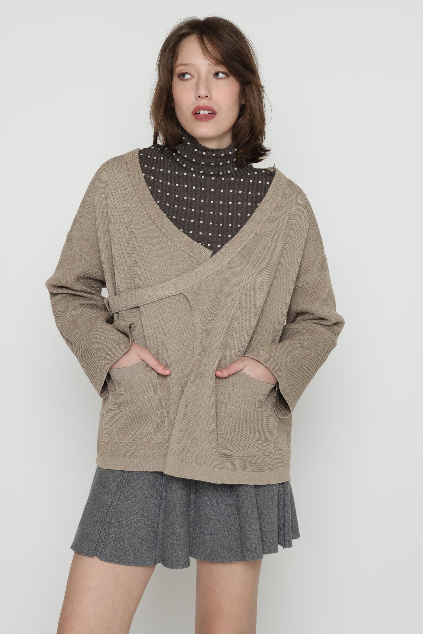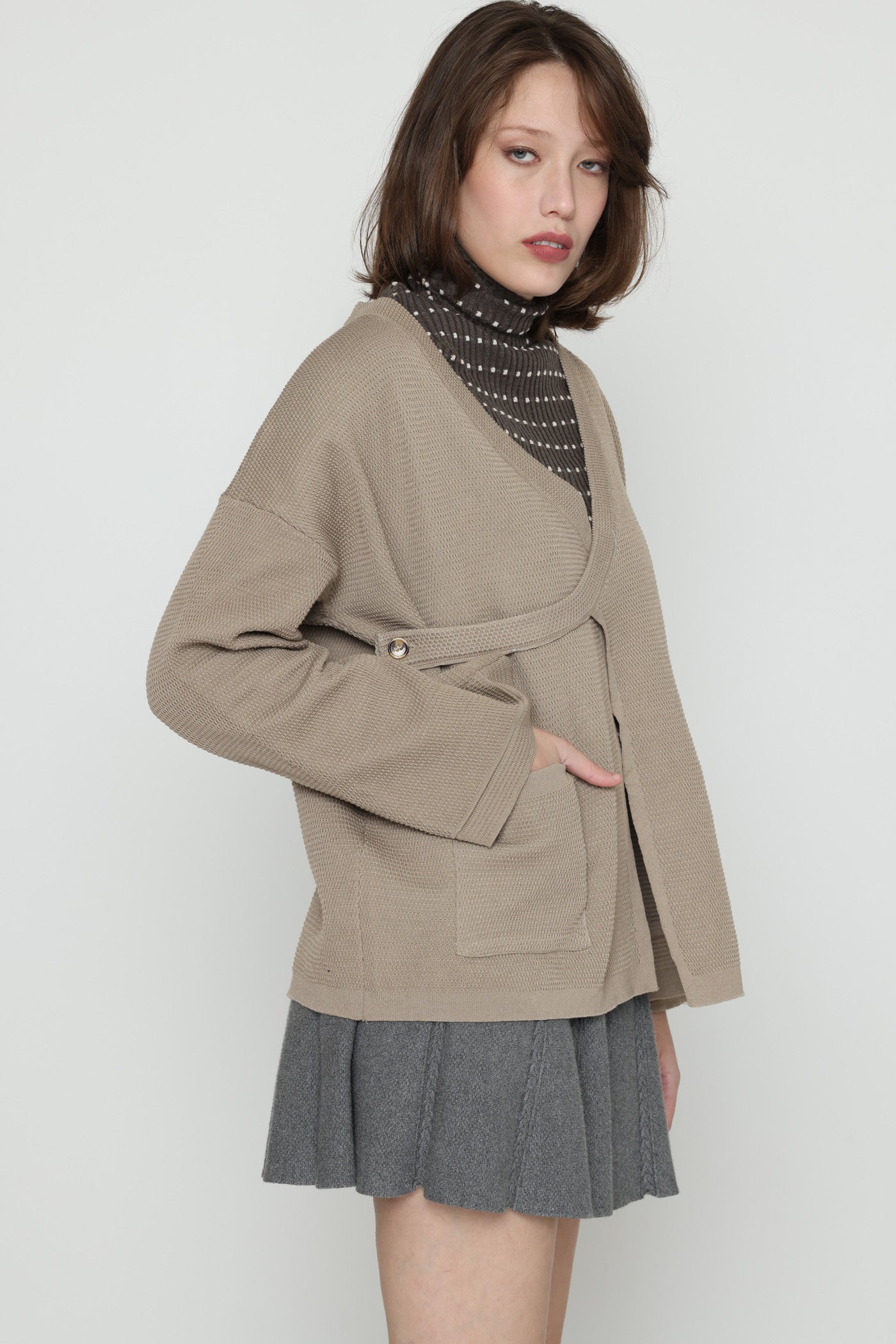 ג'קט עבה ומחמם בגזרת מעטפת, בשילוב כיסים צדיים וסגירת כפתור צידי.