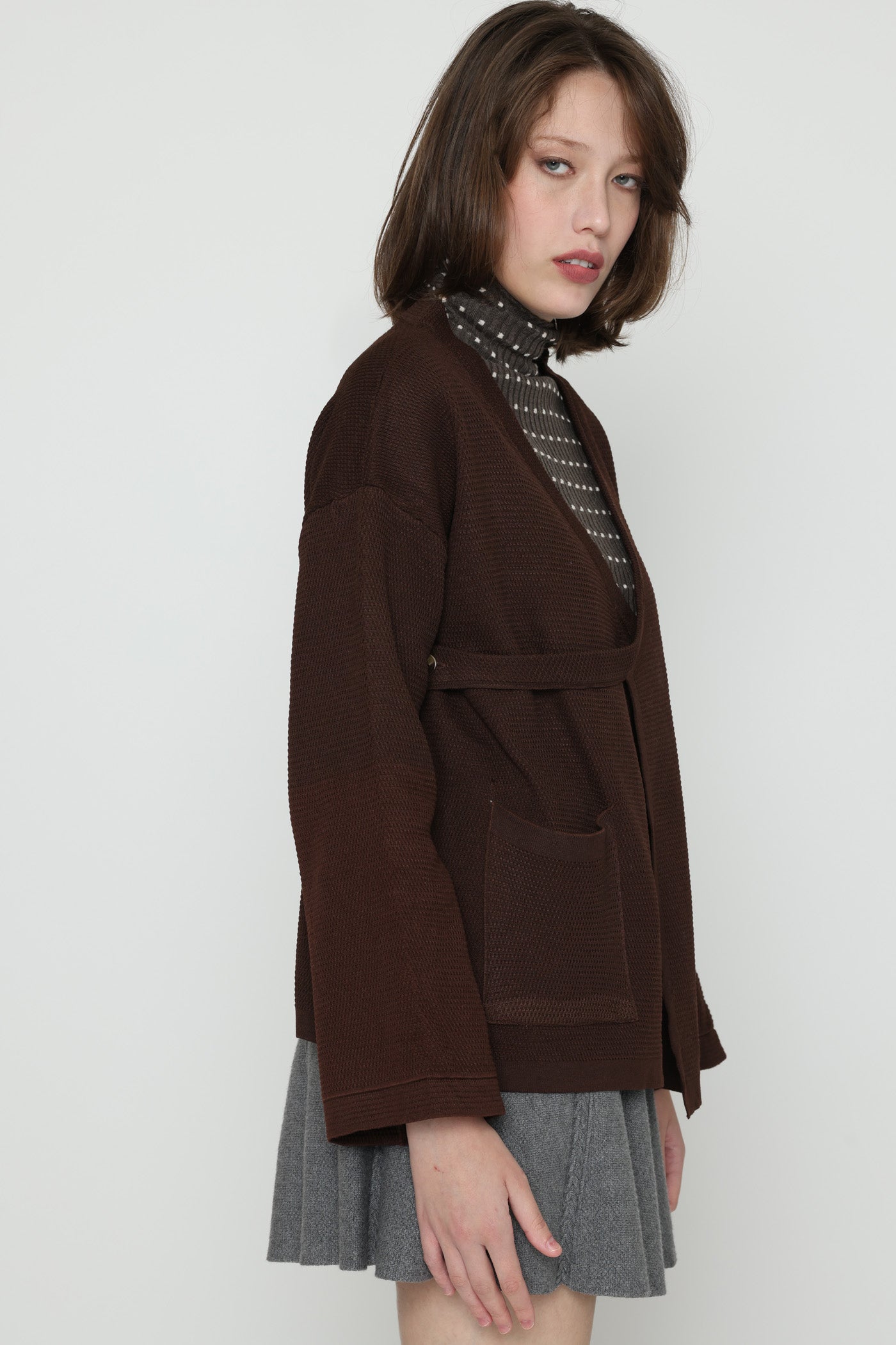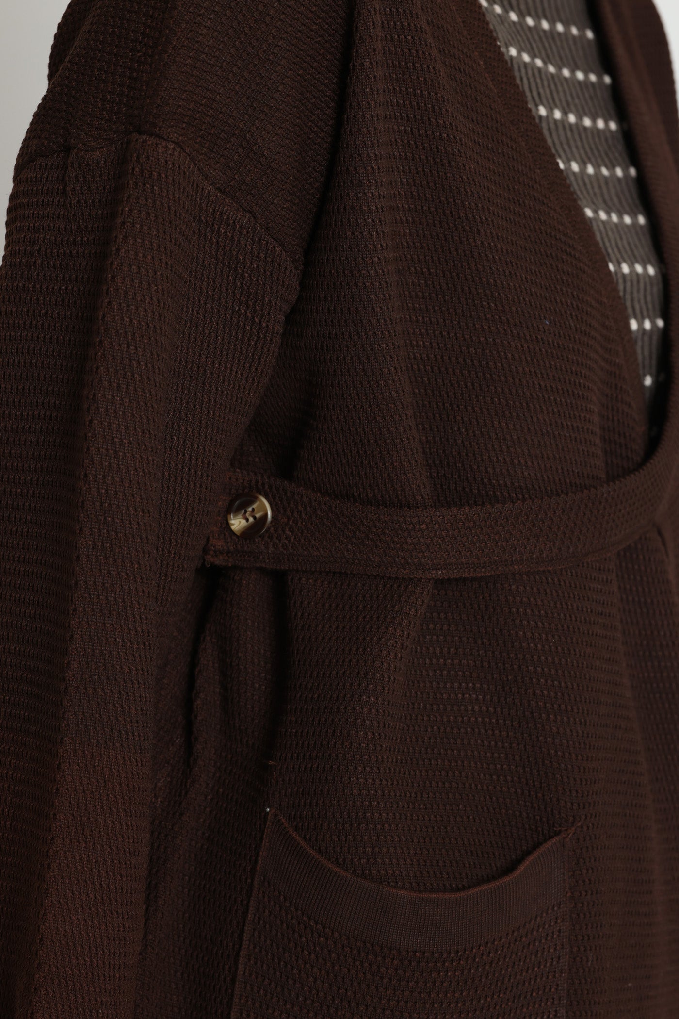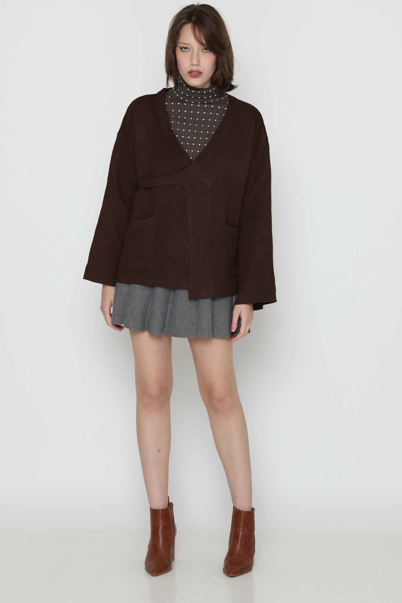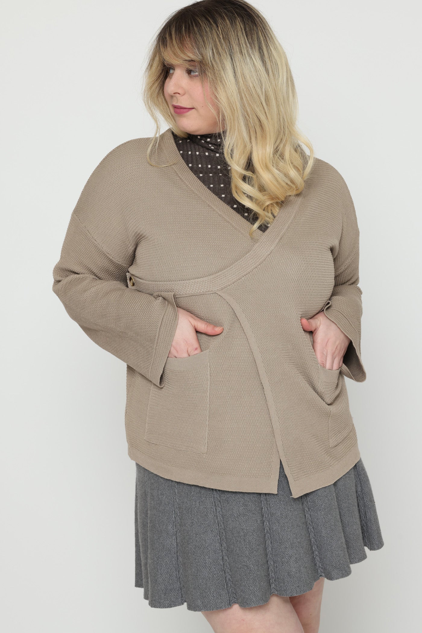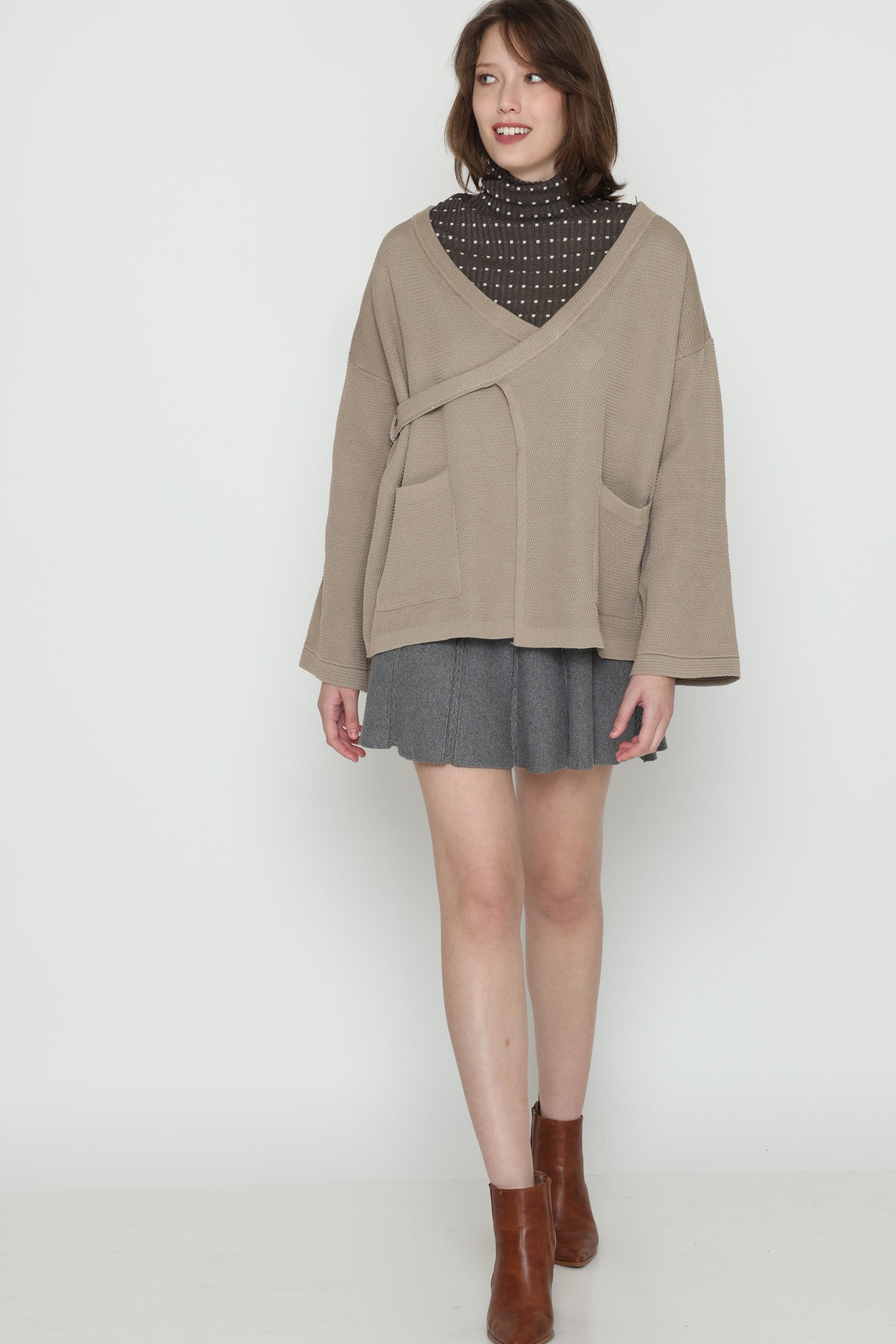 ג'קט עבה ומחמם בגזרת מעטפת, בשילוב כיסים צדיים וסגירת כפתור צידי.