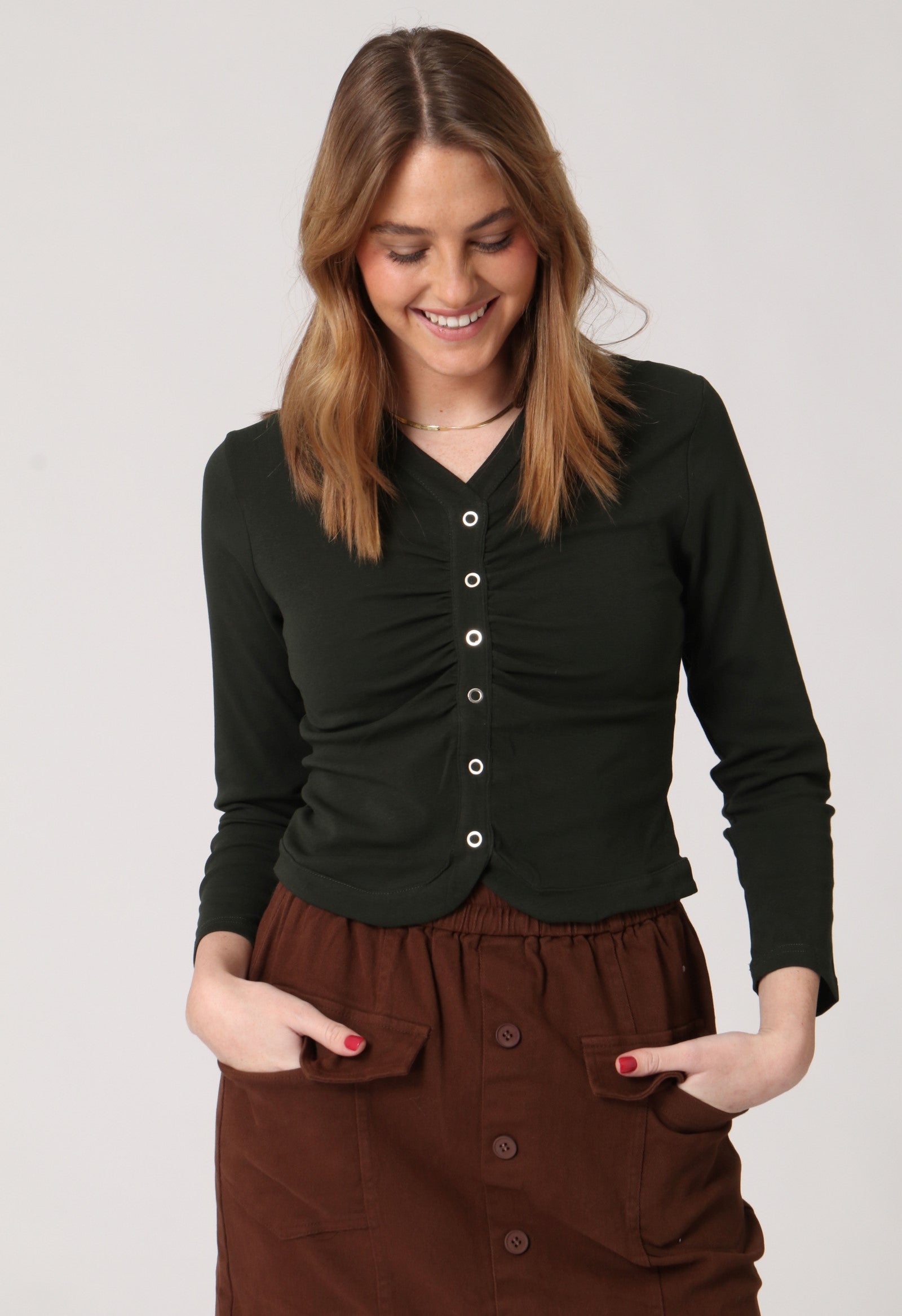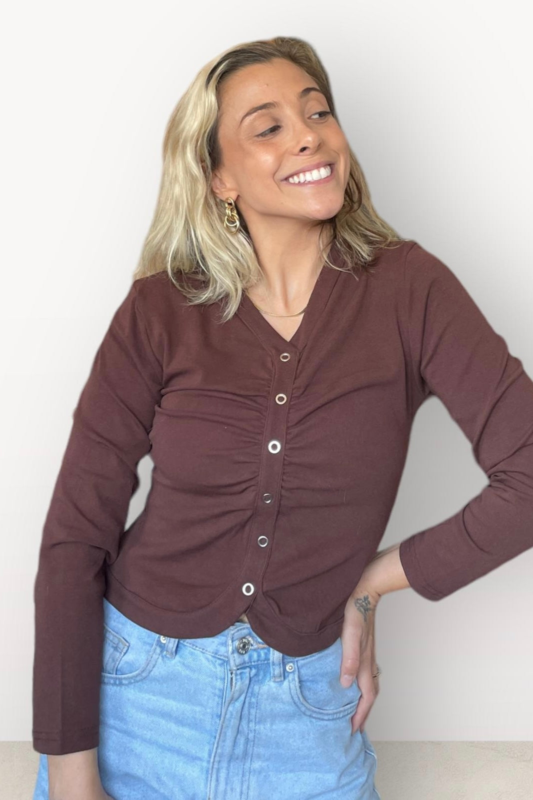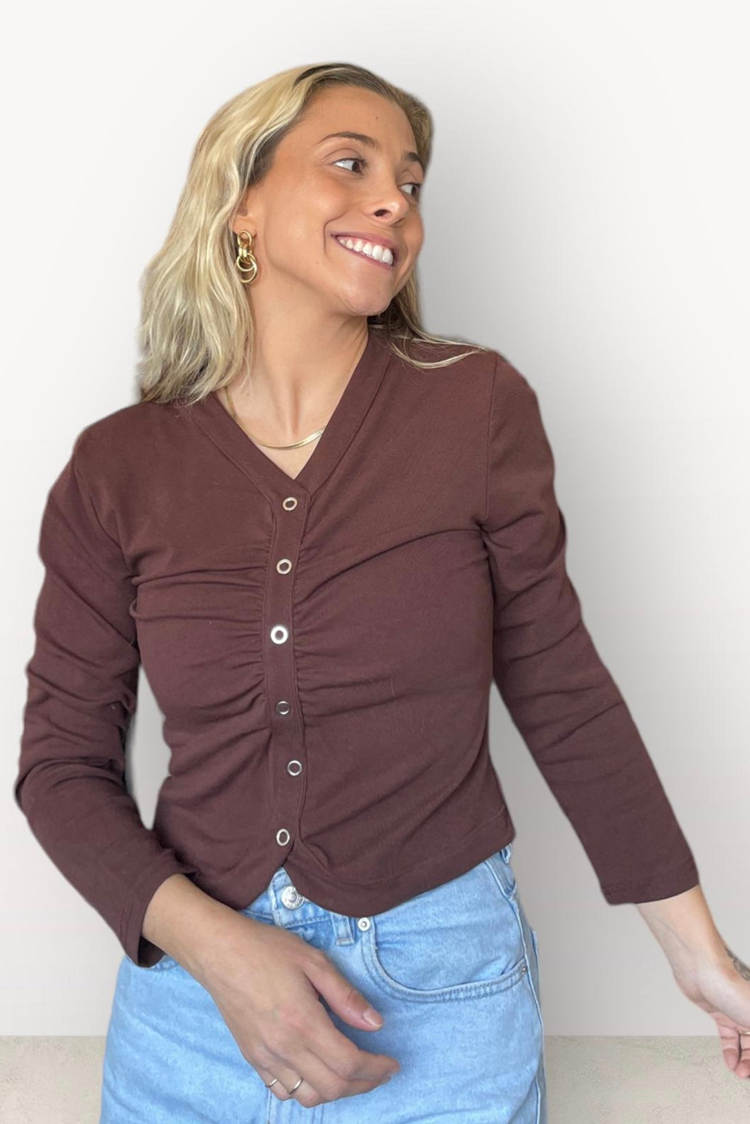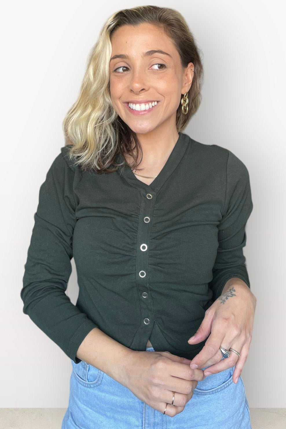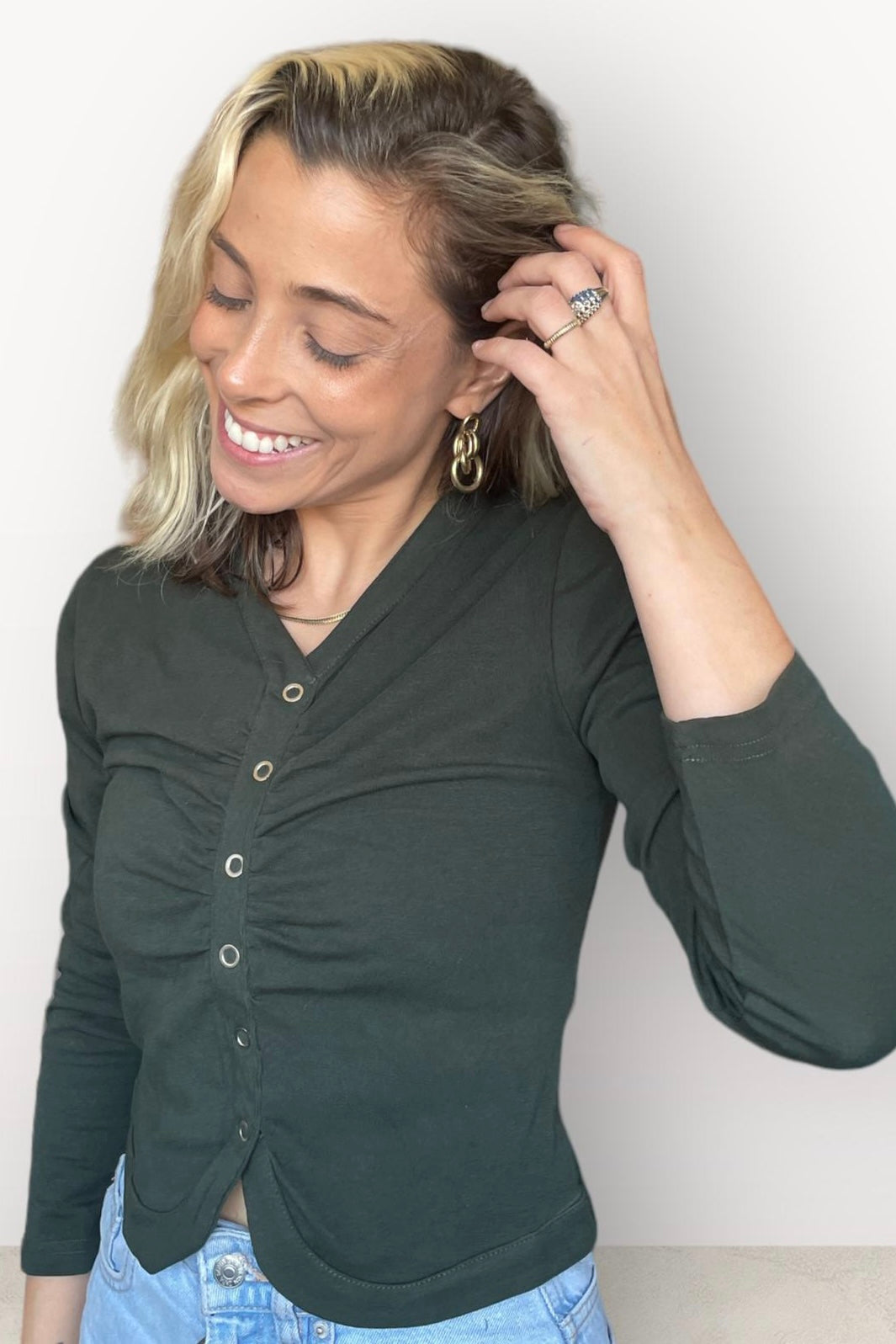 חולצה בגזרה צמודה, בשילוב צווארון V וכפתורים.