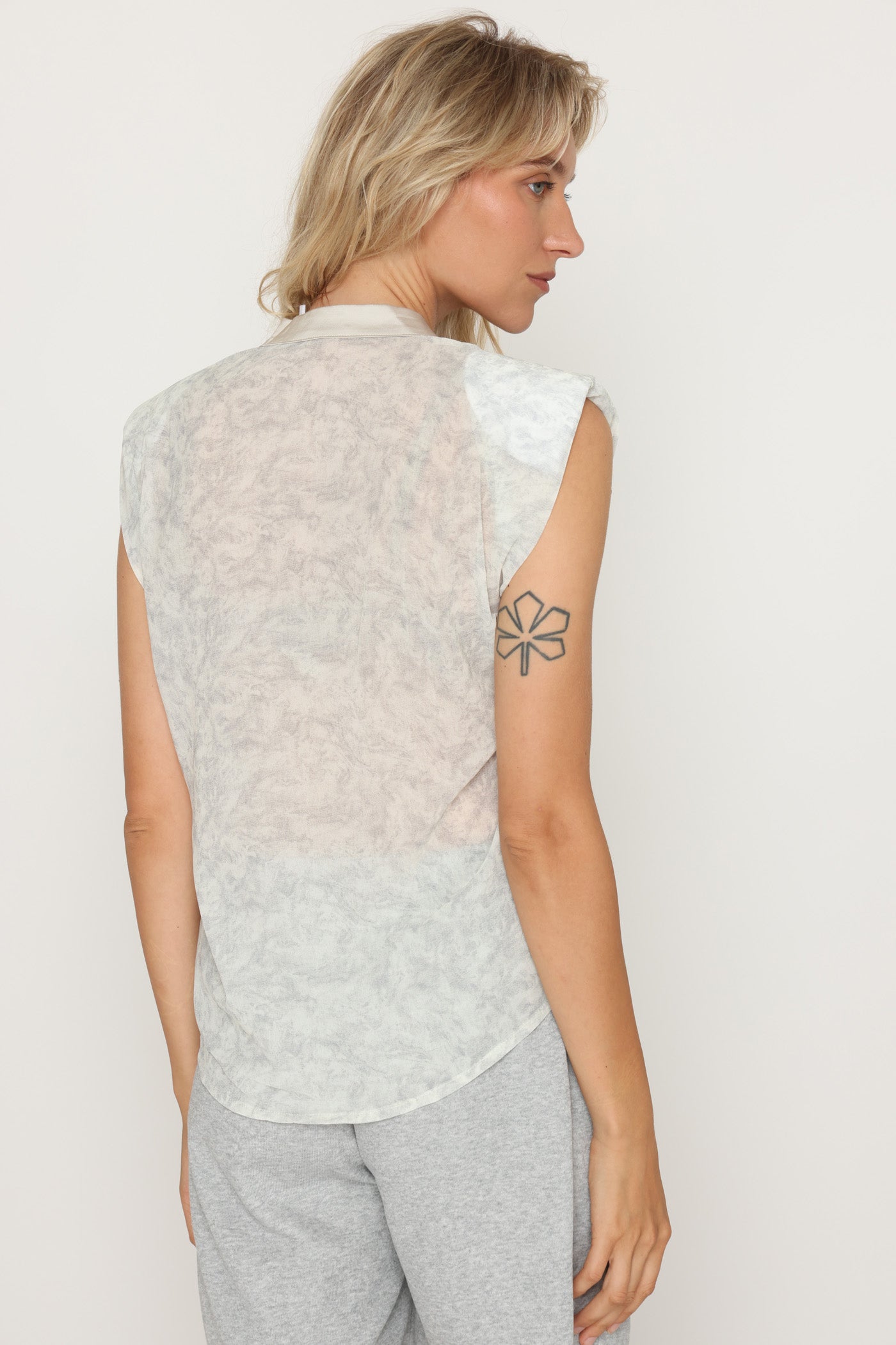 חולצה דקה ושקפקפה בגזרה ישרה, בשילוב כריות בכתפיים וסגירת תיקתקים בצורת פרפר.