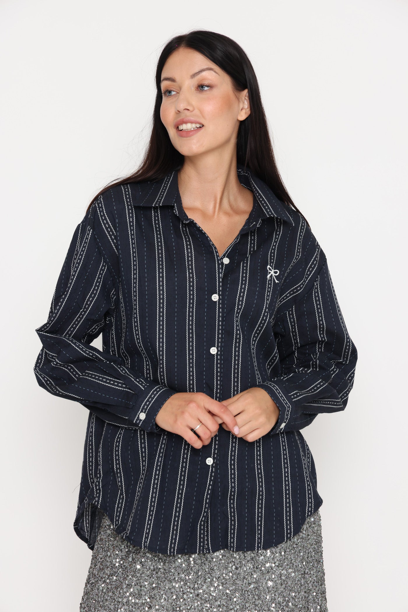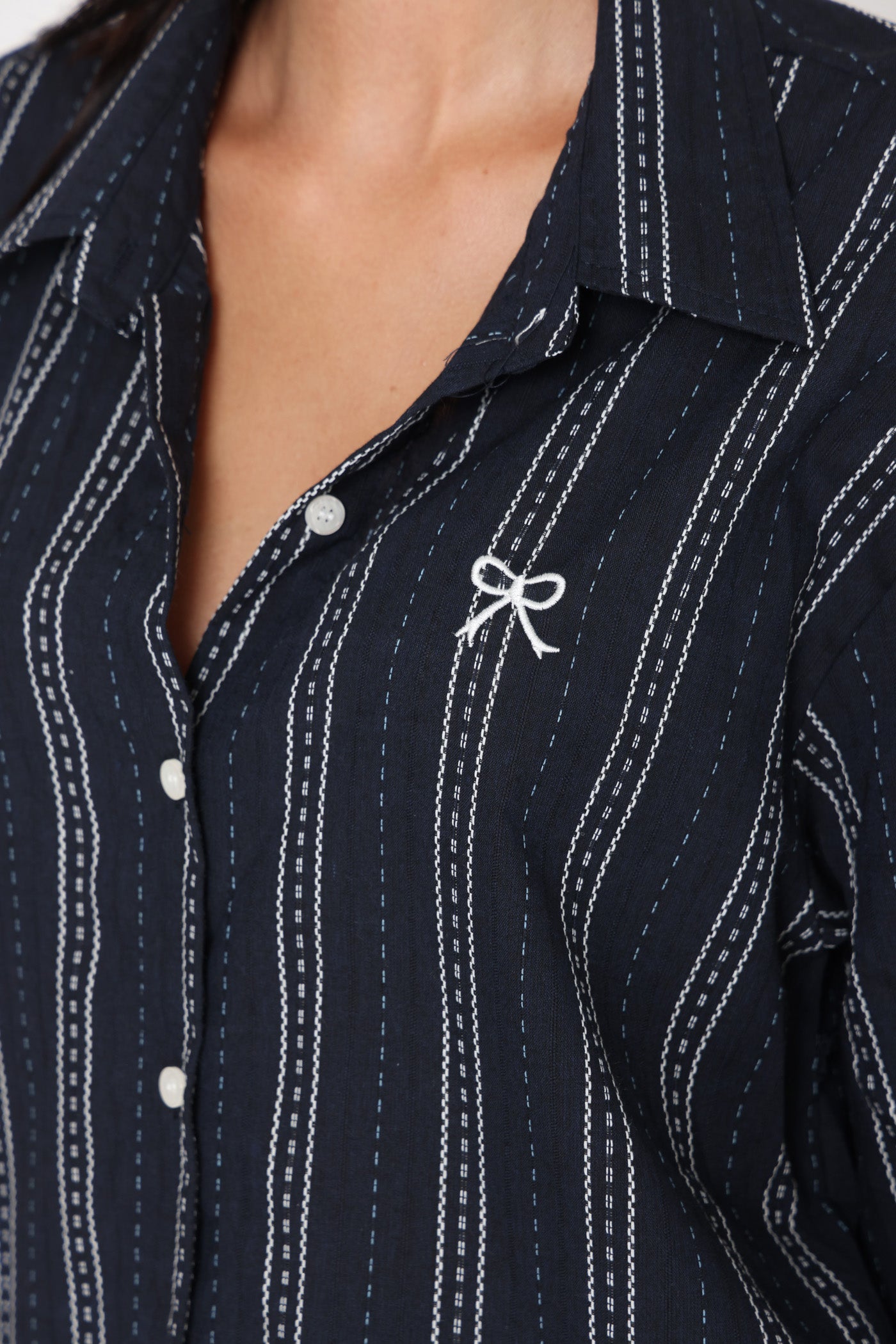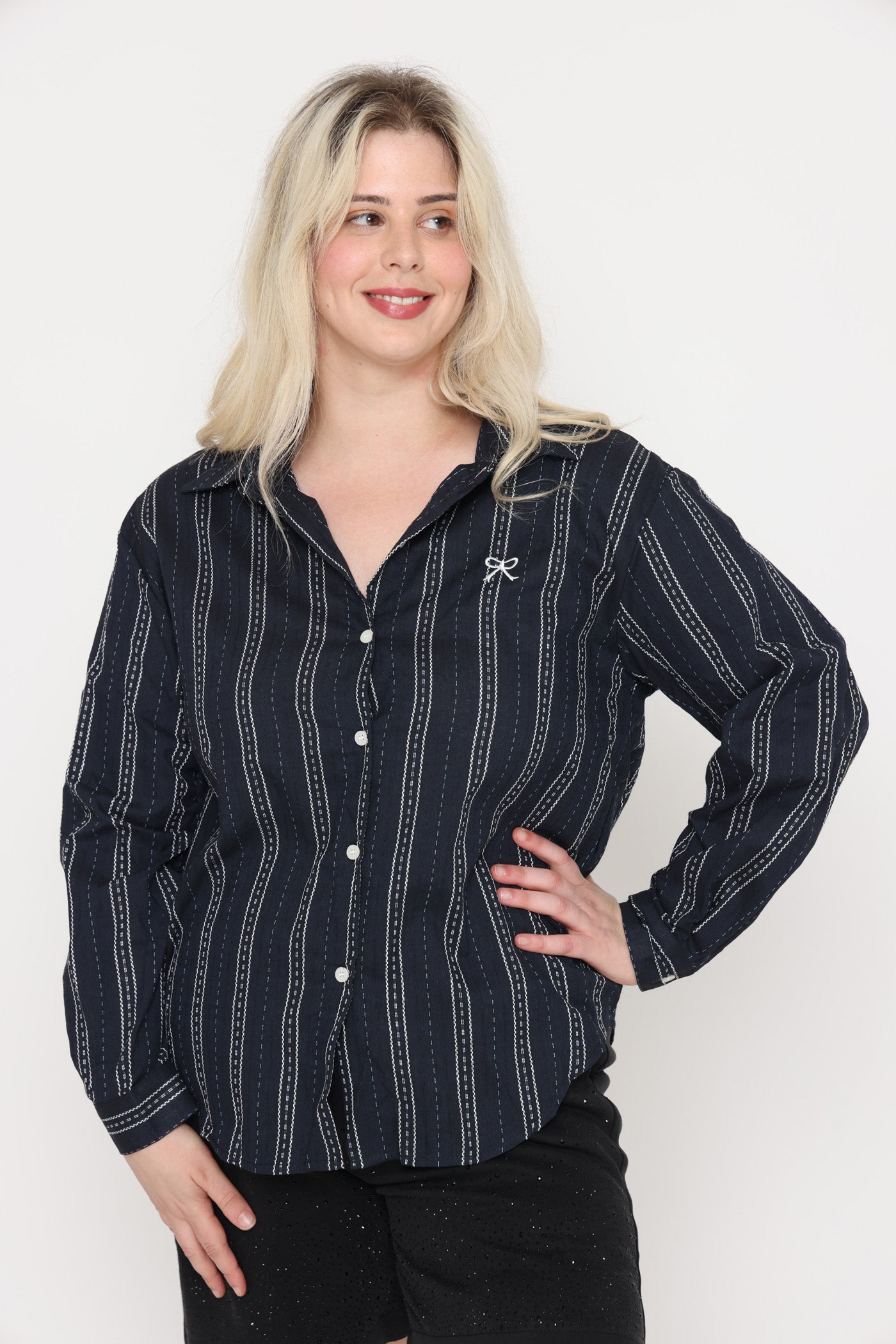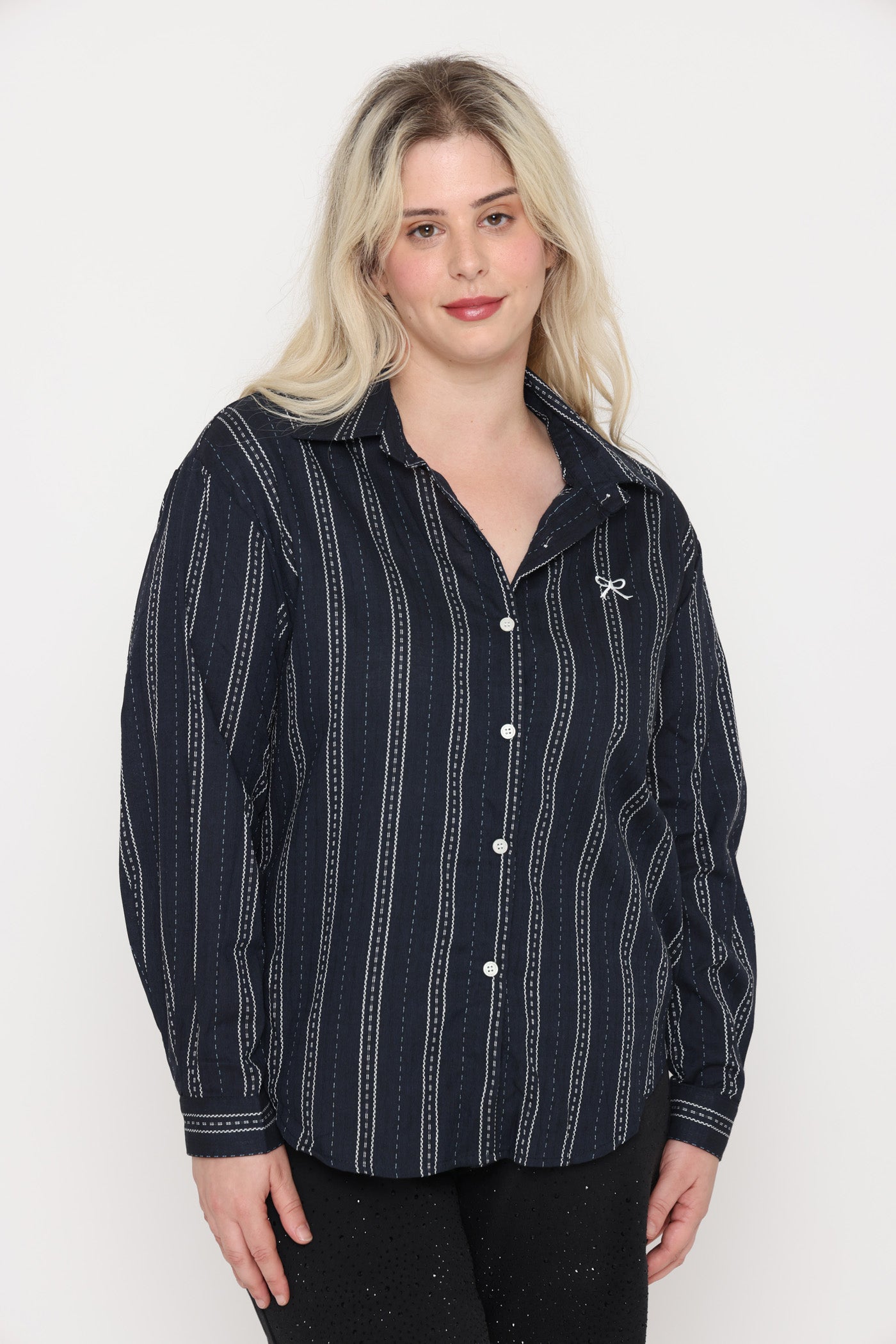 חולצה מכופתרת בגזרה רחבה, בטקסטורת פסים ופפיון קטן.