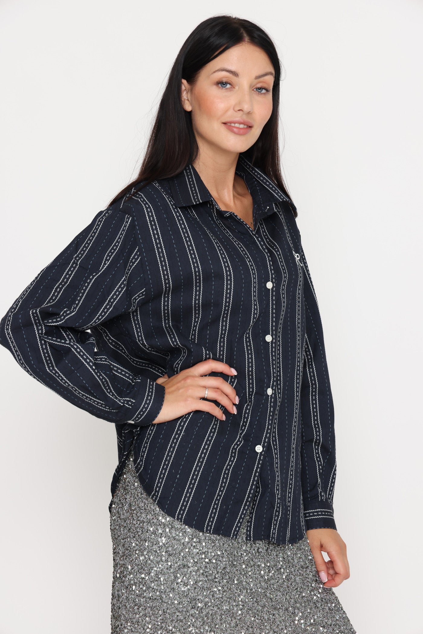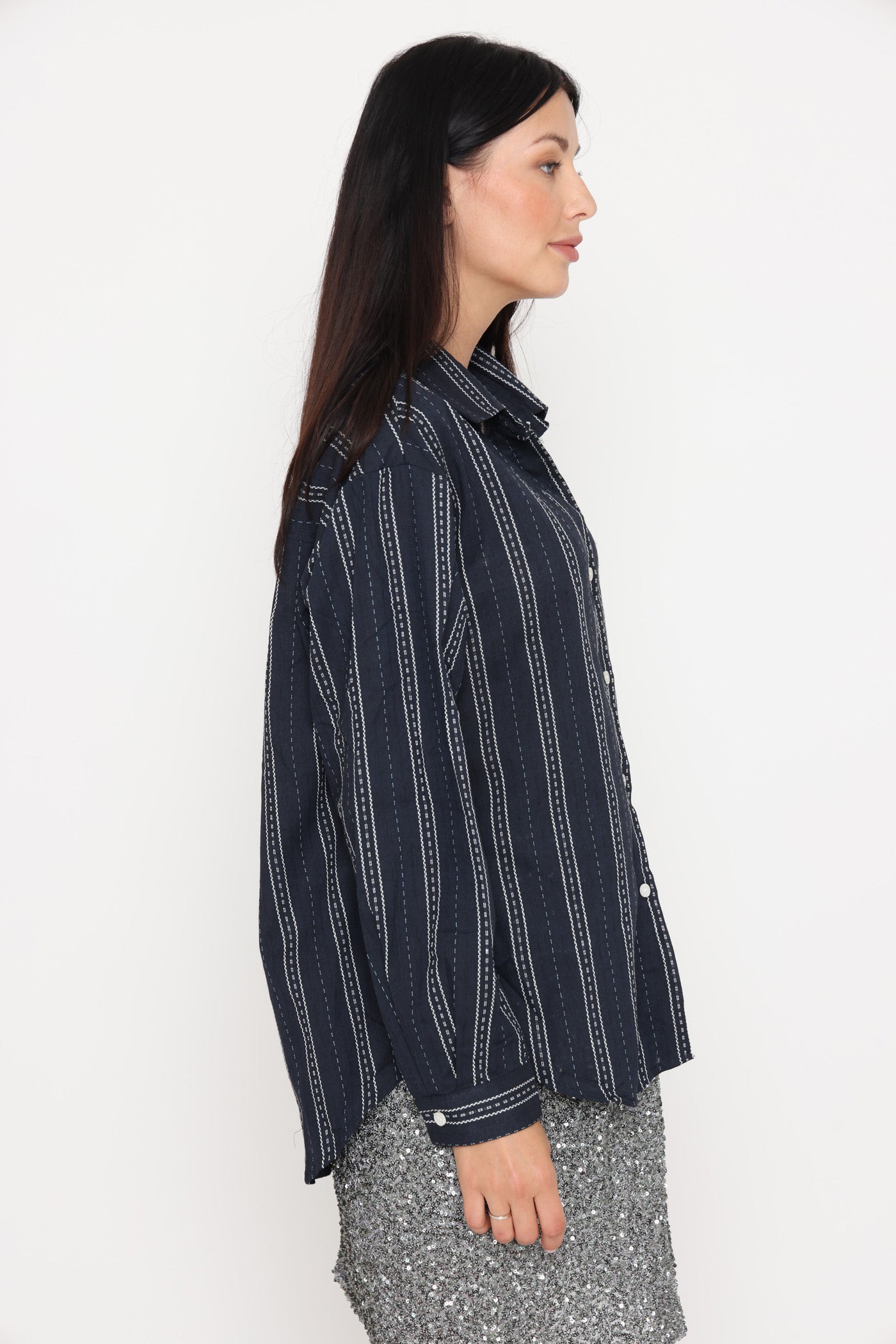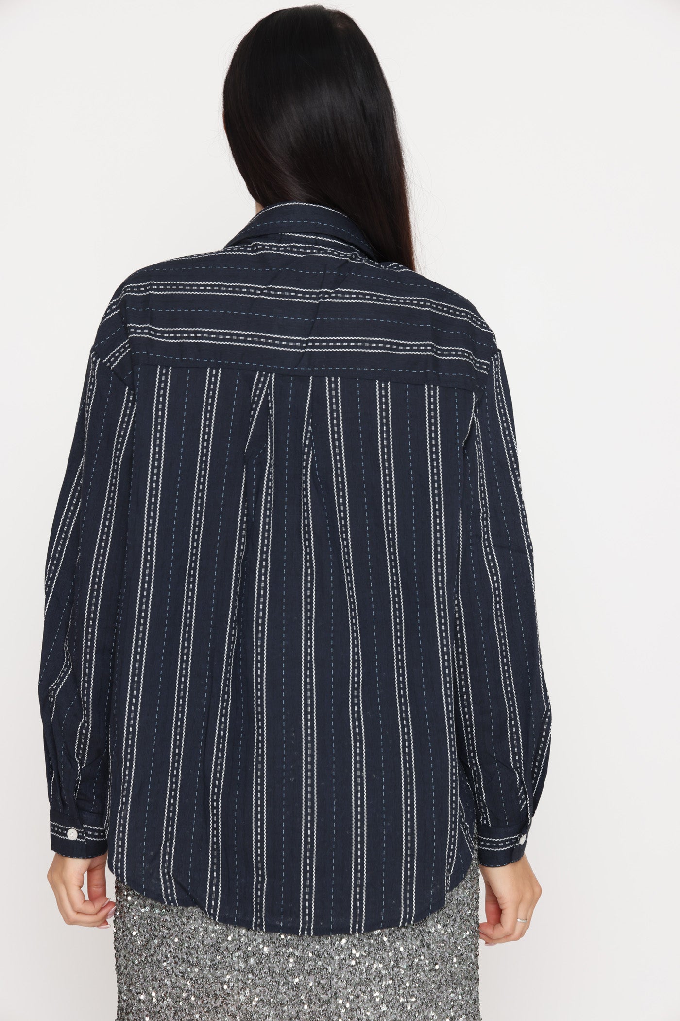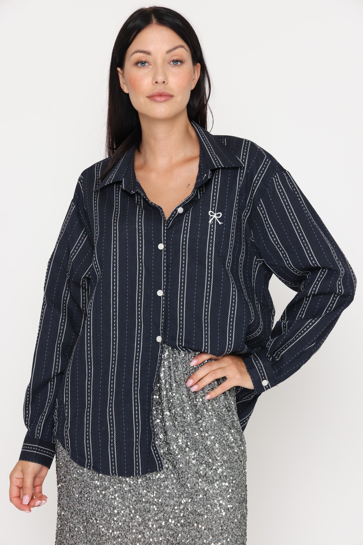 חולצה מכופתרת בגזרה רחבה, בטקסטורת פסים ופפיון קטן.