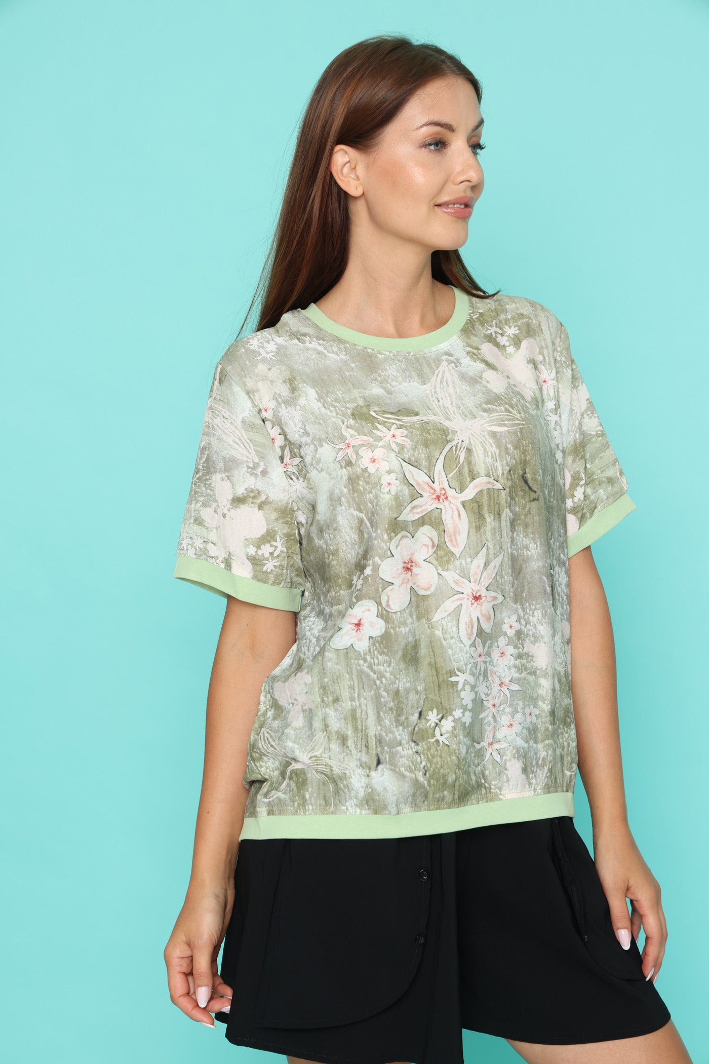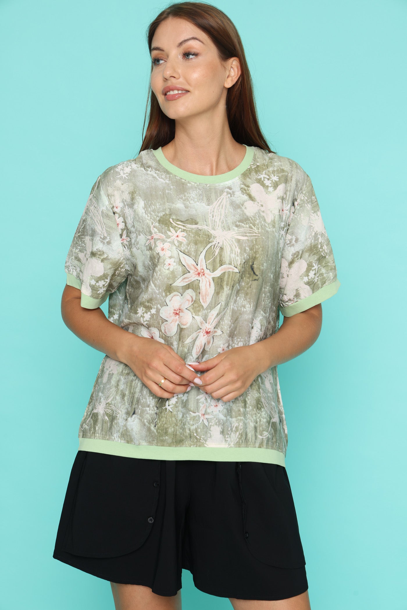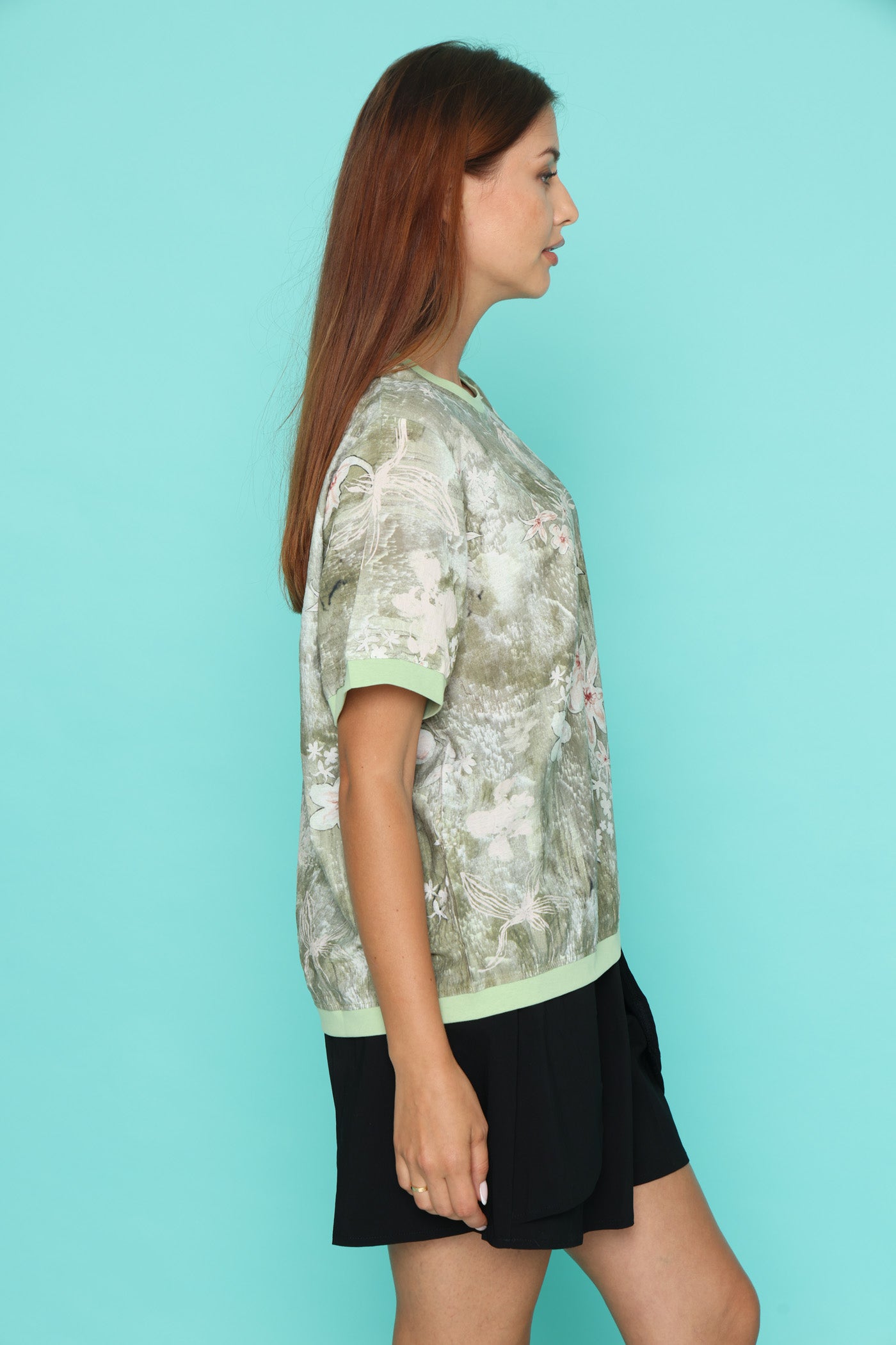 חולצת טי קלילה עם הדפס פרחוני רך על רקע ירוק.