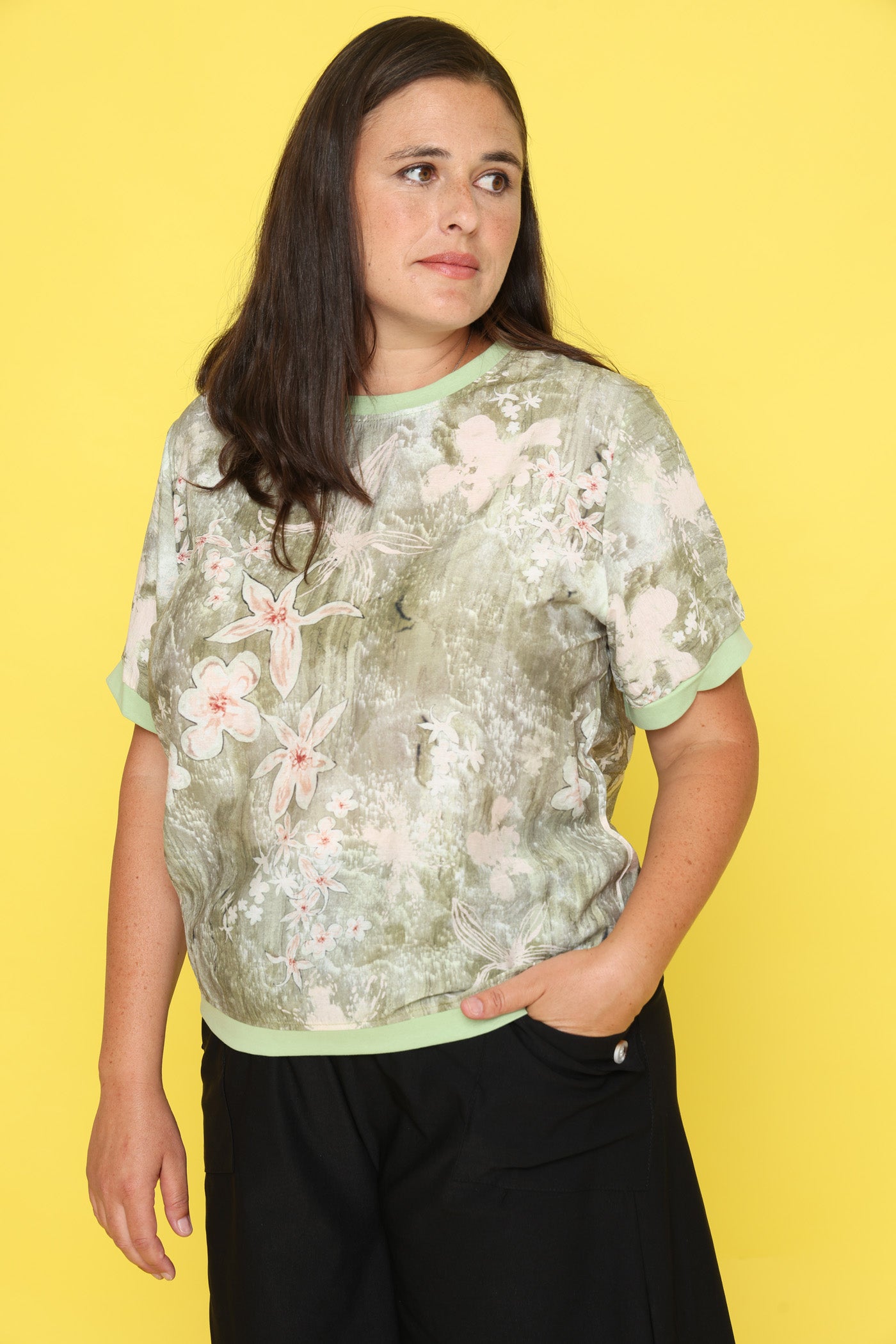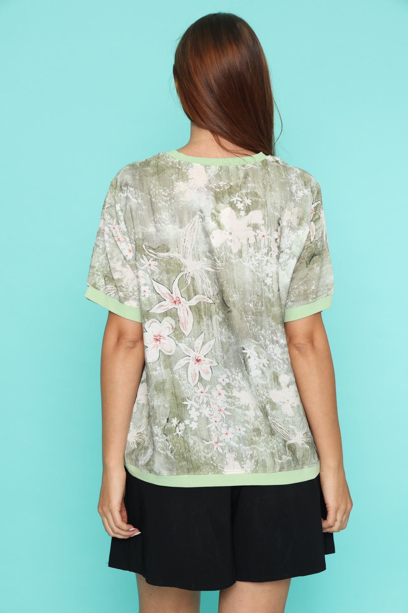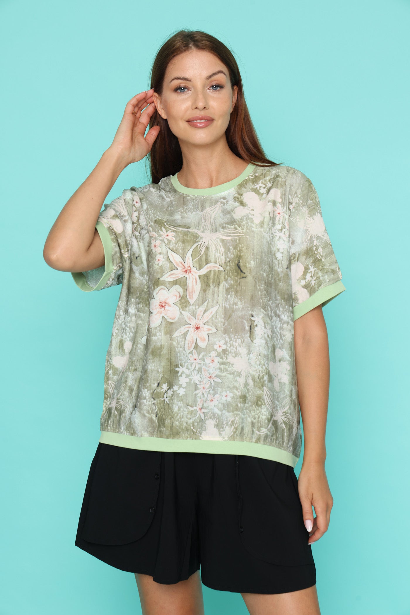 חולצת טי קלילה עם הדפס פרחוני רך על רקע ירוק.