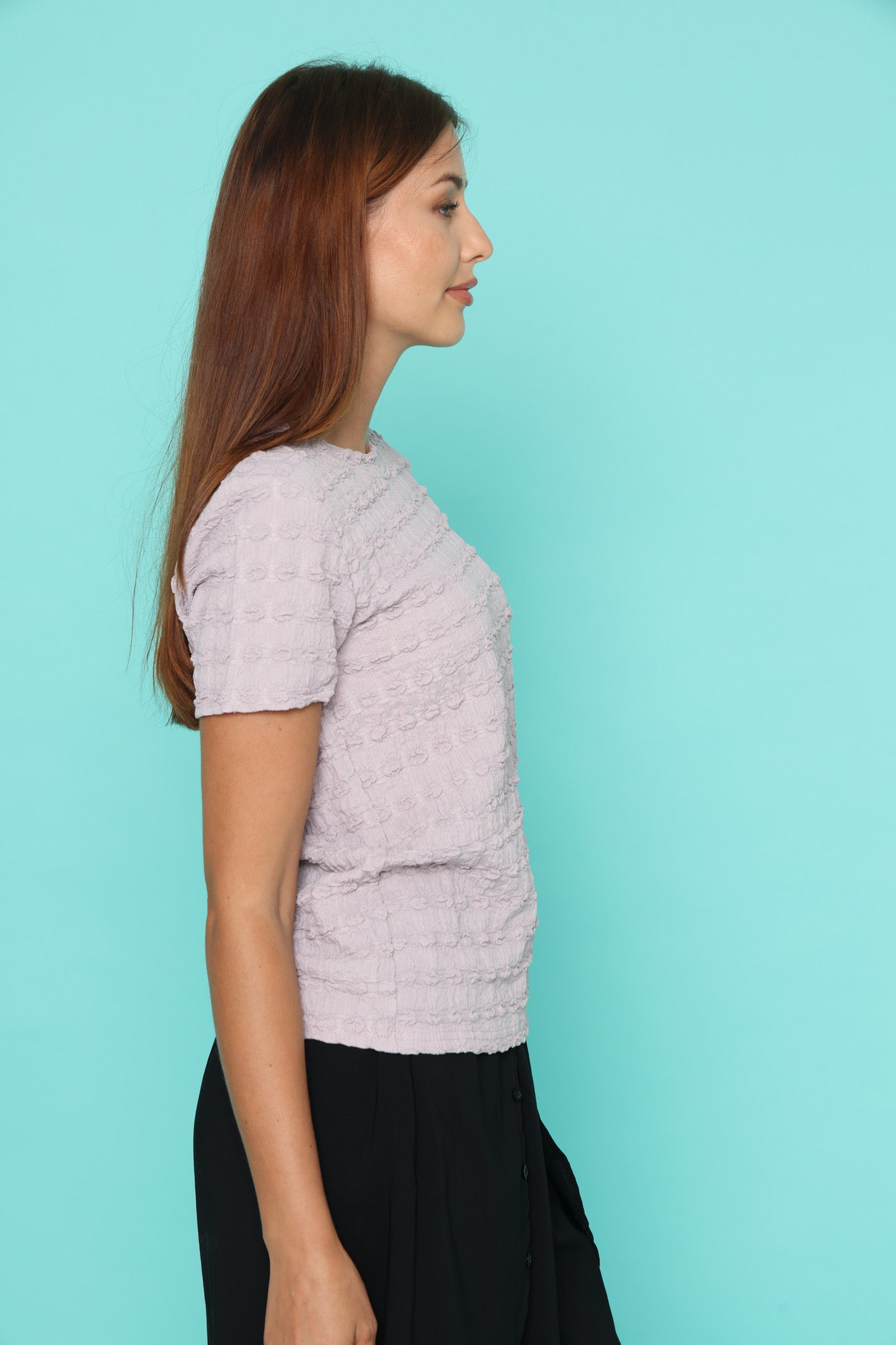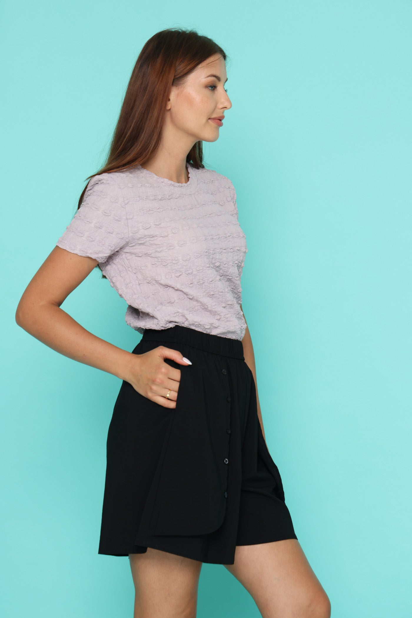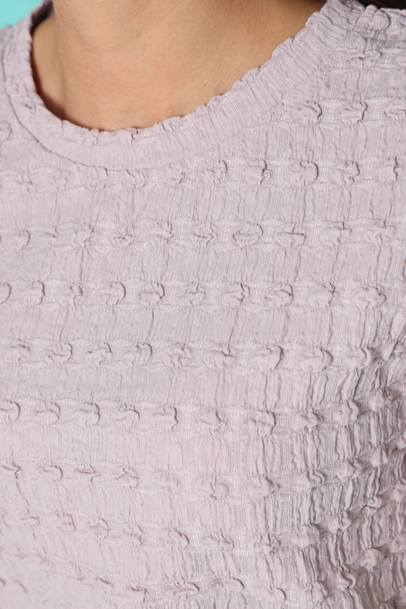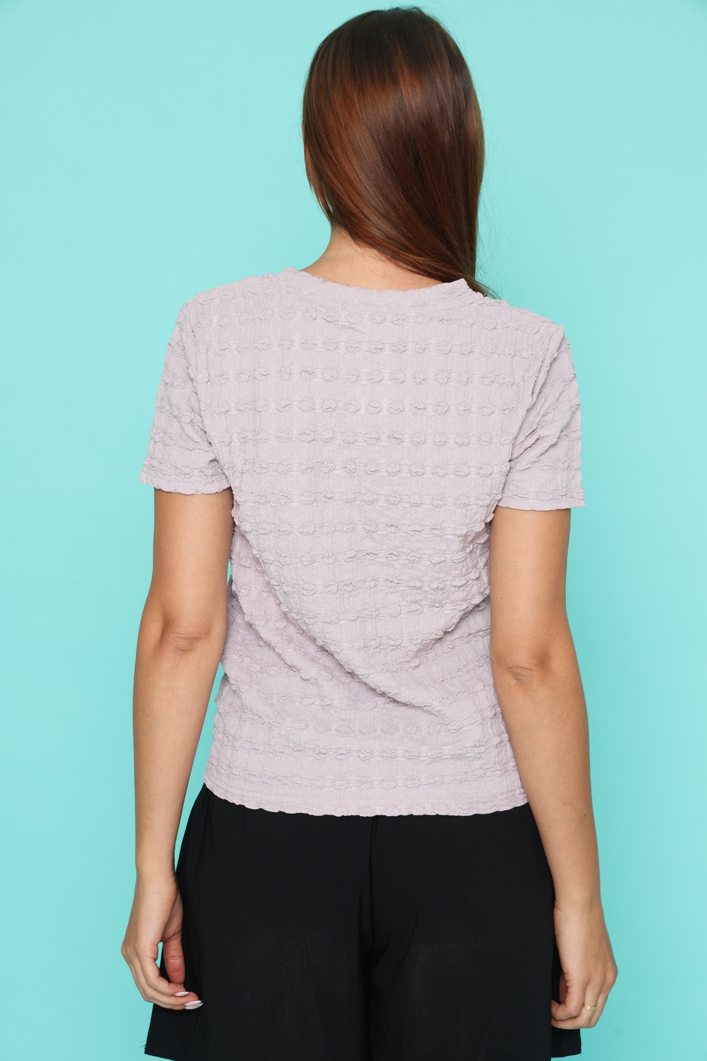 חולצת בייסיק בגוון סגלגל מעושן עם טקסטורה תלת-ממדית עדינה שמוסיפה עניין ותחכום. גזרת טישירט קלאסית עם שרוול קצר וצווארון עגול, עשויה מבד נעים שמרגיש טוב על הגוף ויושב מושלם גם בתוך מכנסיים וגם בחוץ.
