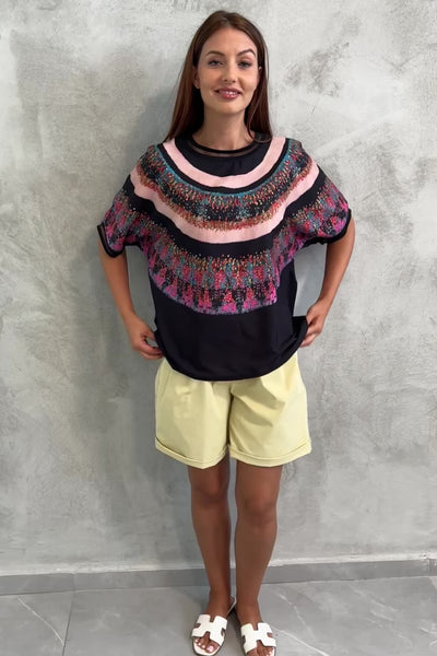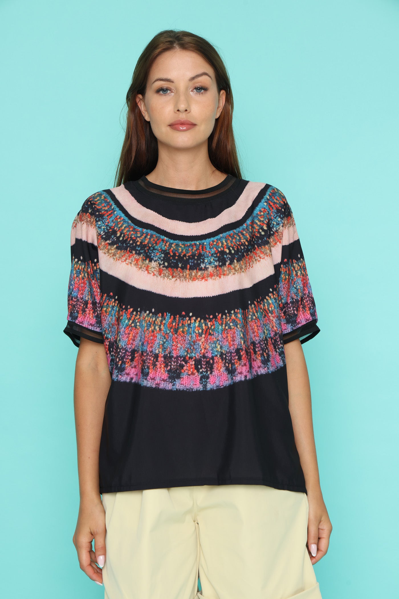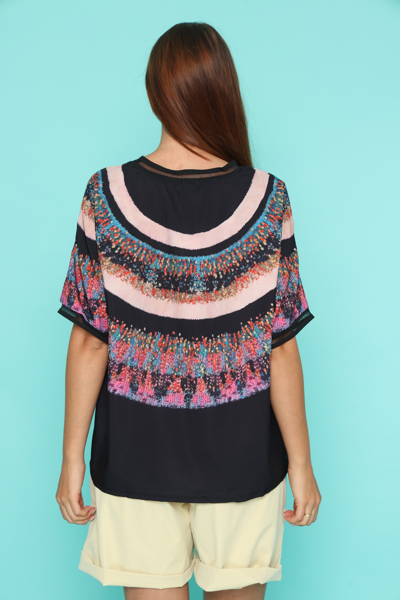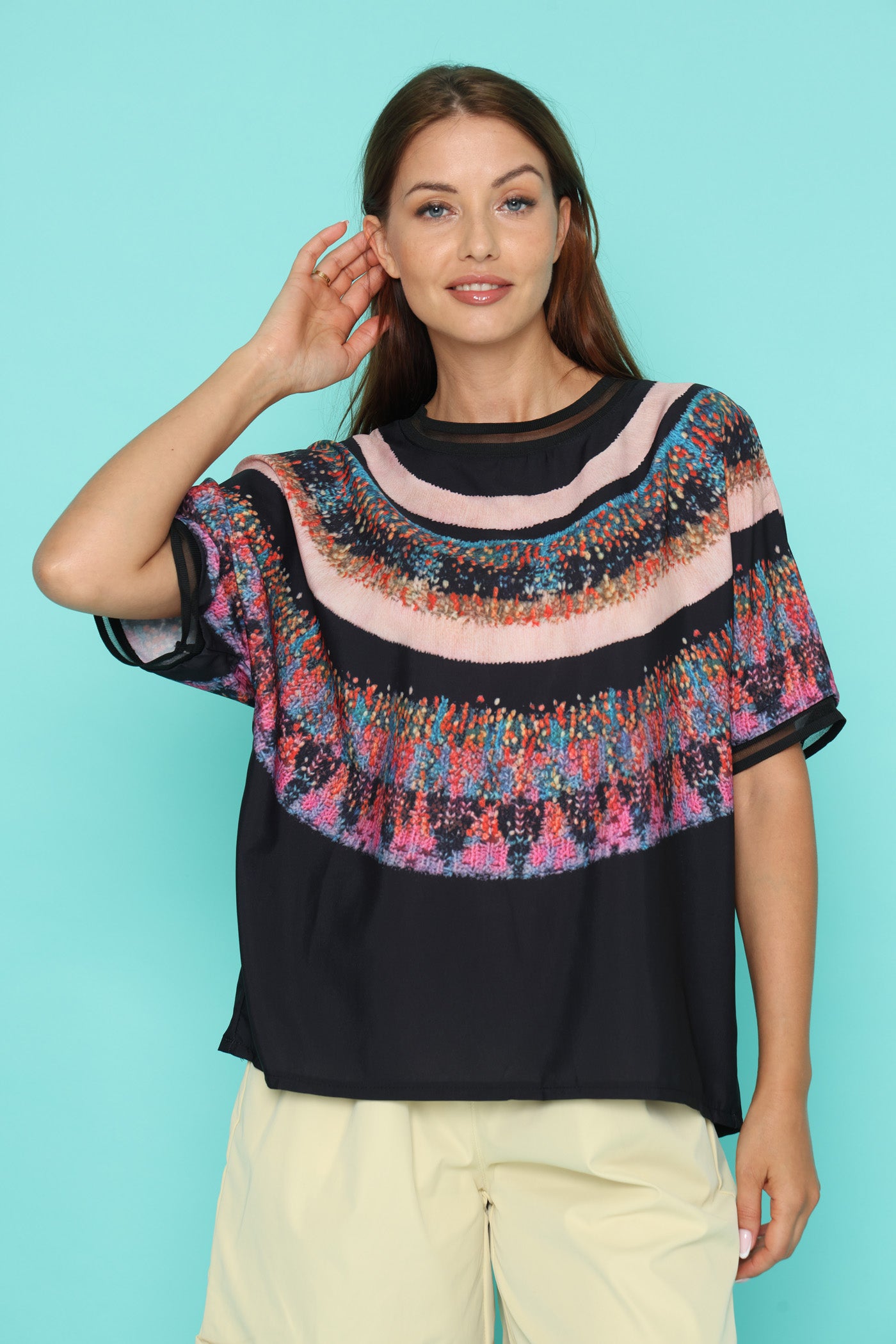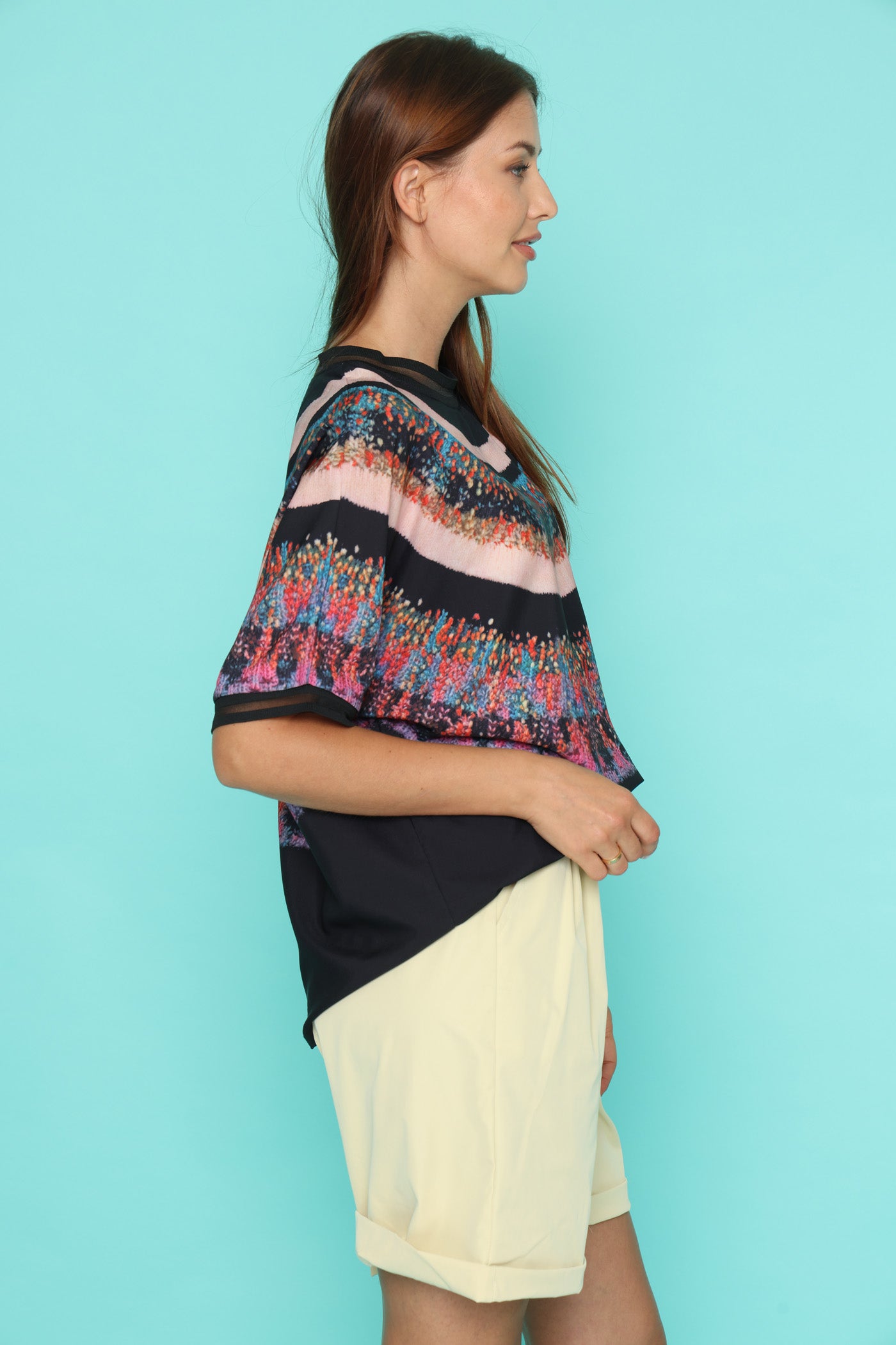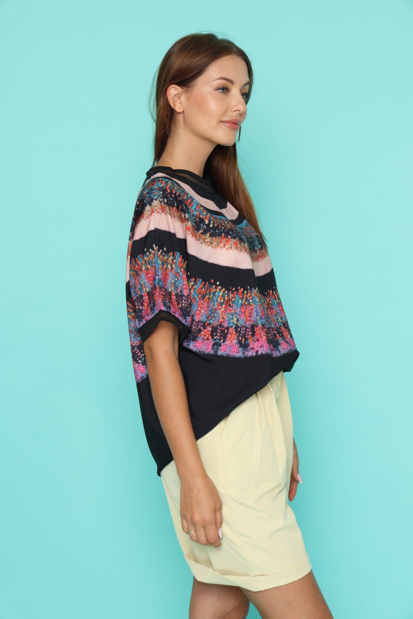 חולצה בגזרה רחבה, בד רך שמזכיר קצת סאטן אך אינו מבריק, עם הדפס צבעוני בחלק העליון.