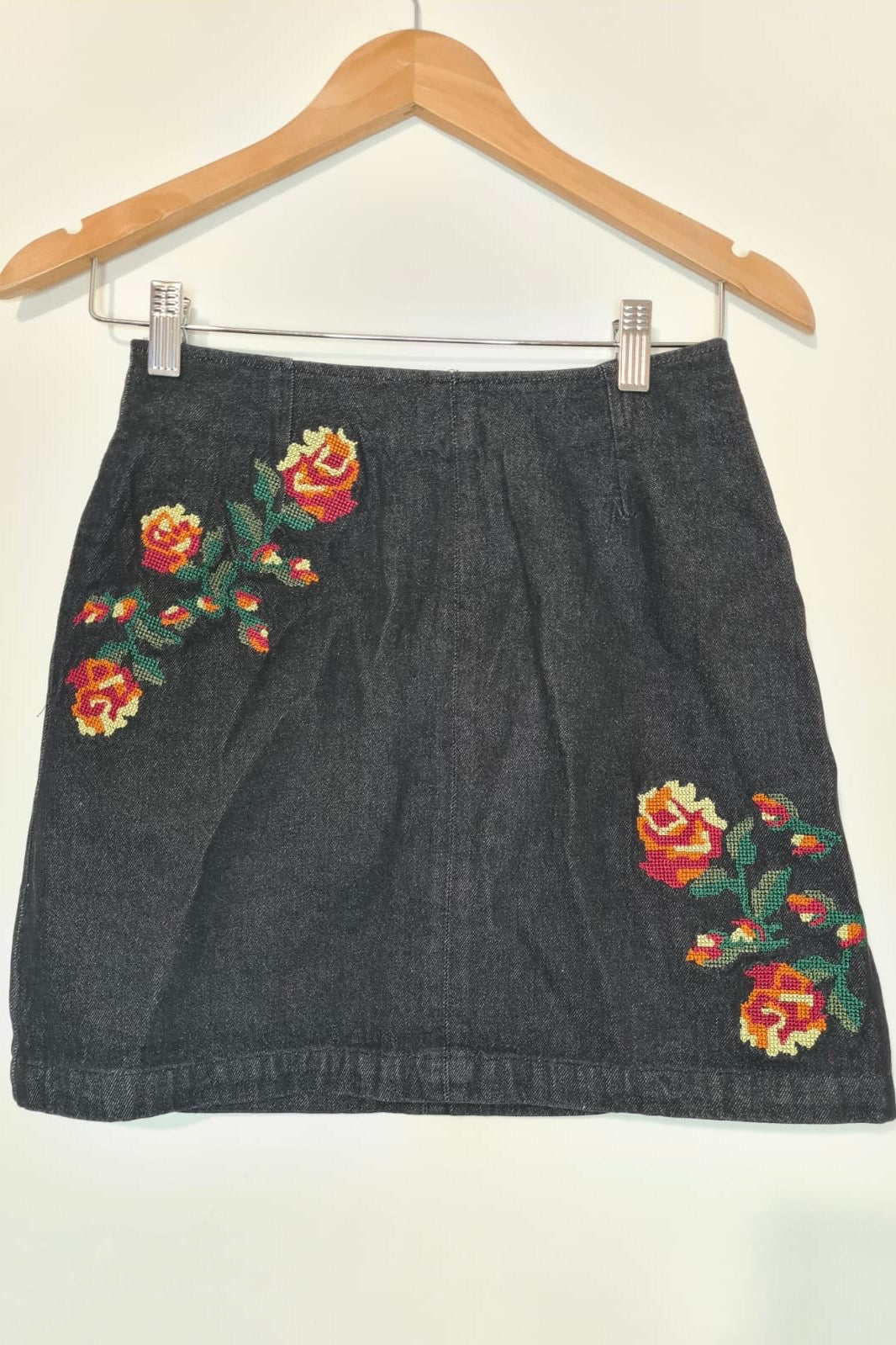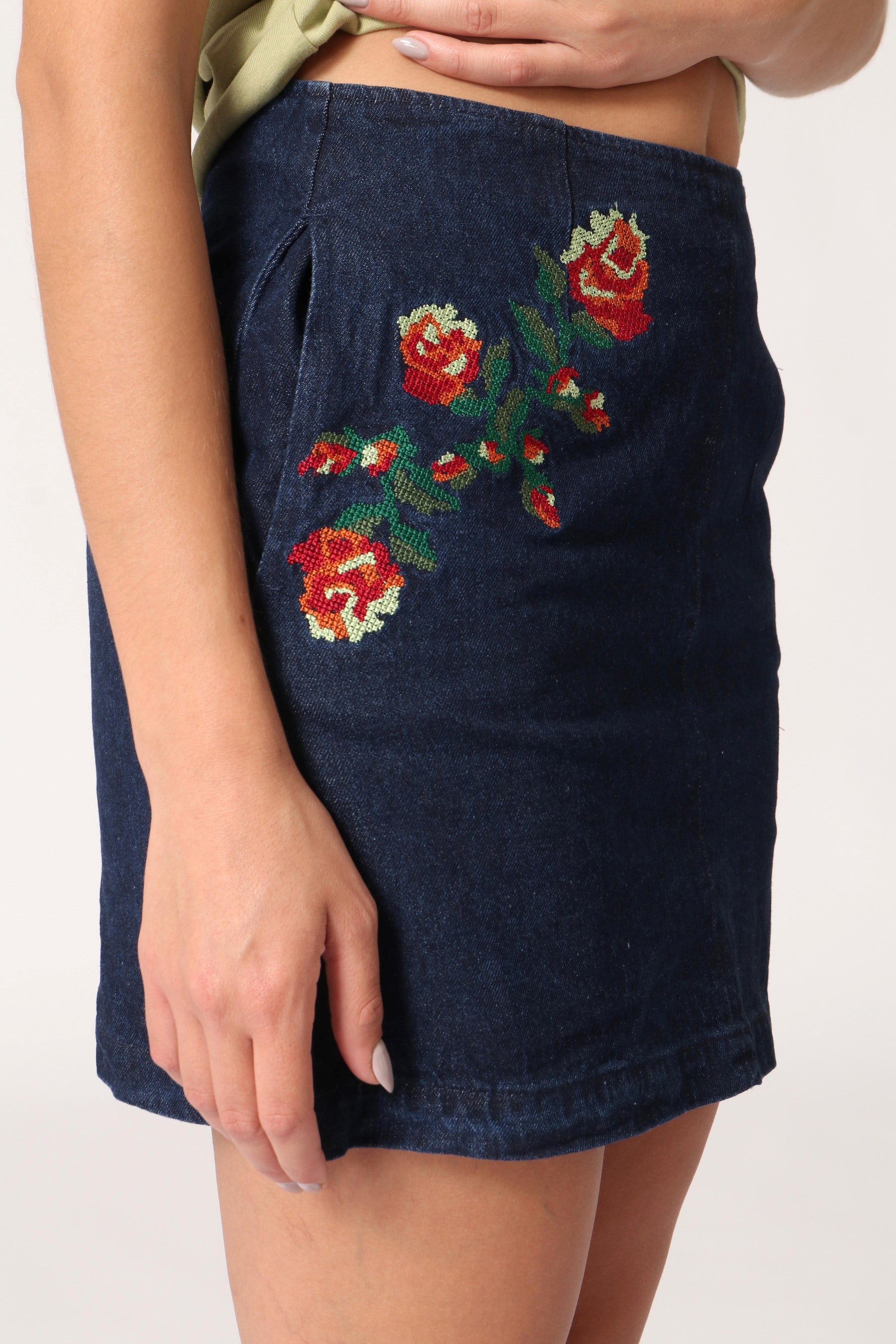 חצאית ג'ינס בגזרה ישרה, עם רקמות פרחים בשילוב כיסים ורוכסן אחורי