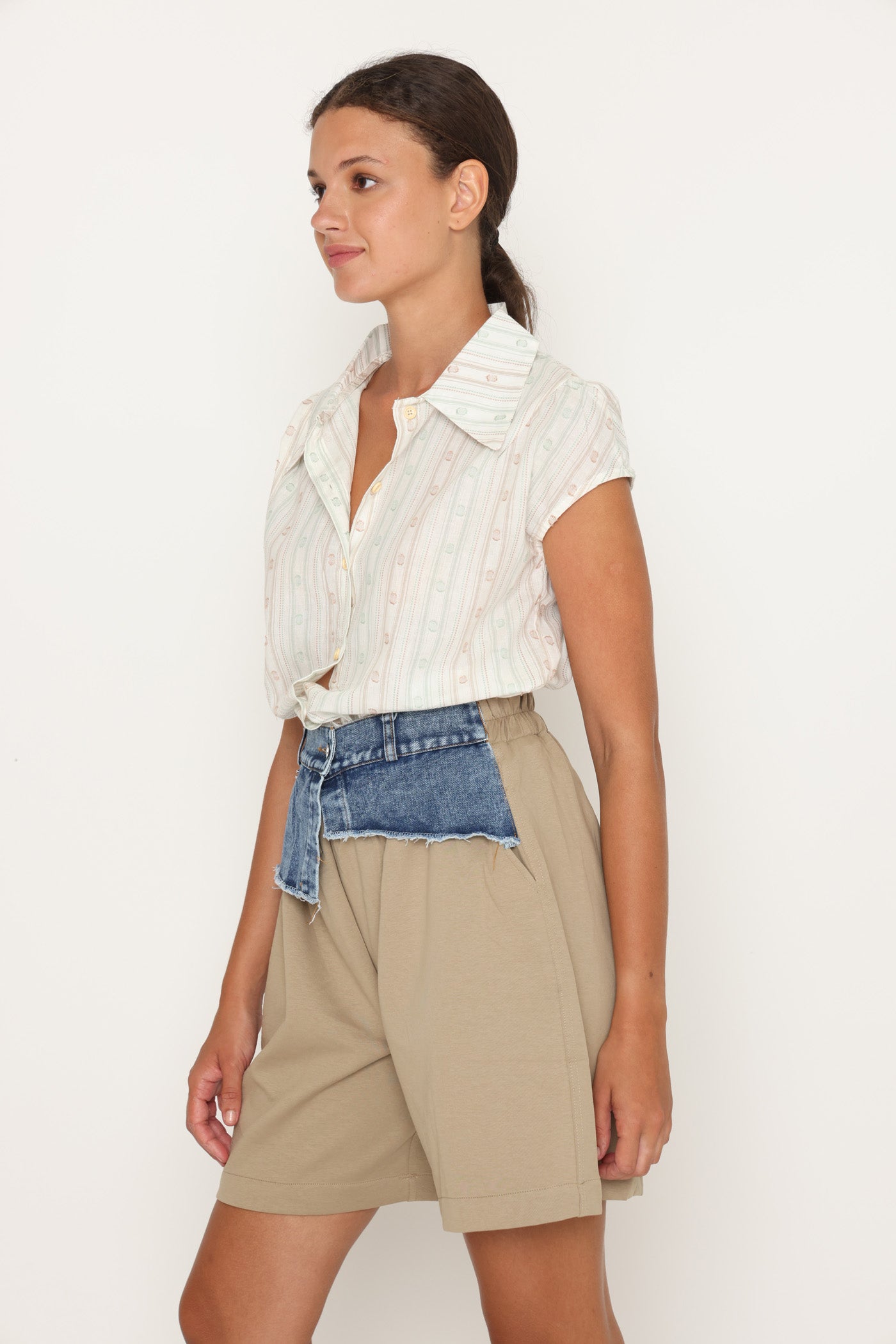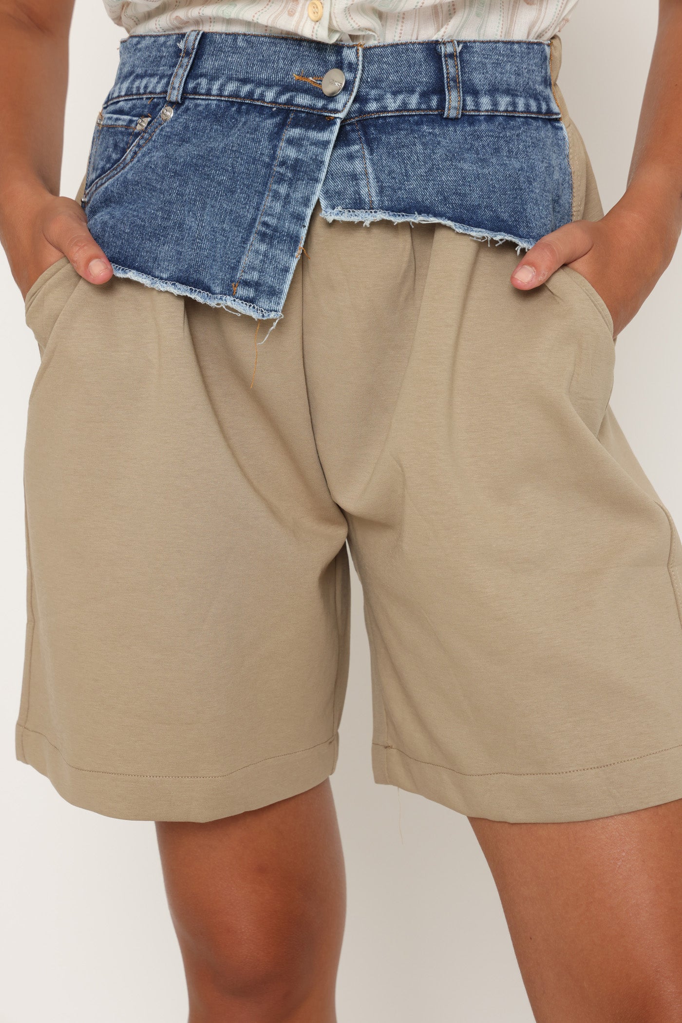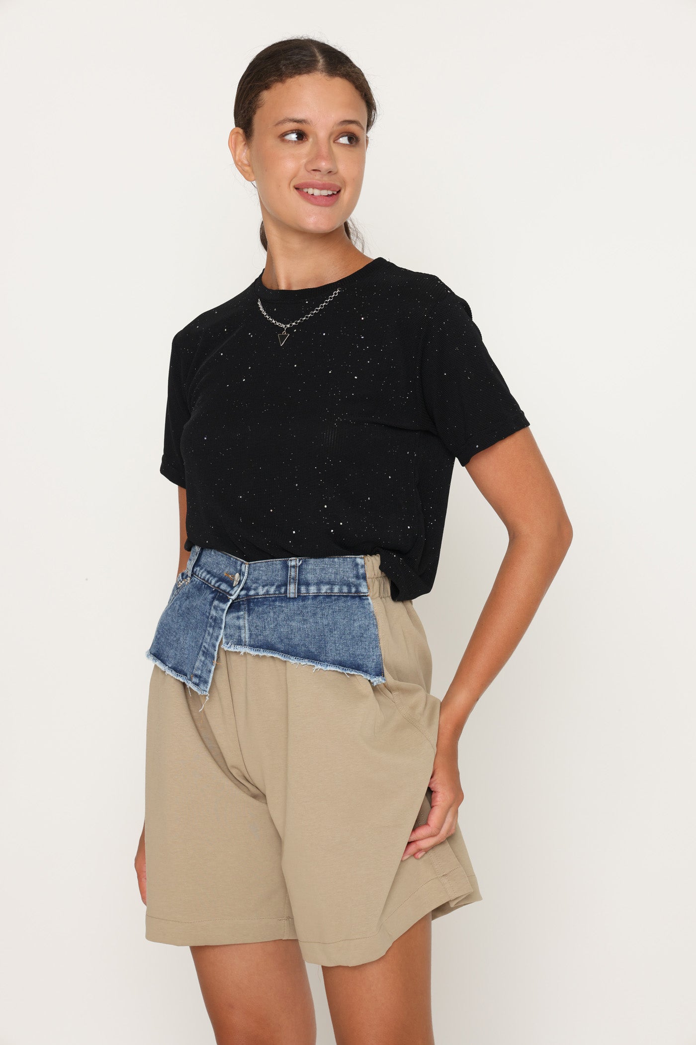 מכנסיים קצרים, בגזרה רחבה, בשילוב ג'ינס, גומי במותניים וכיסים צדיים.