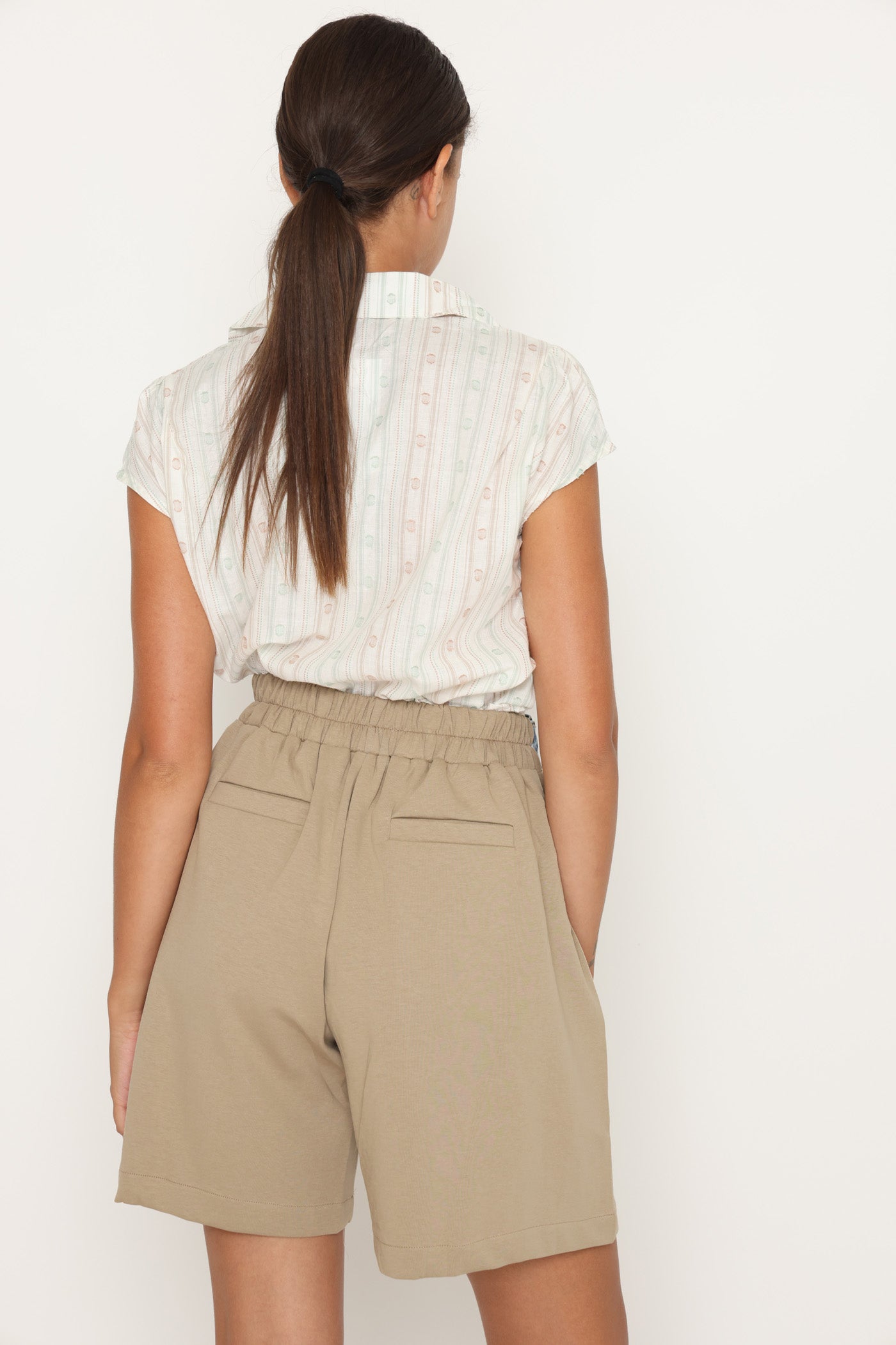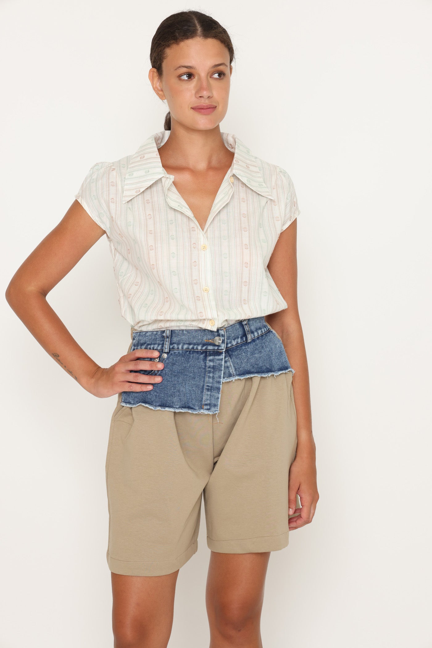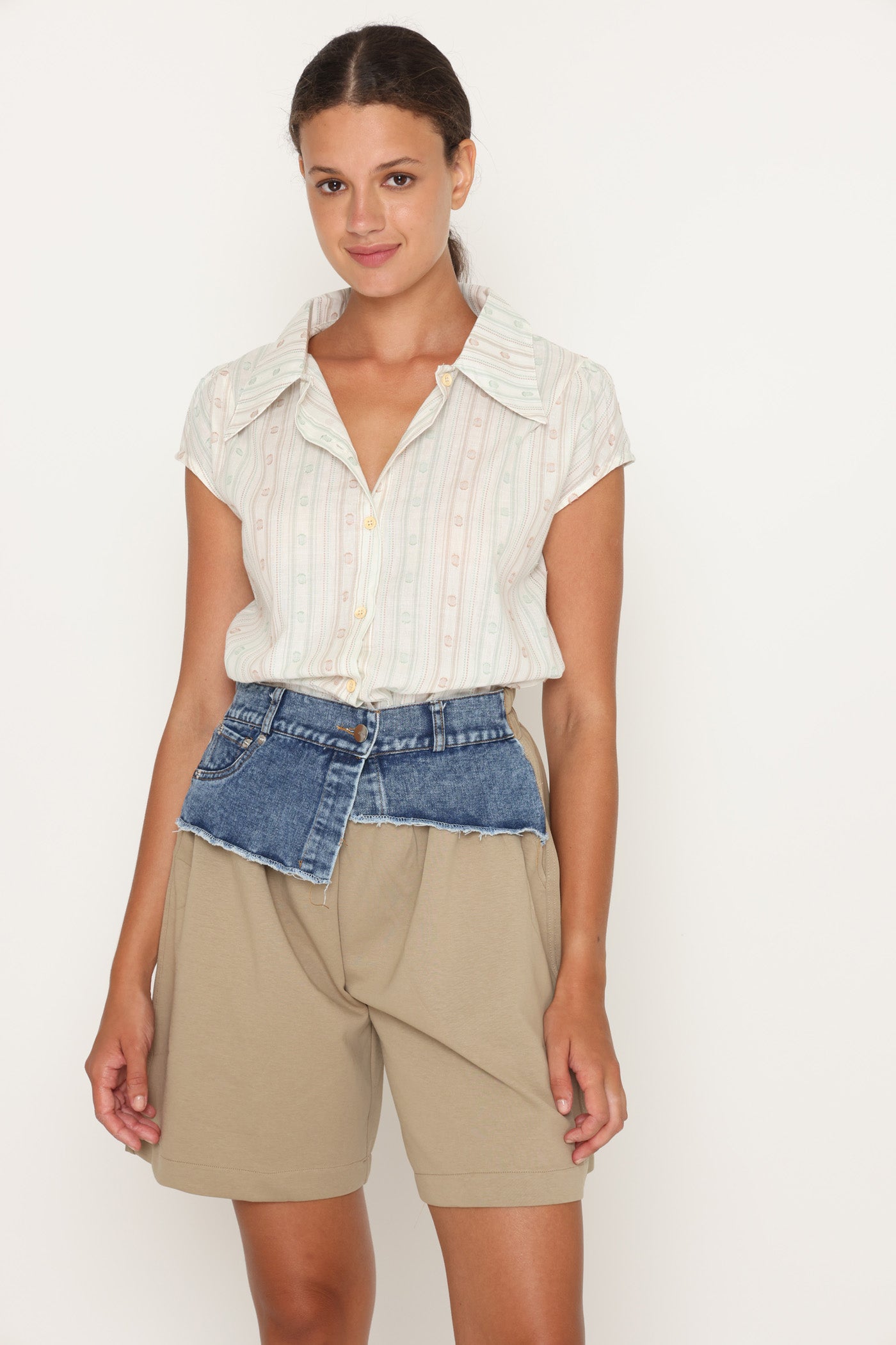 מכנסיים קצרים, בגזרה רחבה, בשילוב ג'ינס, גומי במותניים וכיסים צדיים.