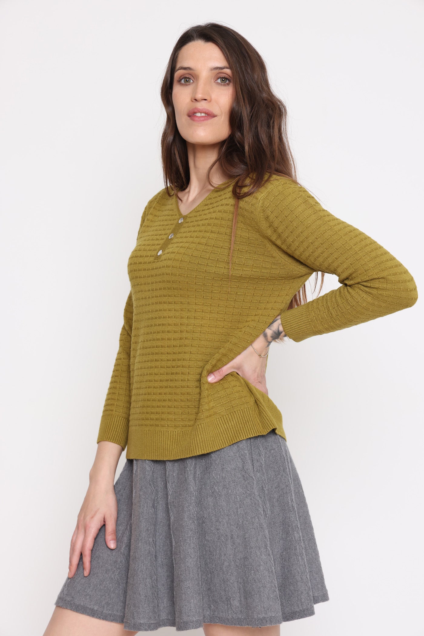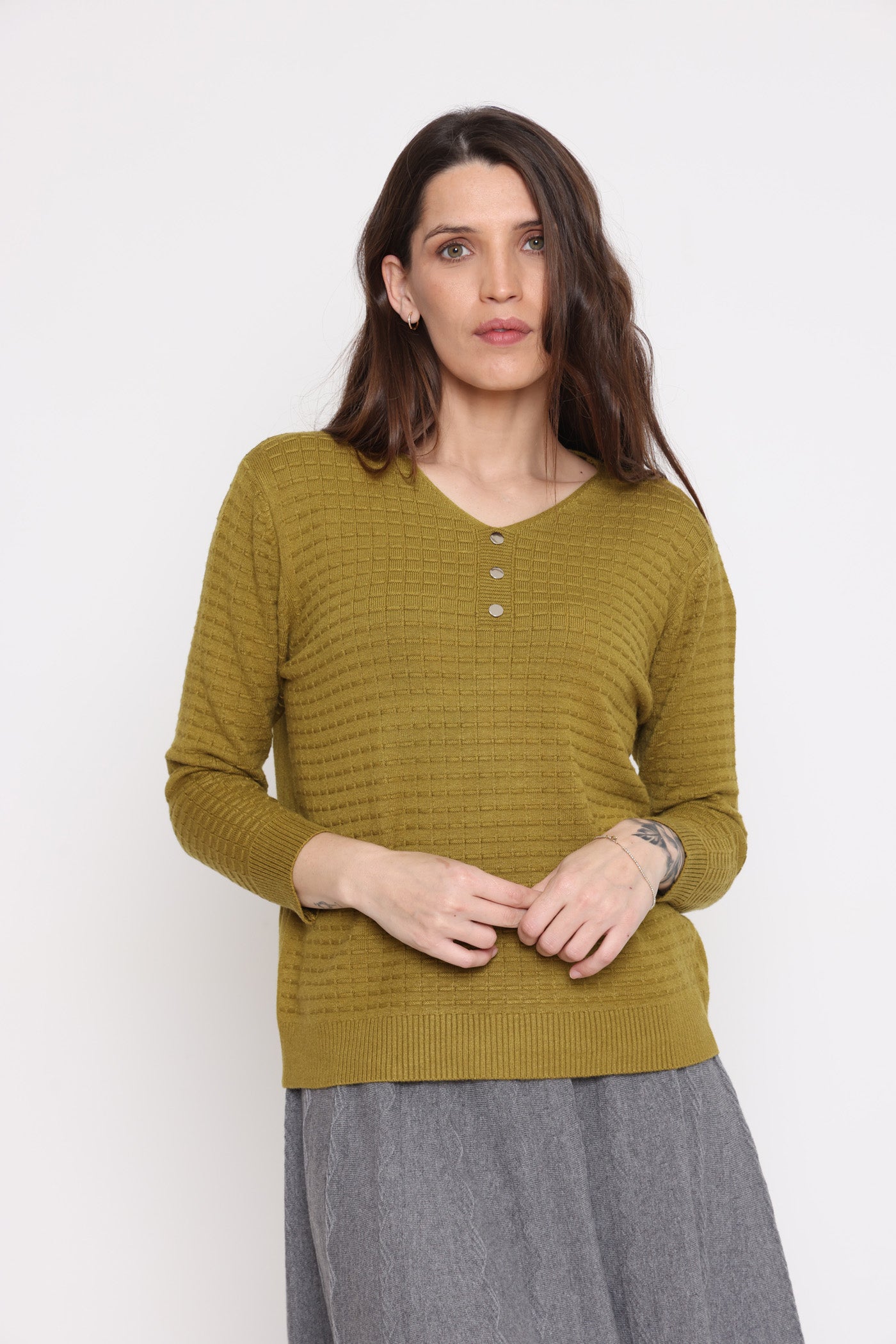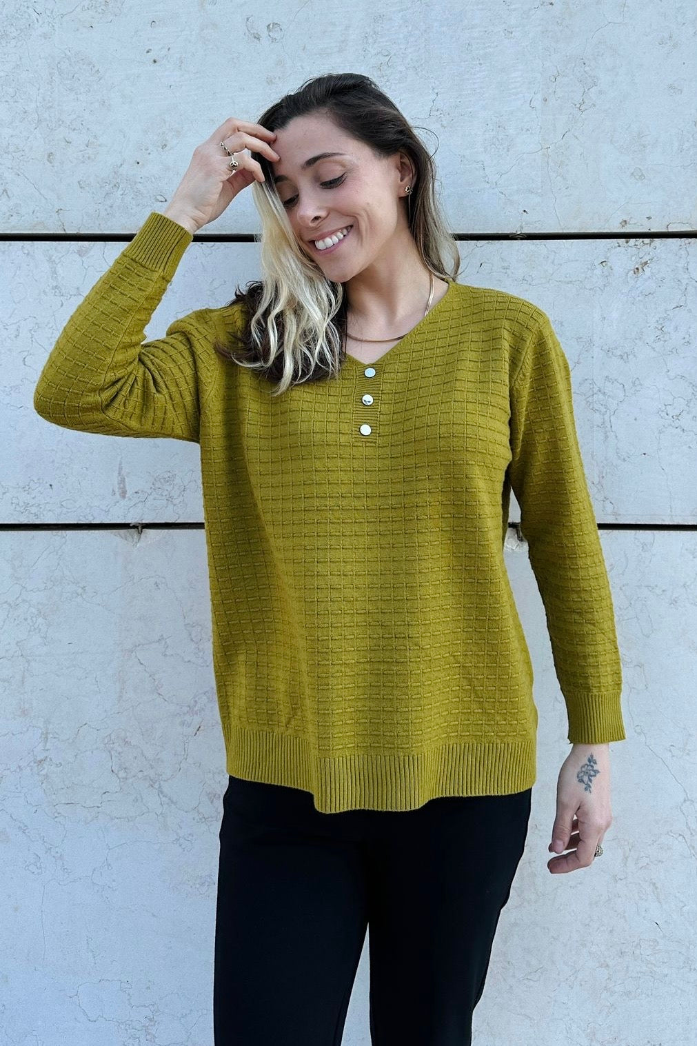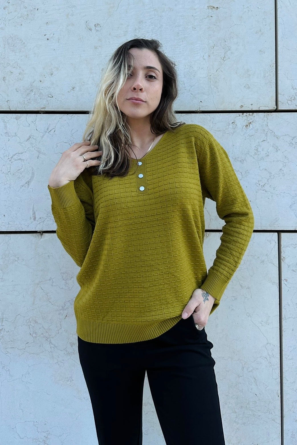 סריג נעים ומחמם בגזרה ישרה, בשילוב כפתורים בצווארון.