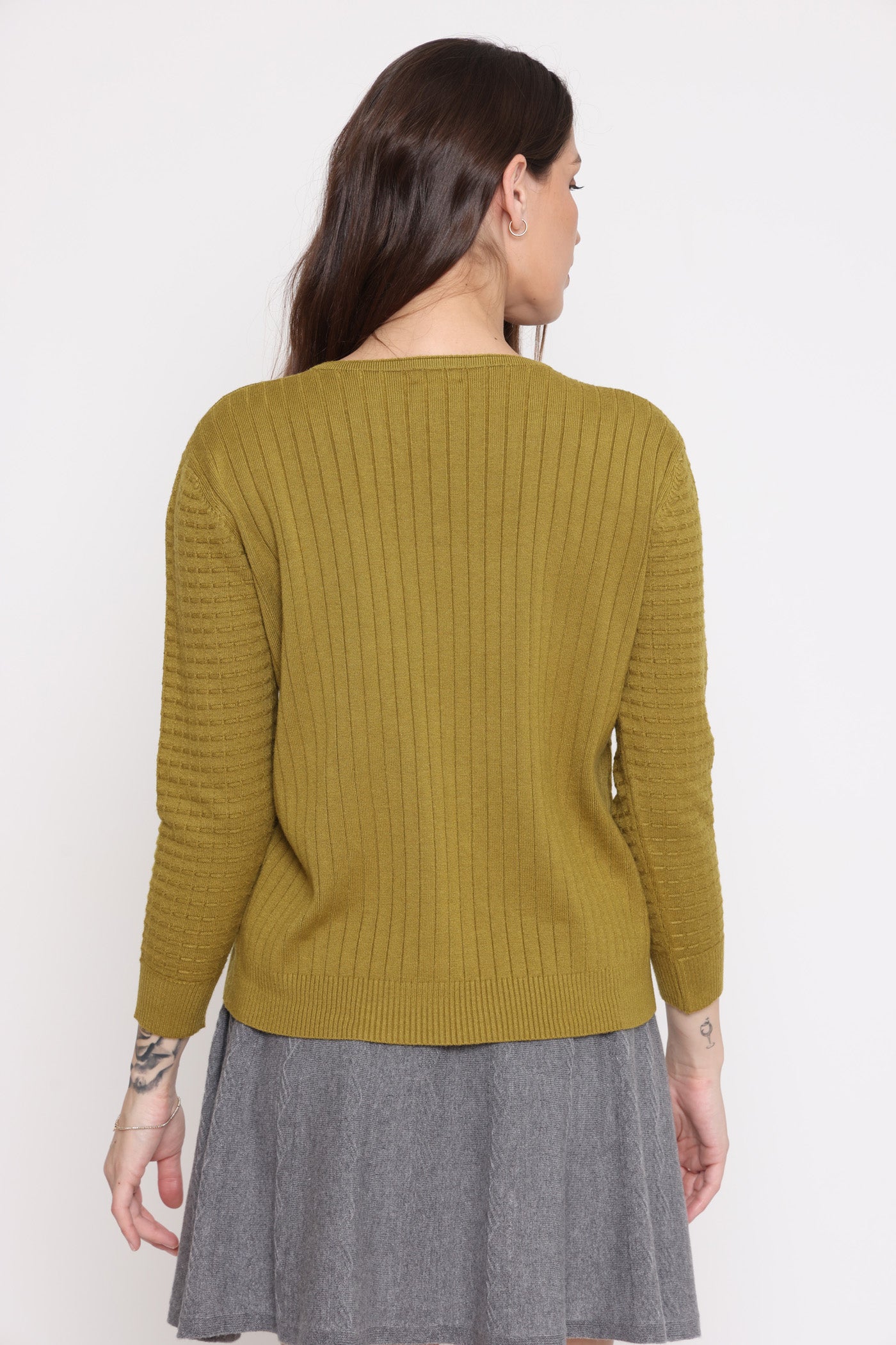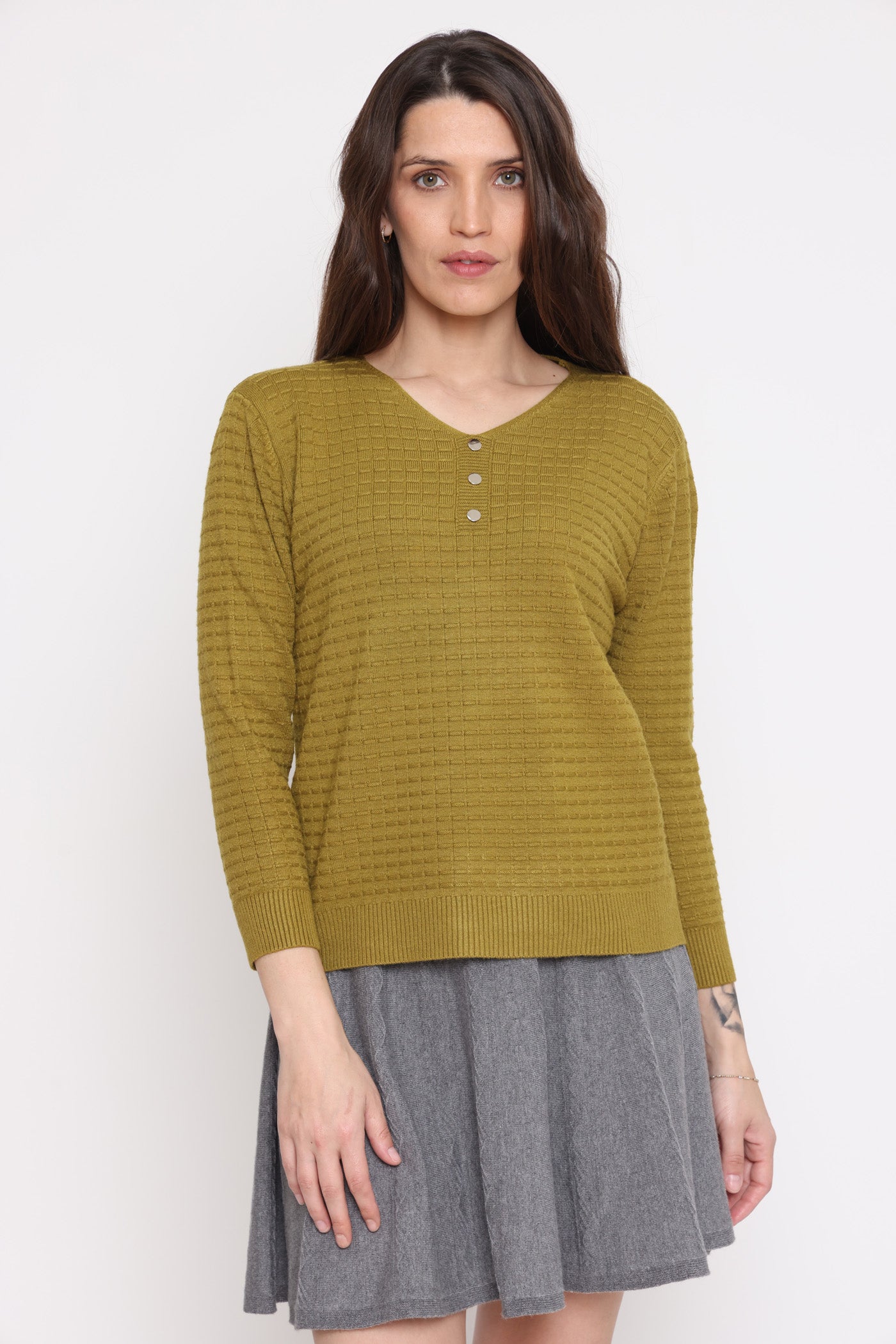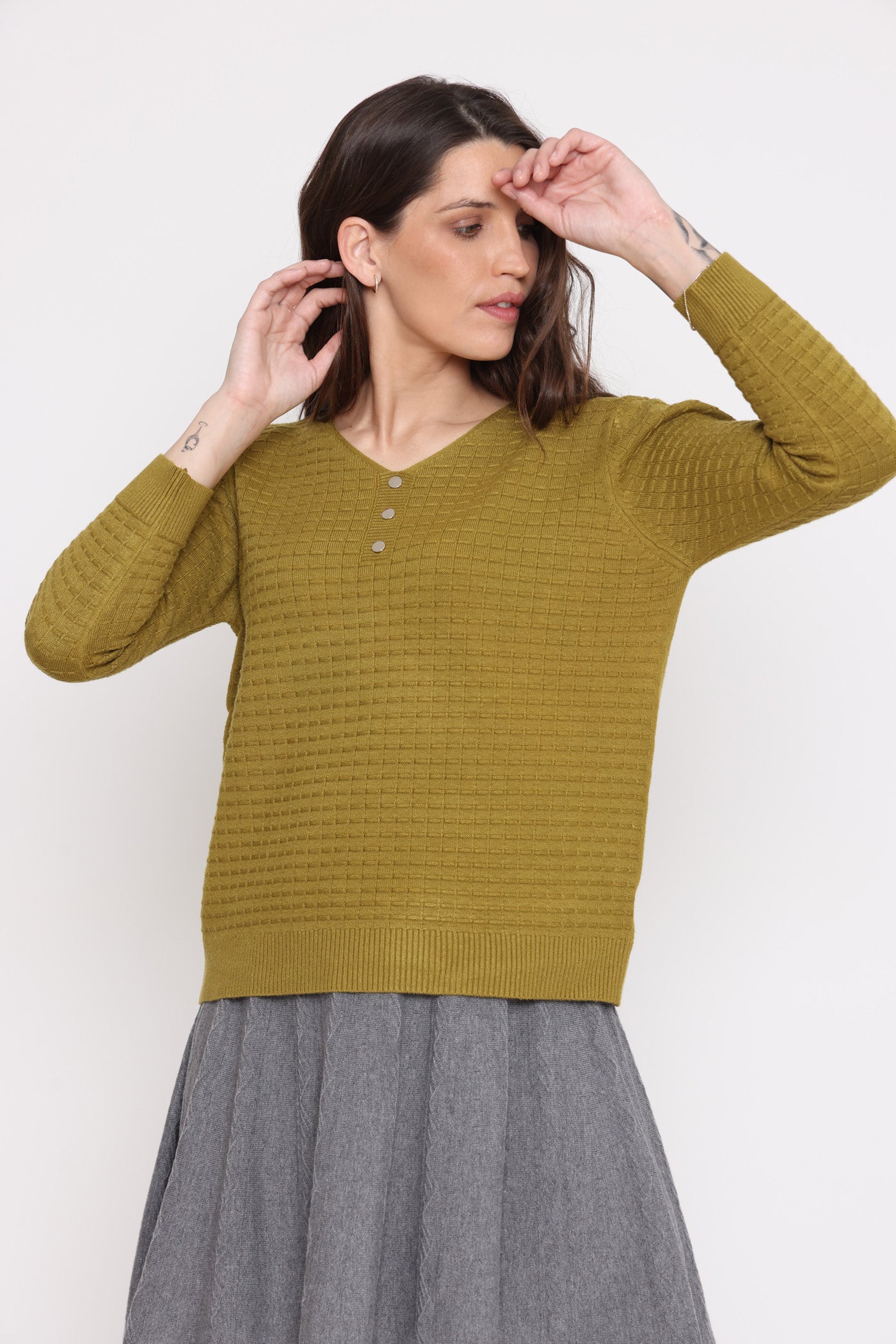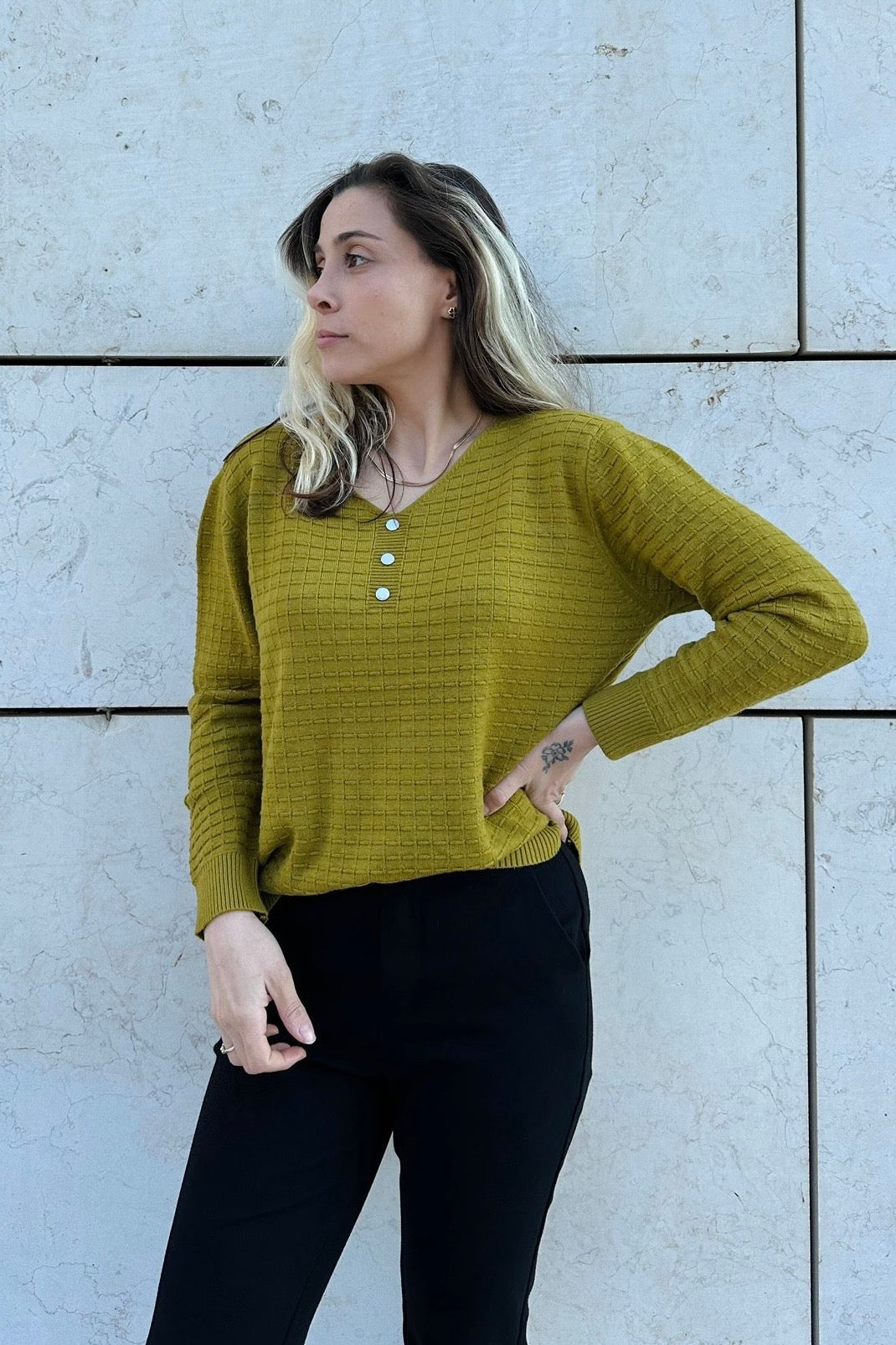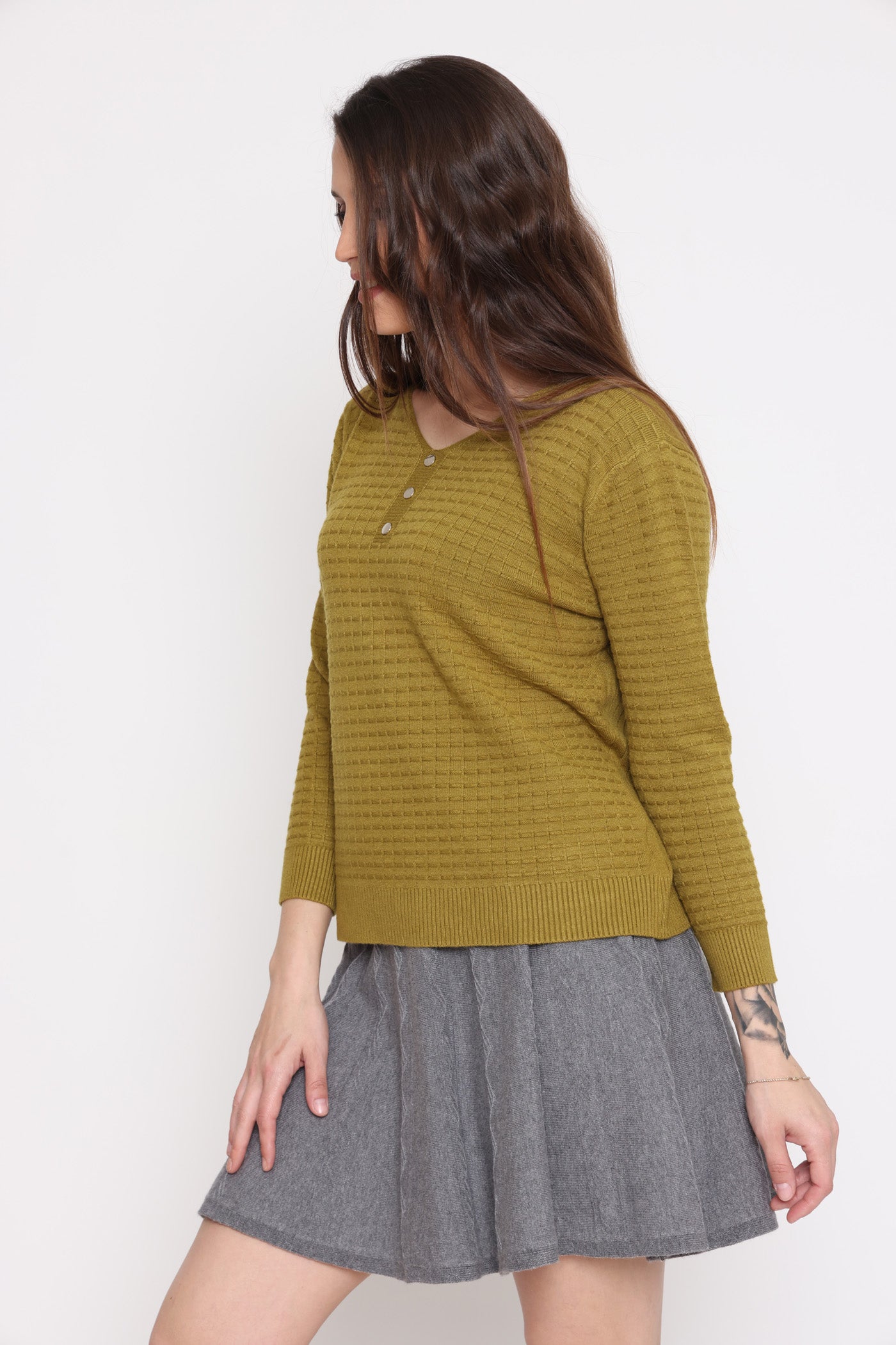 סריג נעים ומחמם בגזרה ישרה, בשילוב כפתורים בצווארון.