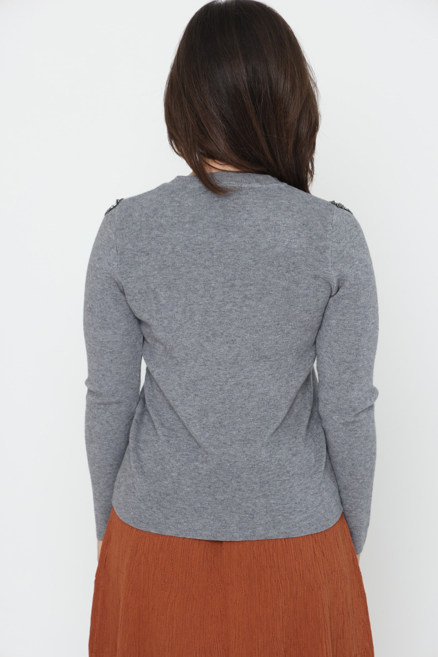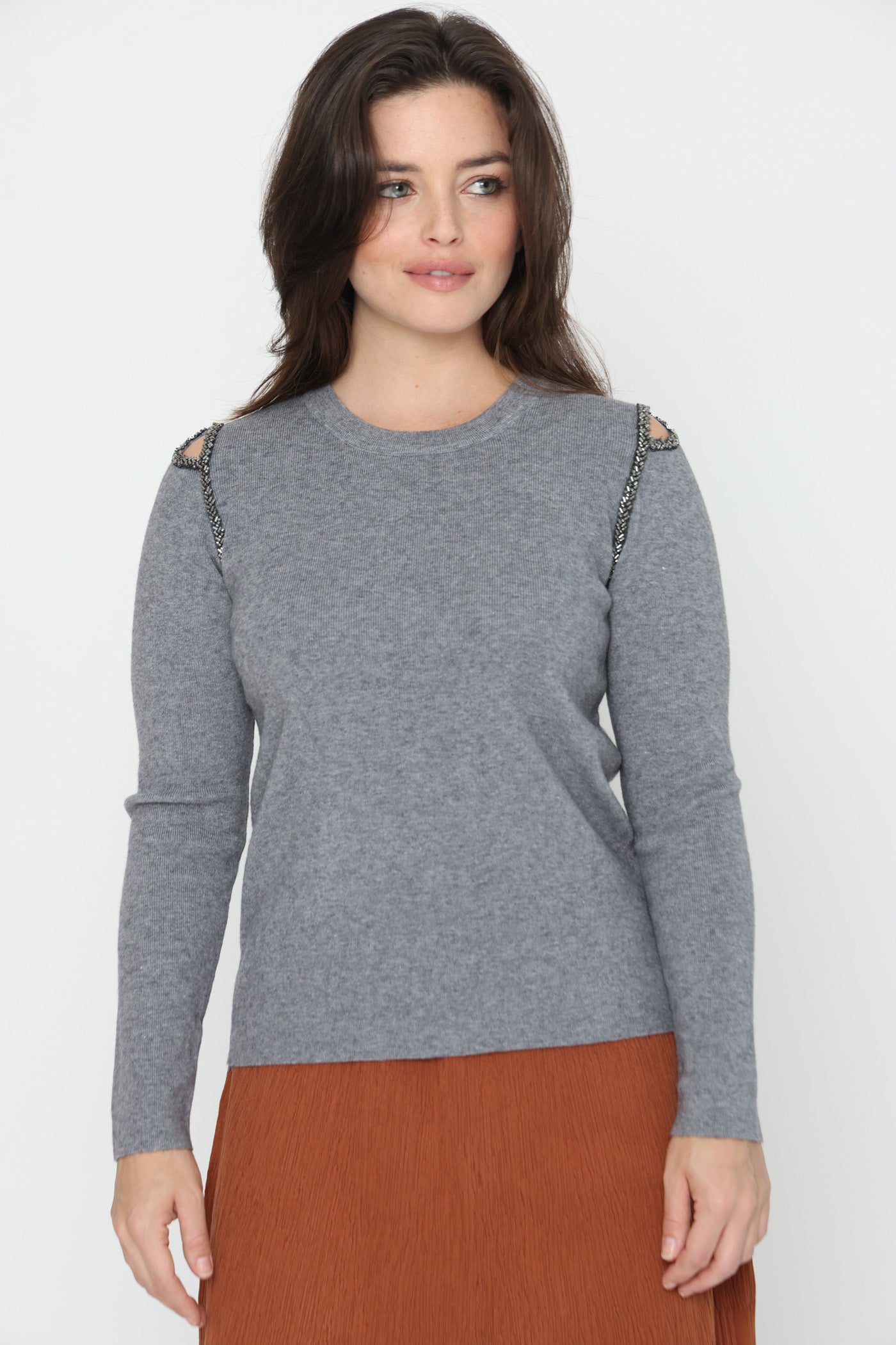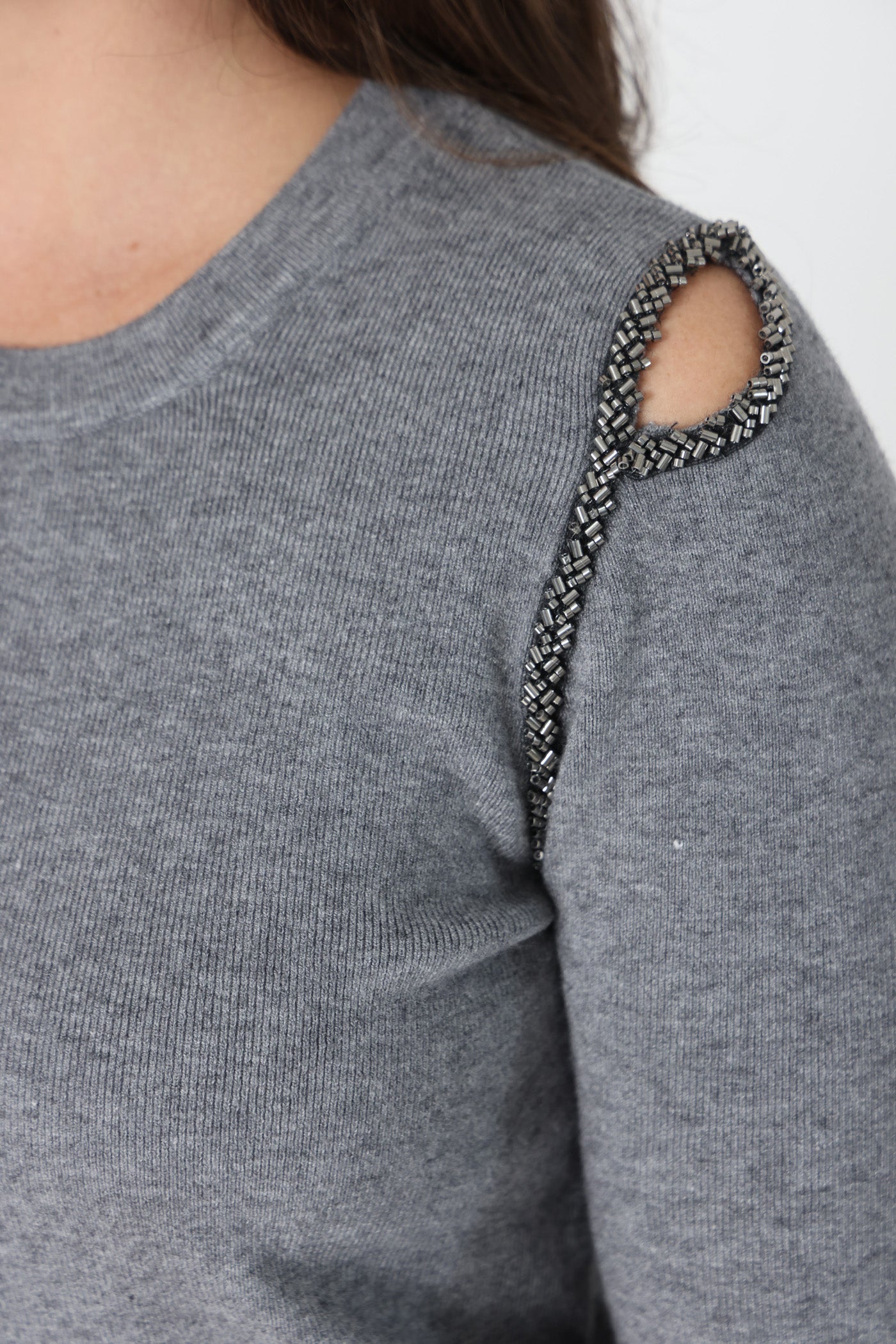 סריג דק ונעים בגזרה צמודה, אלסטי, בשילוב חרוזים ופתחים בכתפיים.