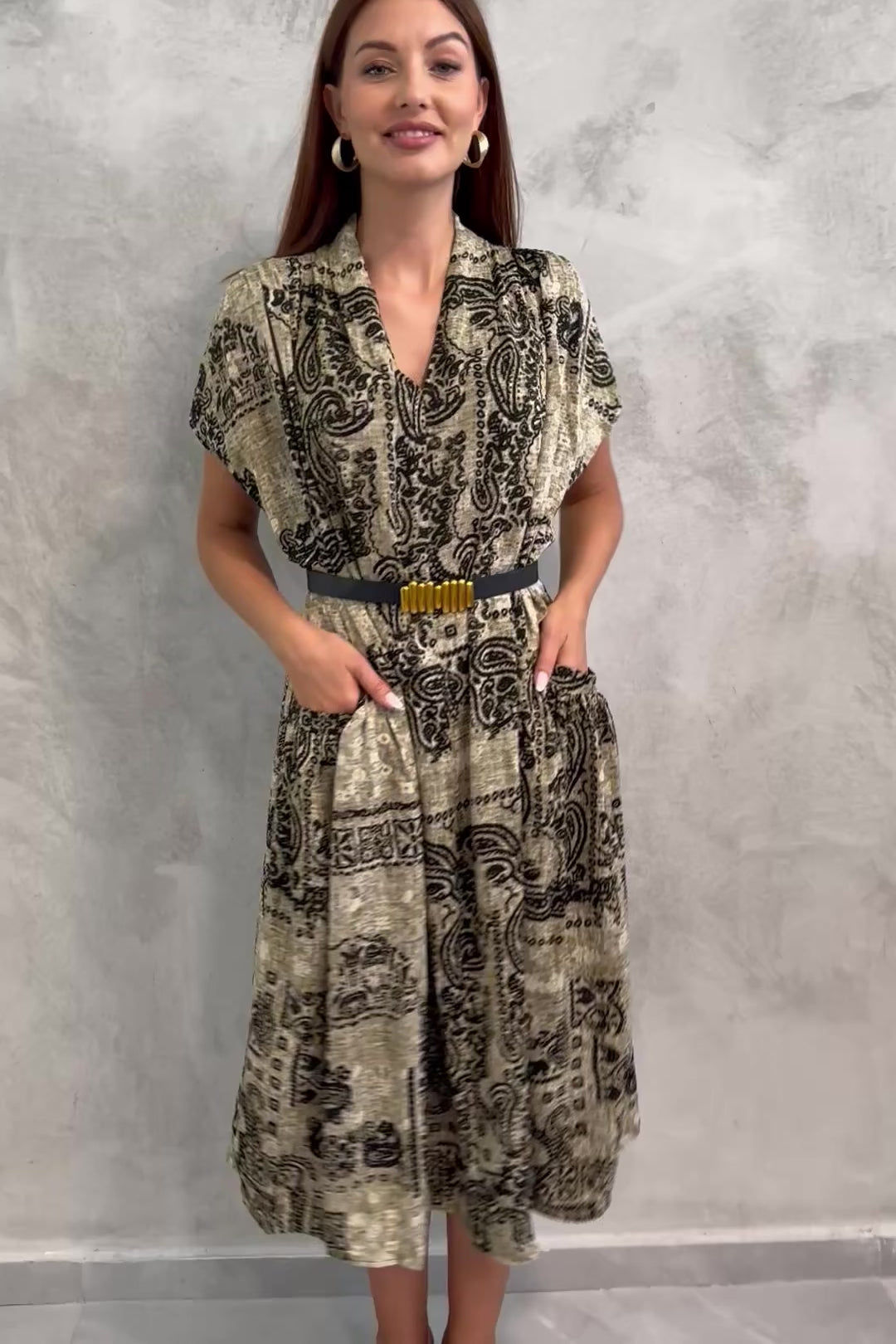 שמלת מקסי בגזרת A נוחה, עשויה בד קליל ונושם עם הדפס פייזלי אותנטי בגווני בז' ושחור. עם צווארון וי, שרוולים קצרים וכיסים צדדיים, שילוב מושלם בין נוחות לסטייל.