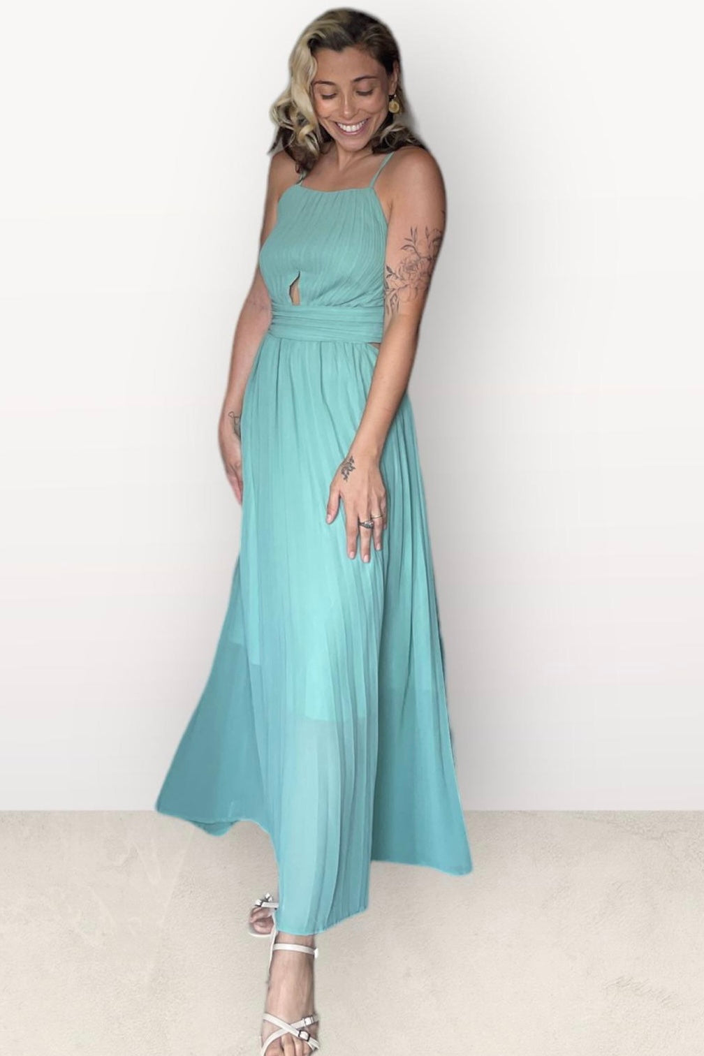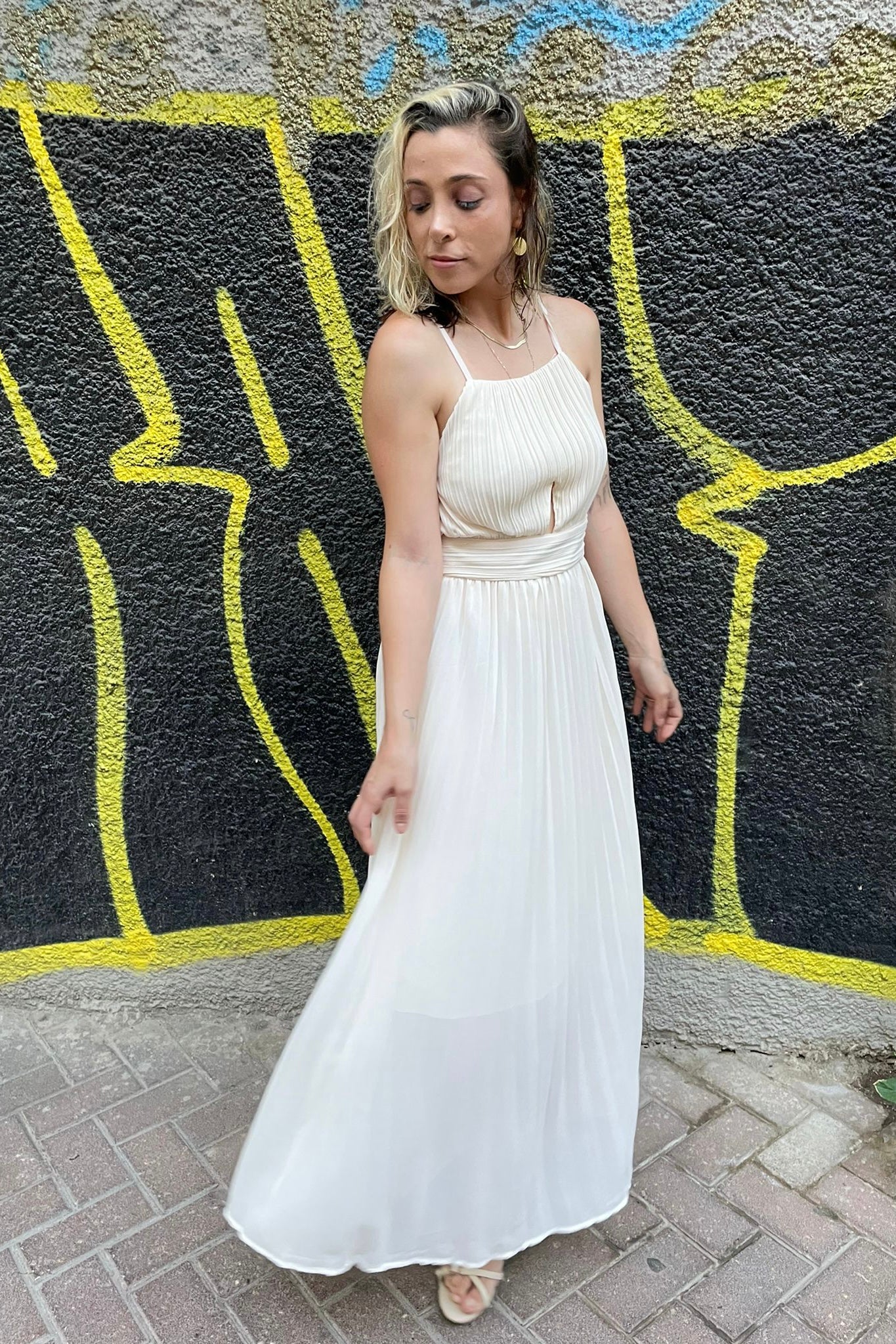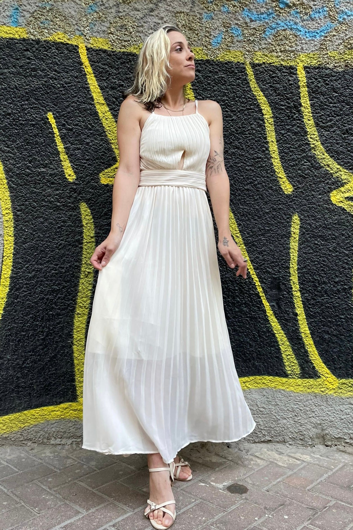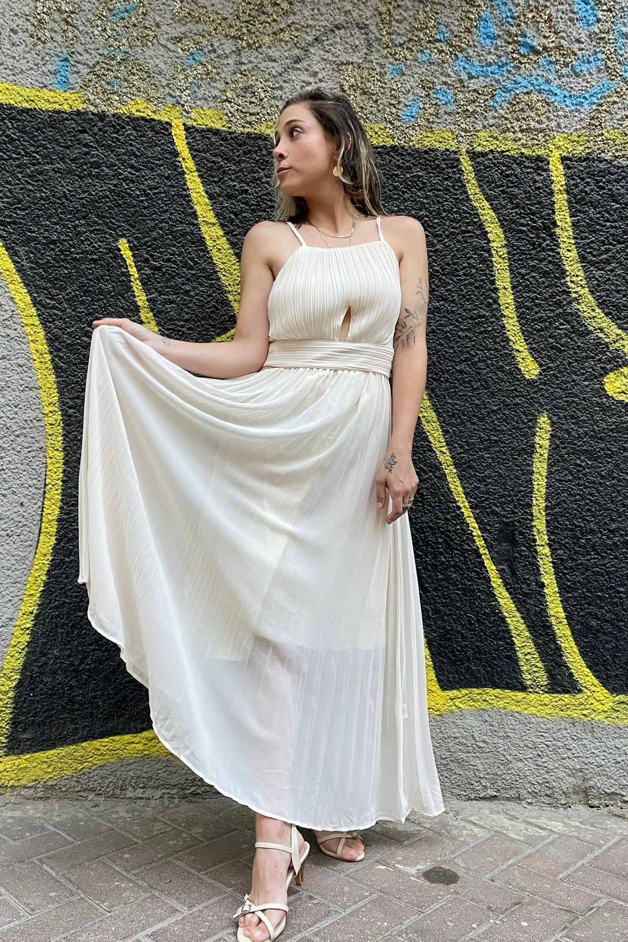 שמלת ערב באורך מקסי, חגיגית ומרשימה, בשילוב פתח מרכזי ופתחים צדיים.