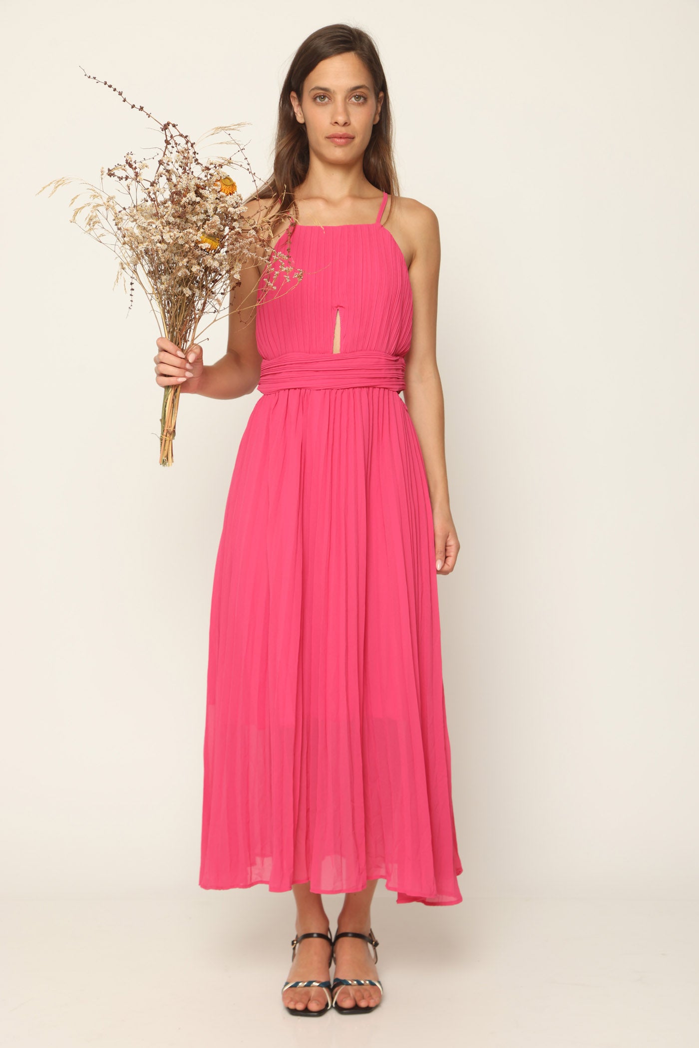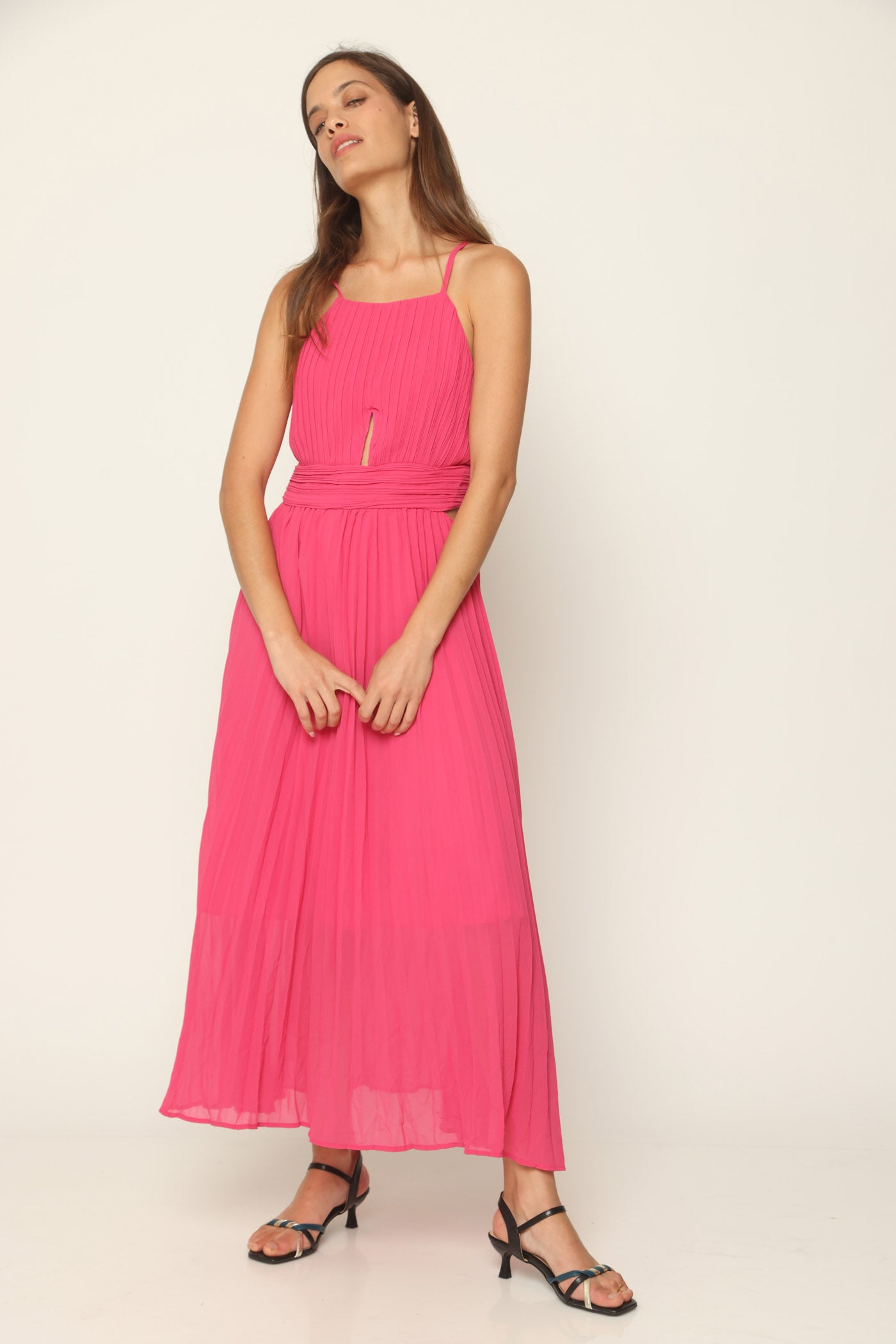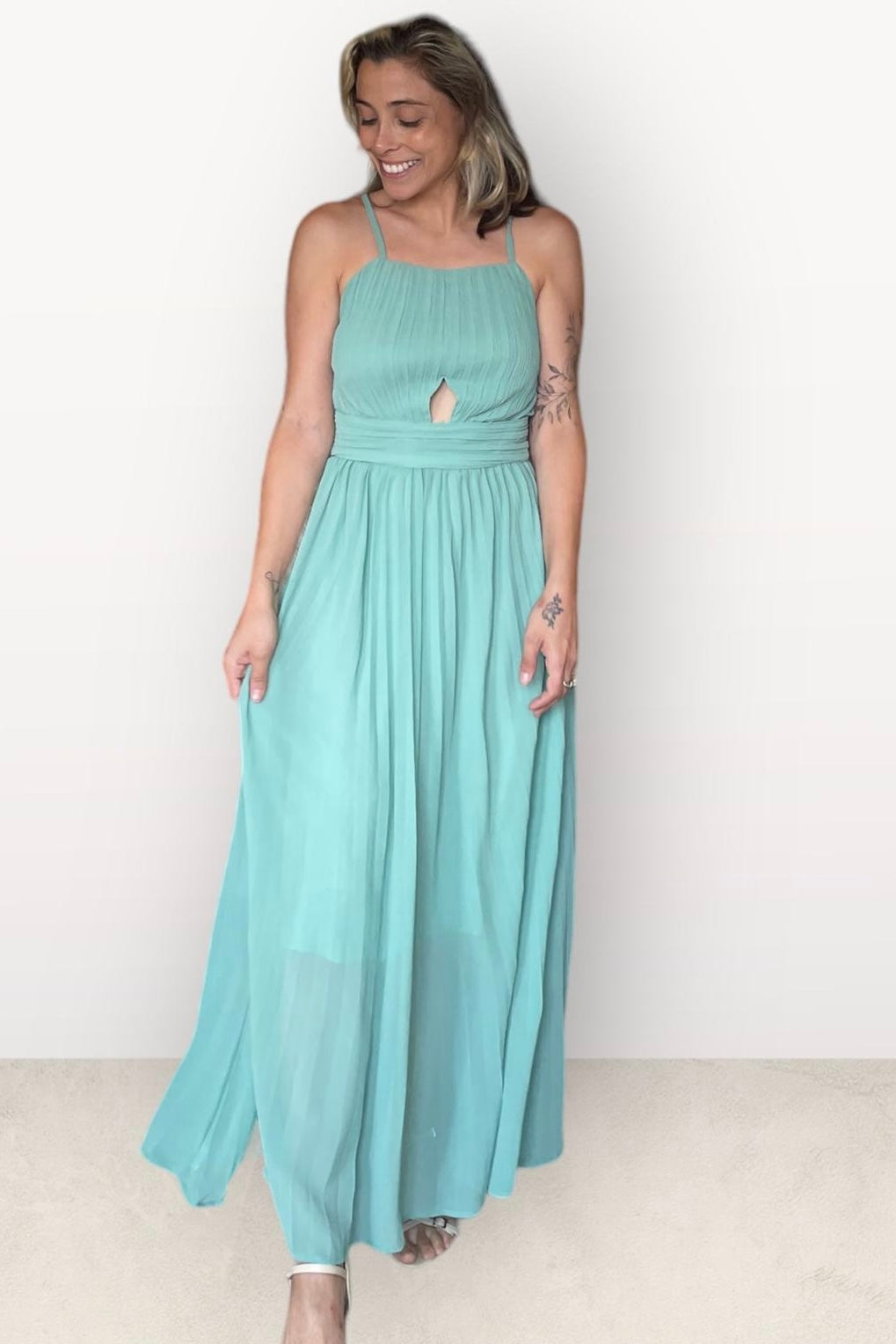 שמלת ערב באורך מקסי, חגיגית ומרשימה, בשילוב פתח מרכזי ופתחים צדיים.