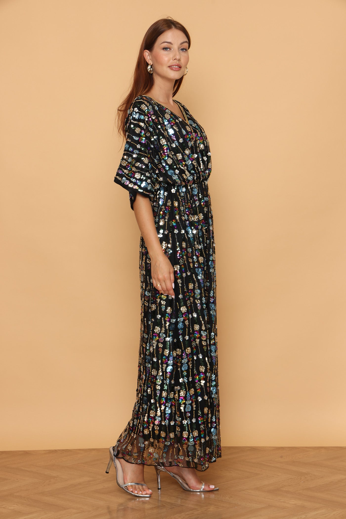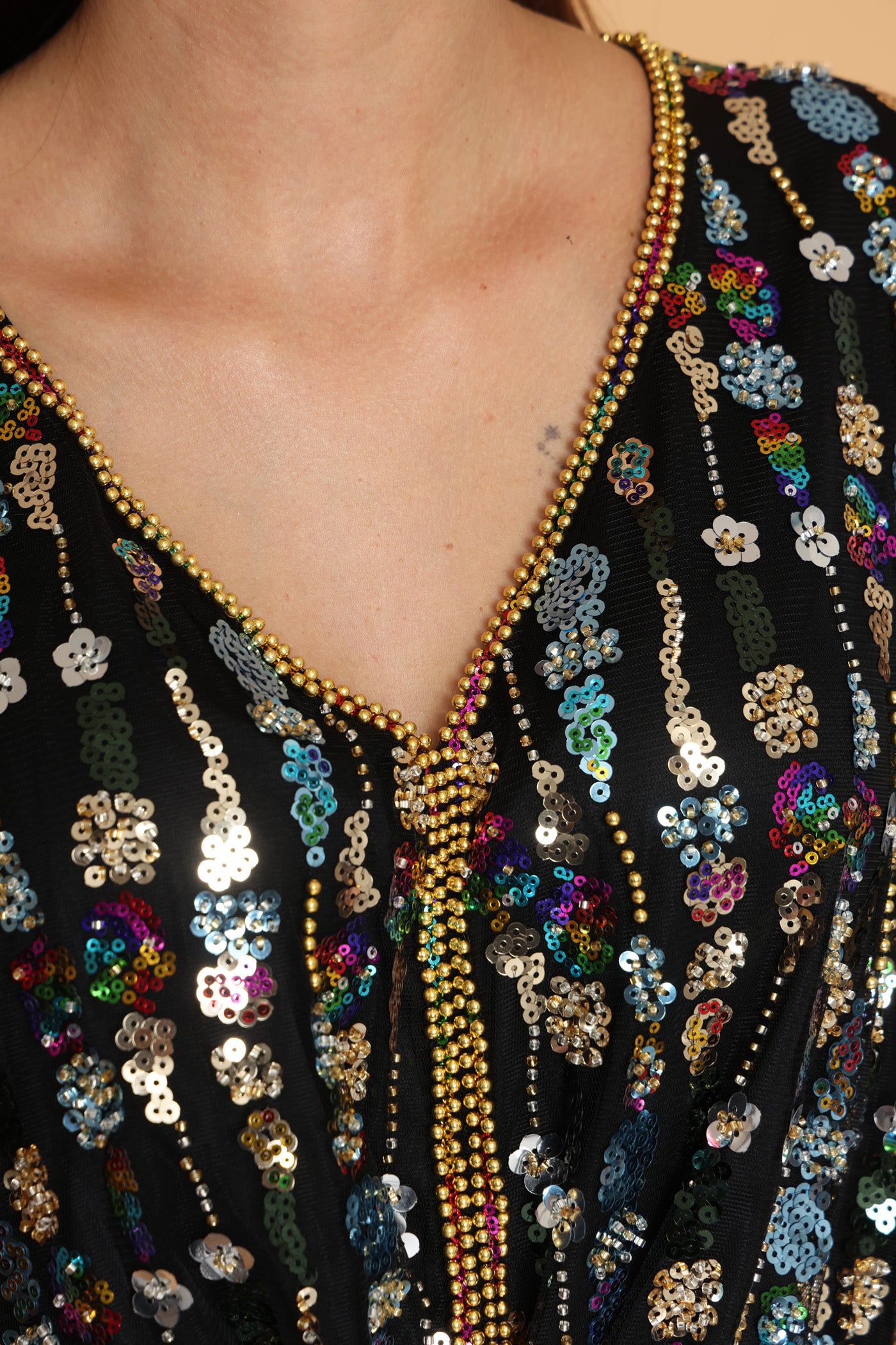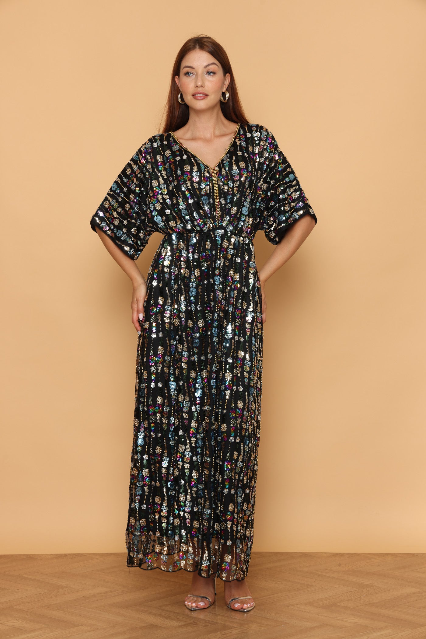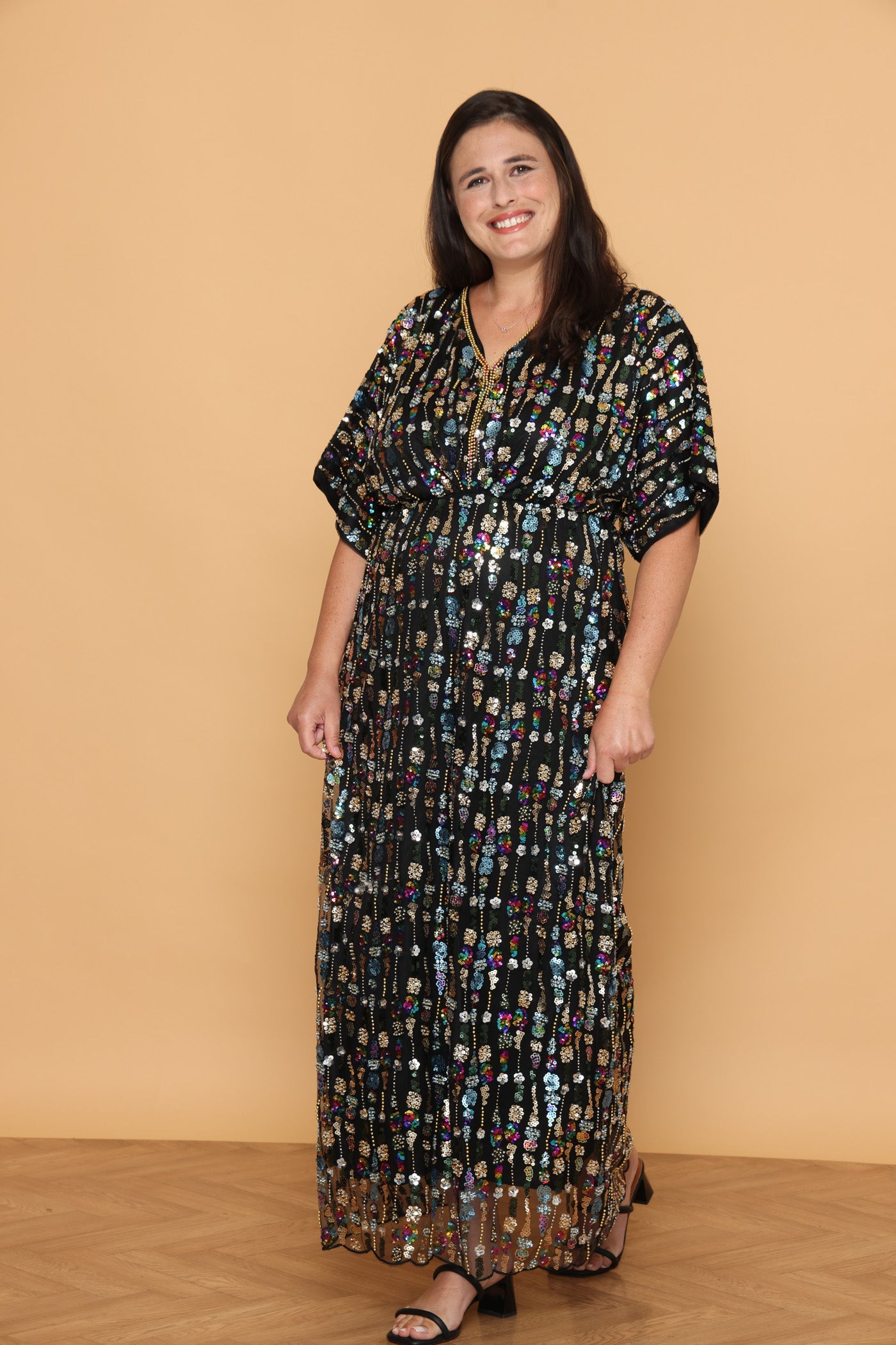 שמלת מקסי מהממת בגזרת קימונו רחבה עם מפתח וי וגומי במותן. הבד השחור משובץ פייטים מנצנצים בשלל צבעים, ומקבל טוויסט ייחודי בזכות שרשרת חרוזי זהב סביב המחשוף ובמרכז. דגם ייחודי, עשיר בפרטים שיגרום לכל אחת להרגיש כוכבת.