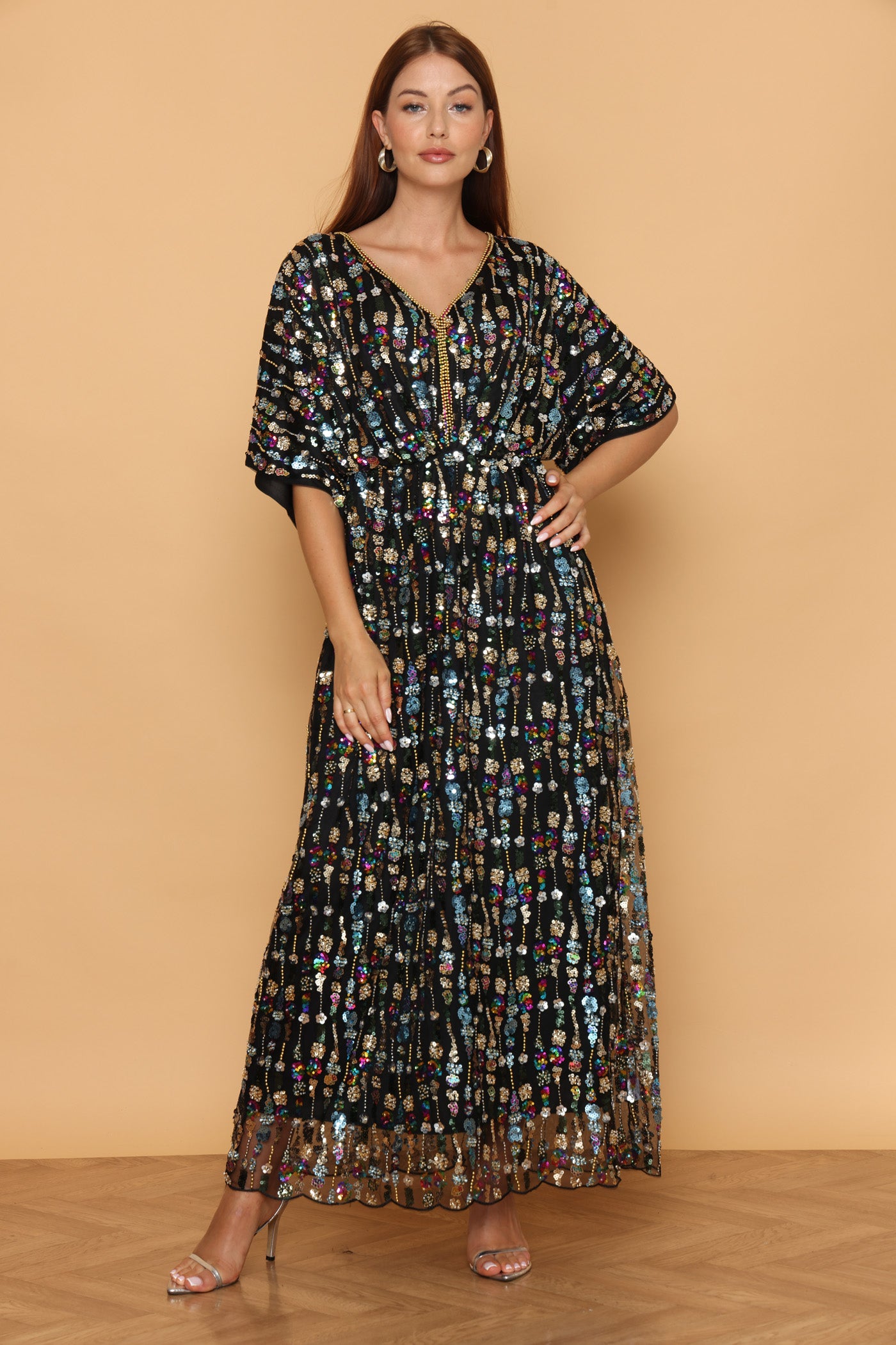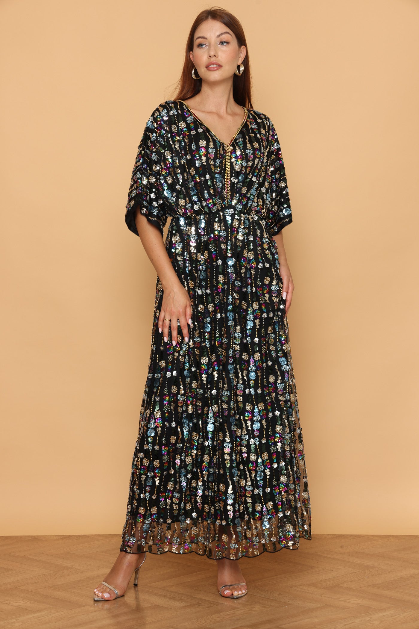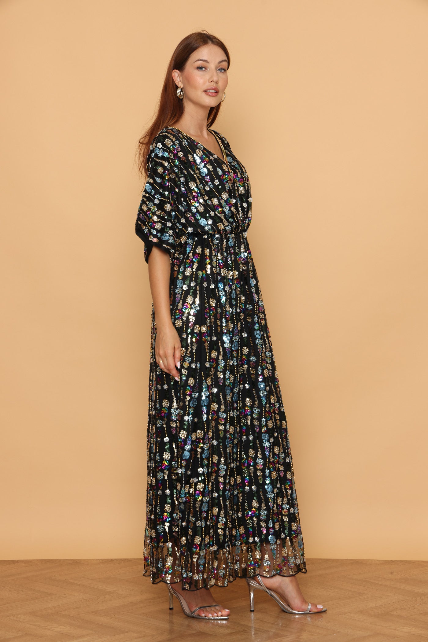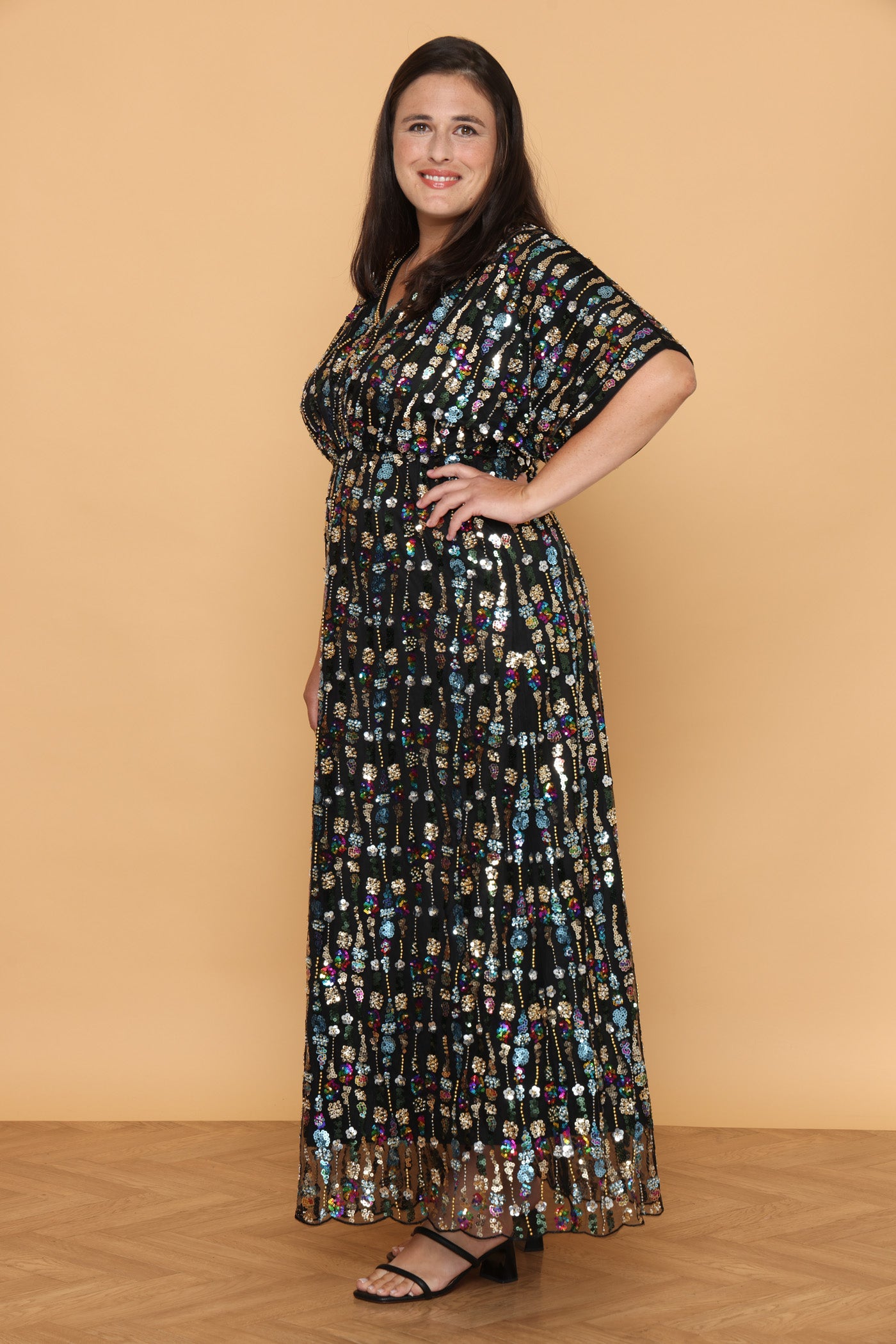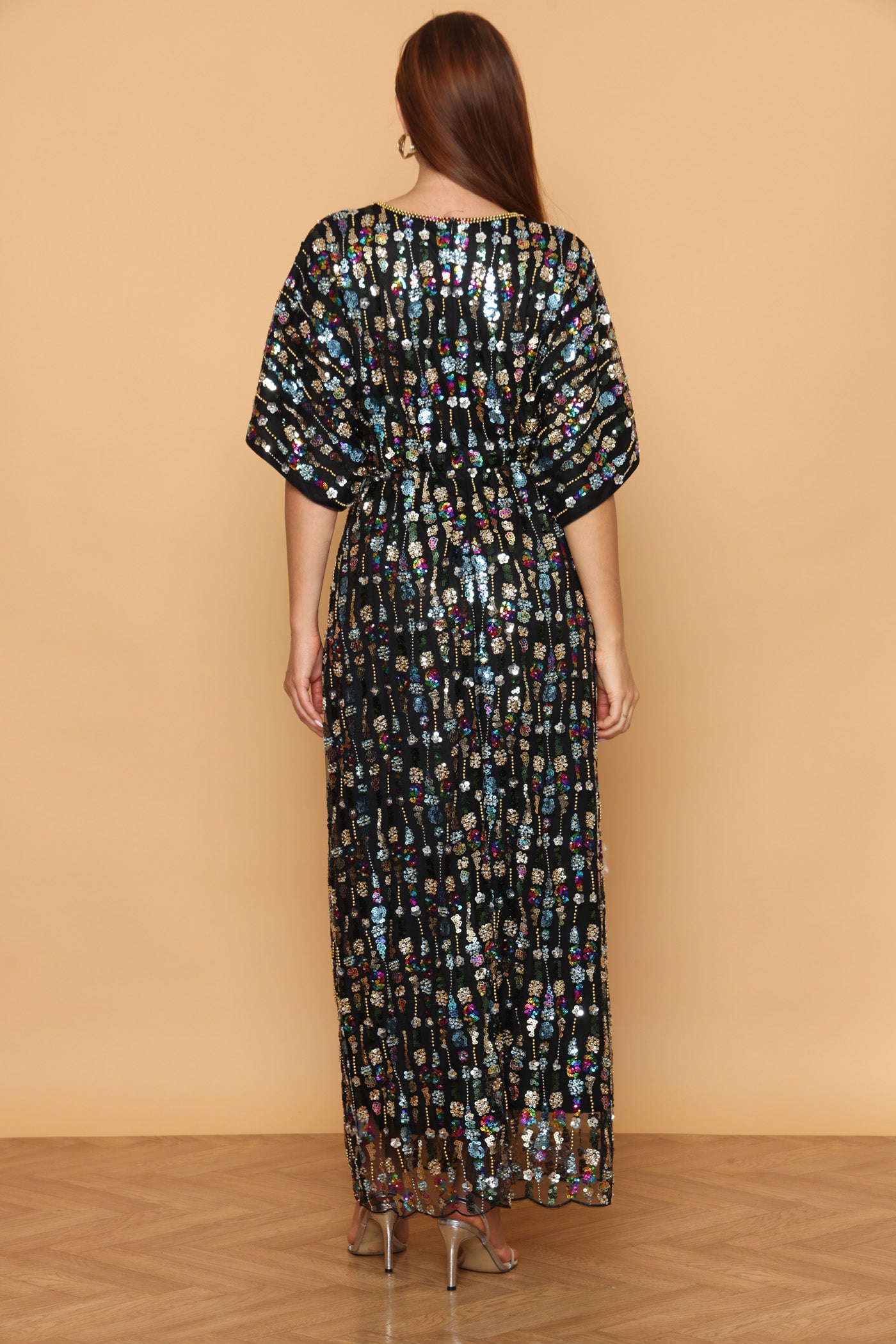 שמלת מקסי מהממת בגזרת קימונו רחבה עם מפתח וי וגומי במותן. הבד השחור משובץ פייטים מנצנצים בשלל צבעים, ומקבל טוויסט ייחודי בזכות שרשרת חרוזי זהב סביב המחשוף ובמרכז. דגם ייחודי, עשיר בפרטים שיגרום לכל אחת להרגיש כוכבת.