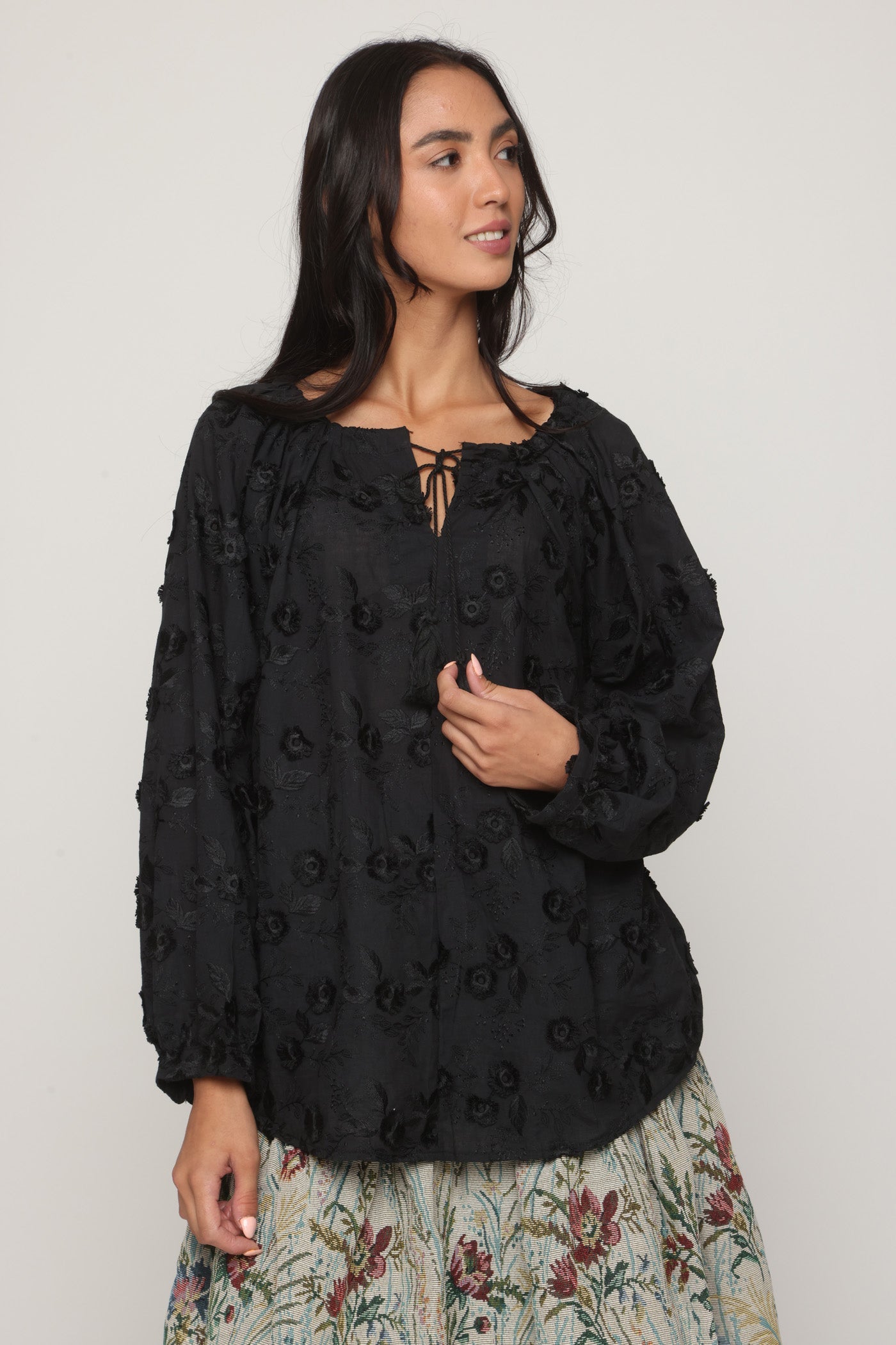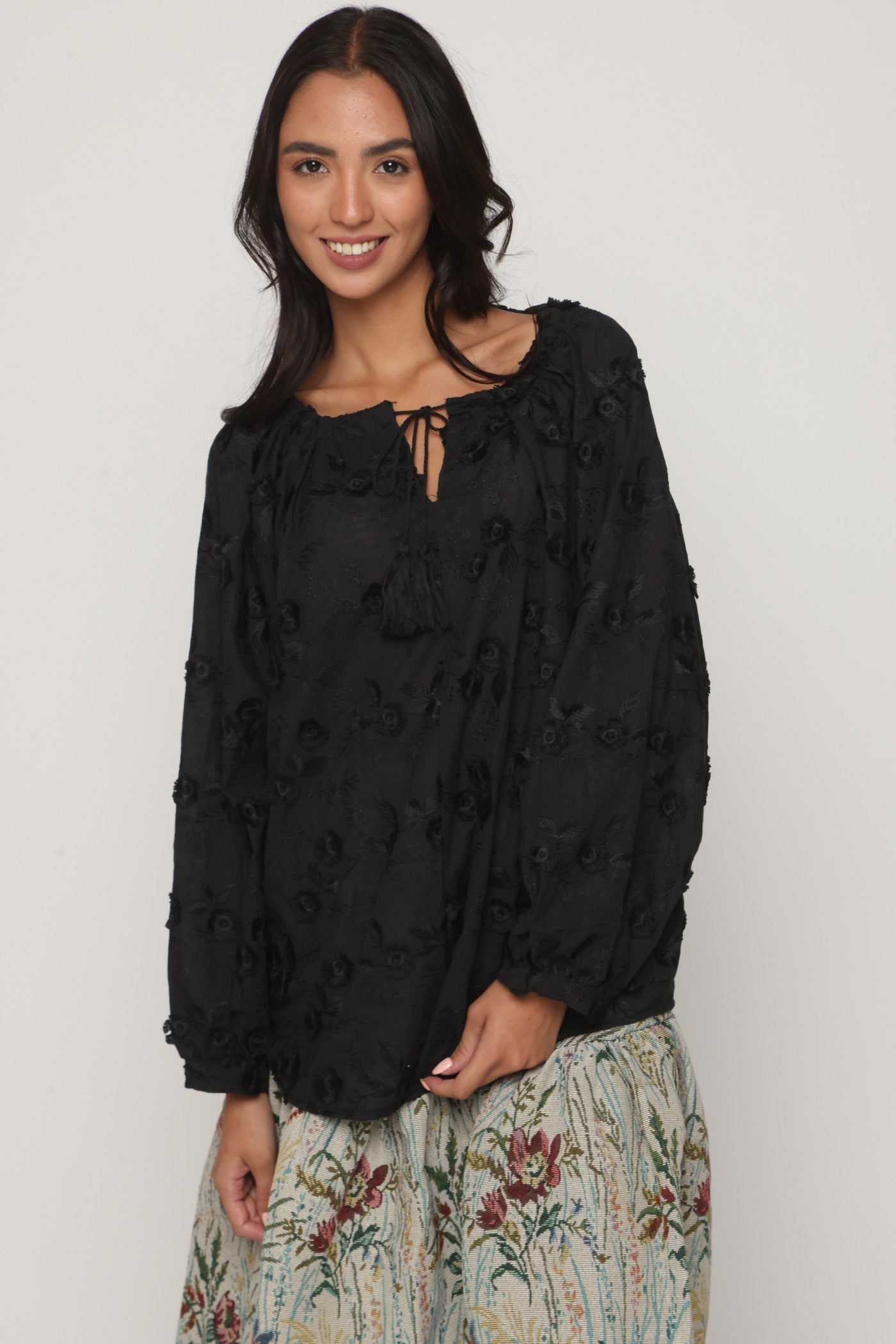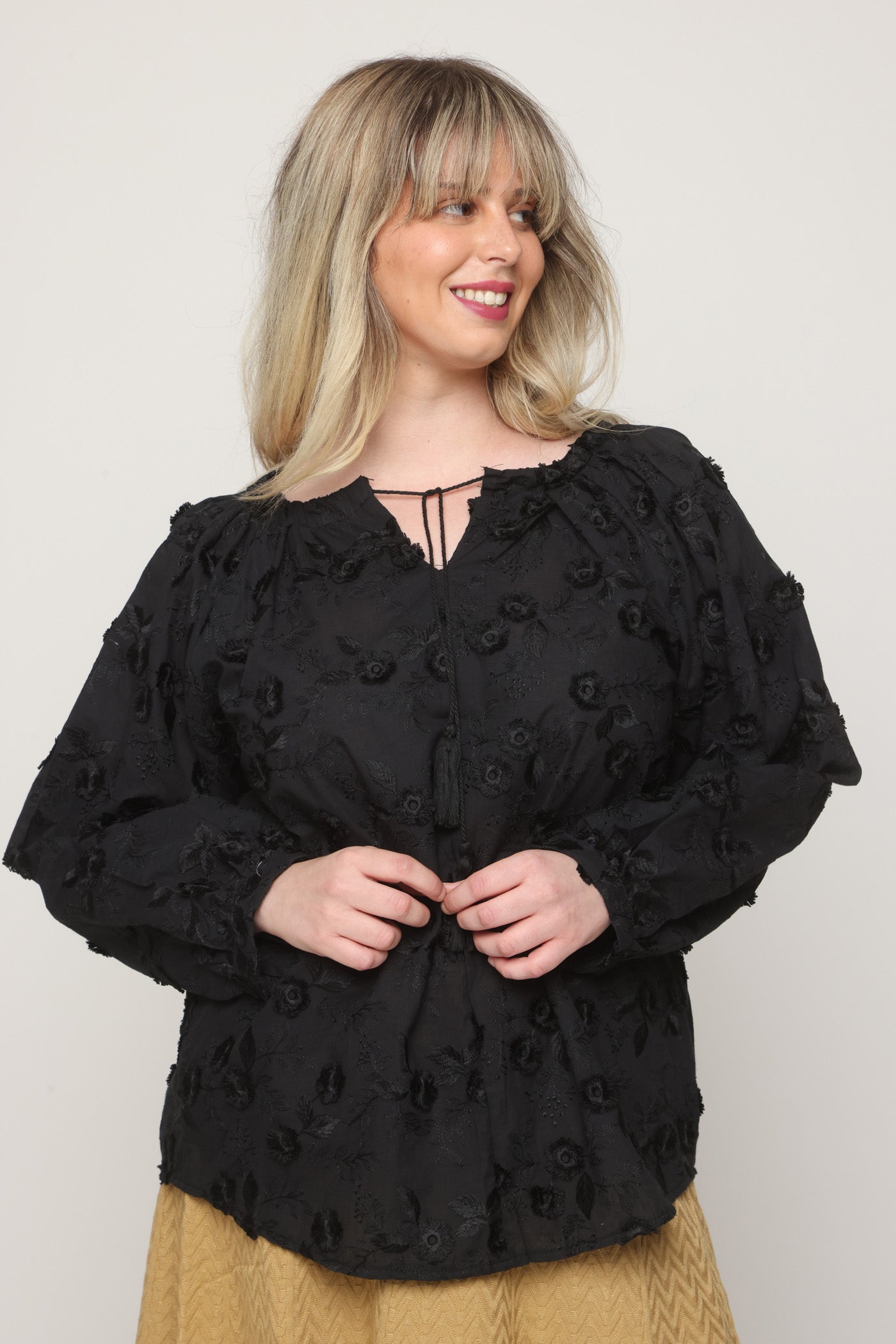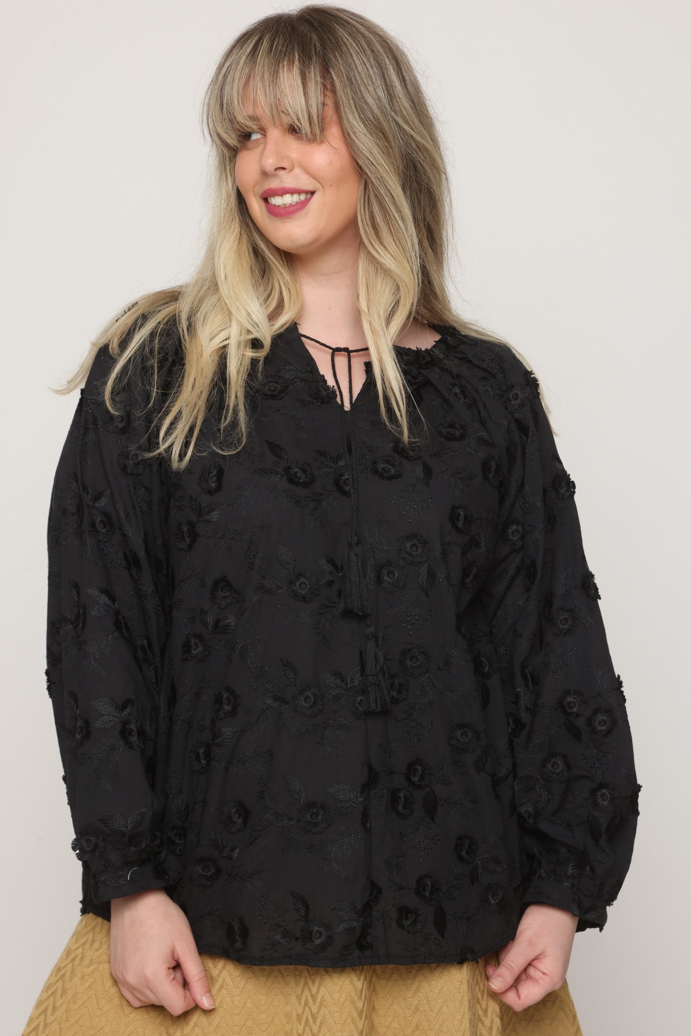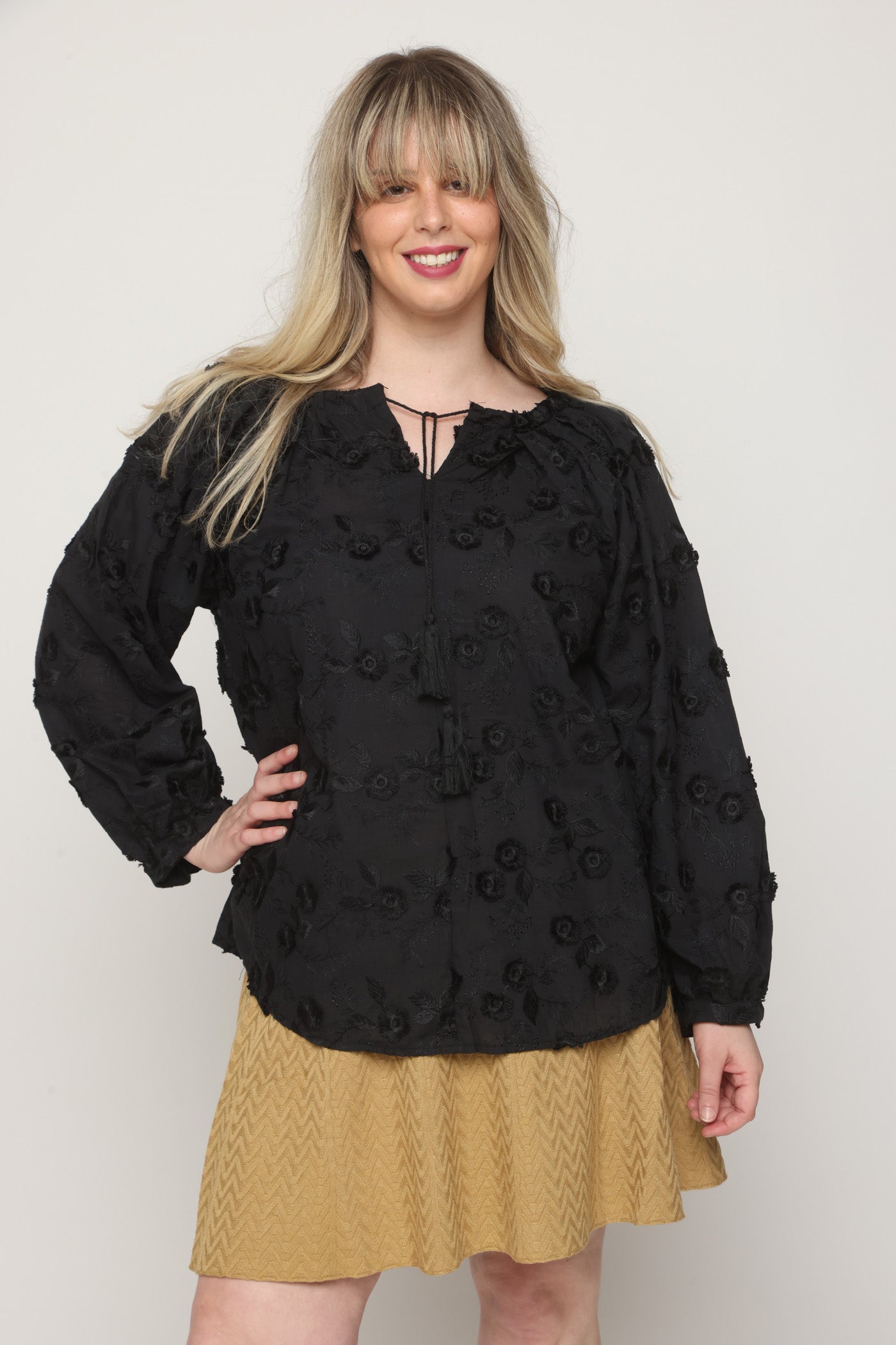 חולצה דקה, שקפקפה וחגיגית, בטקסטורת פרחים בולטים, בגזרה רחבה ועם סרט לקשירה בצווארון.