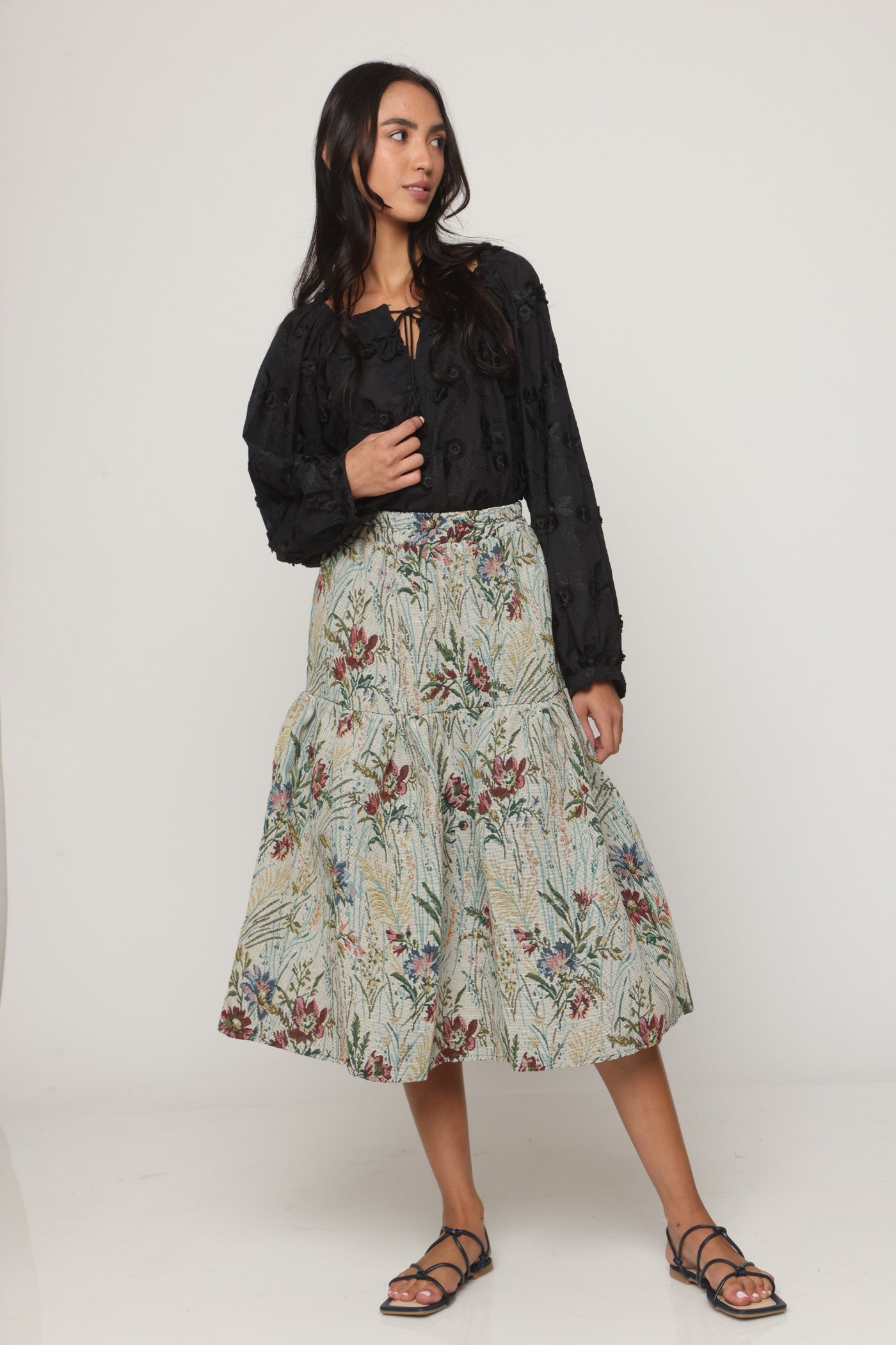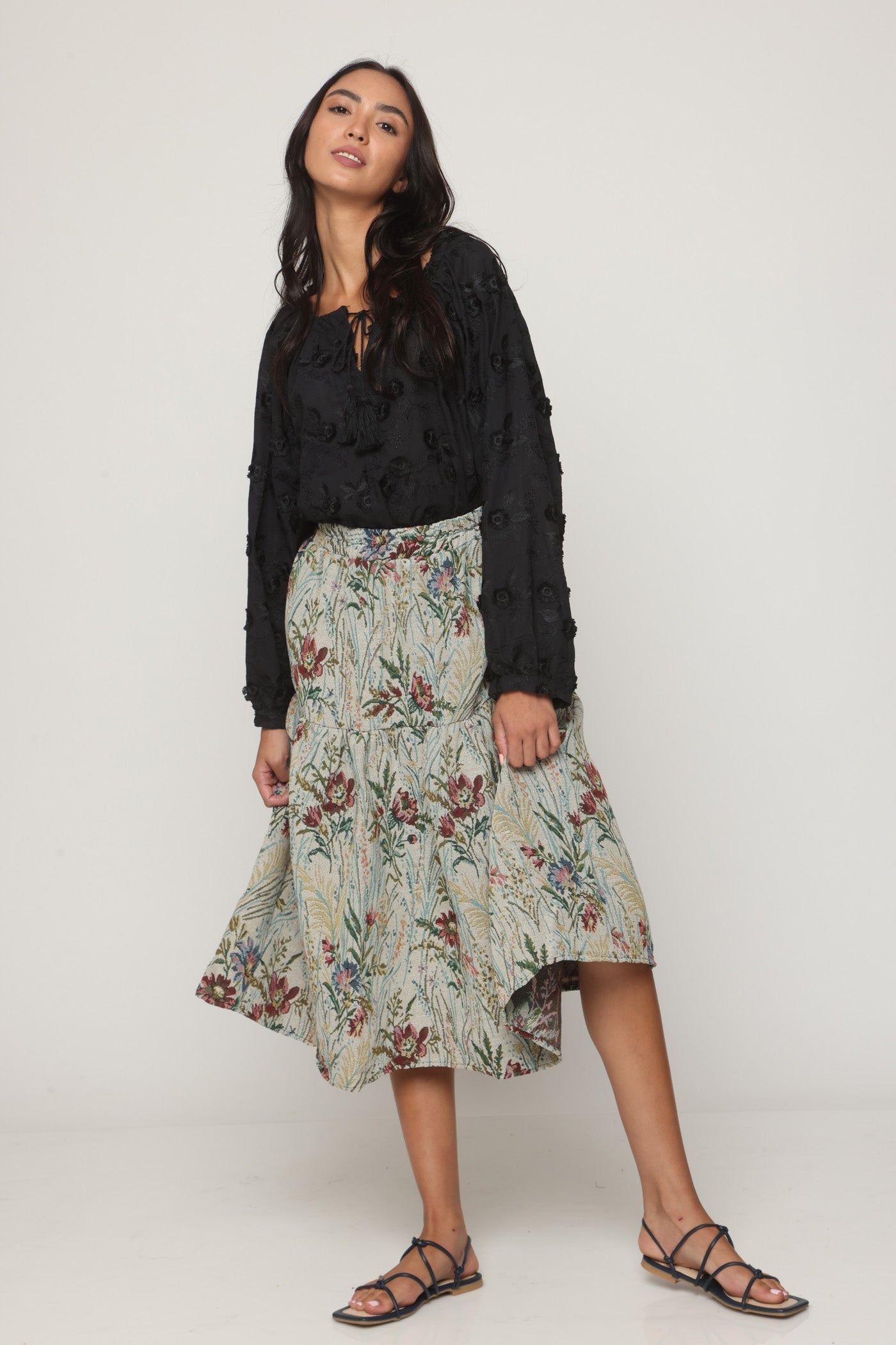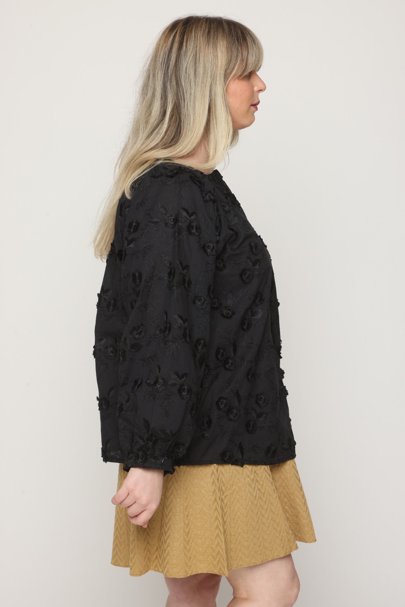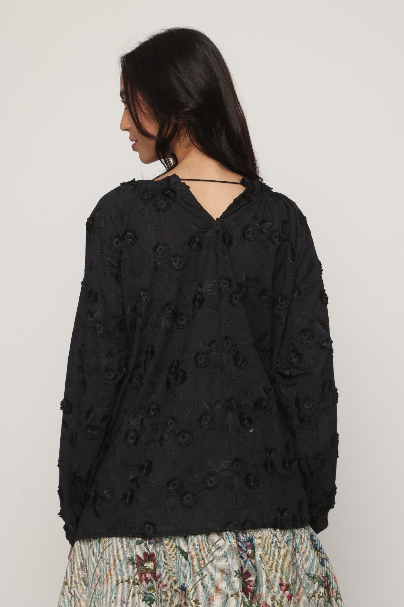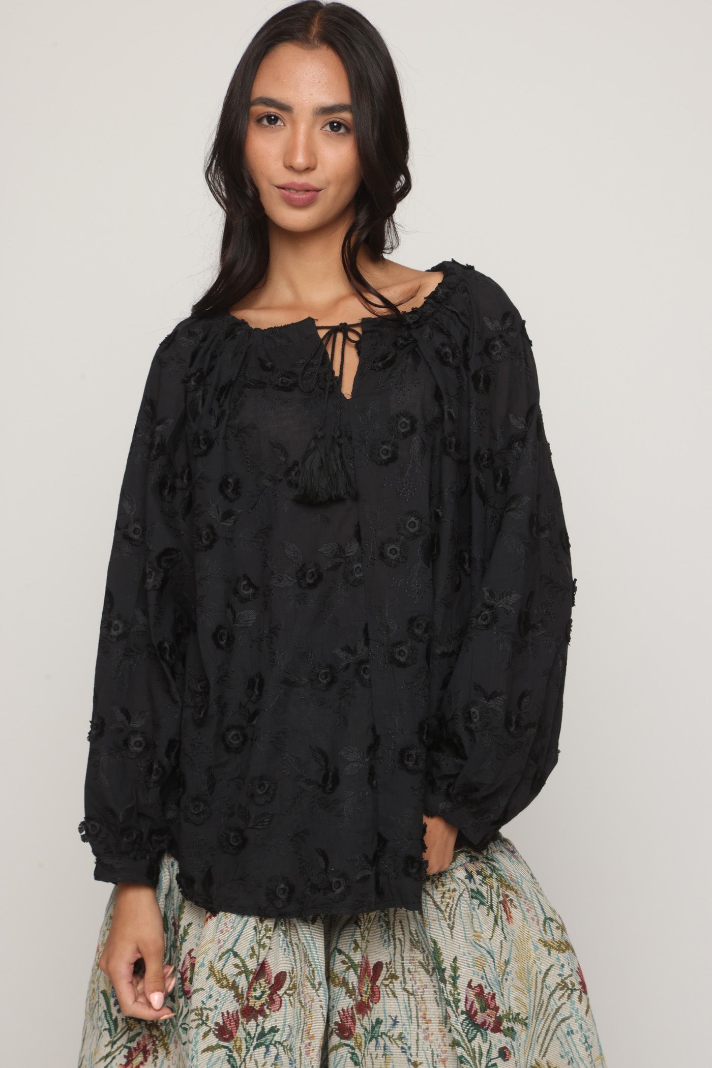 חולצה דקה, שקפקפה וחגיגית, בטקסטורת פרחים בולטים, בגזרה רחבה ועם סרט לקשירה בצווארון.