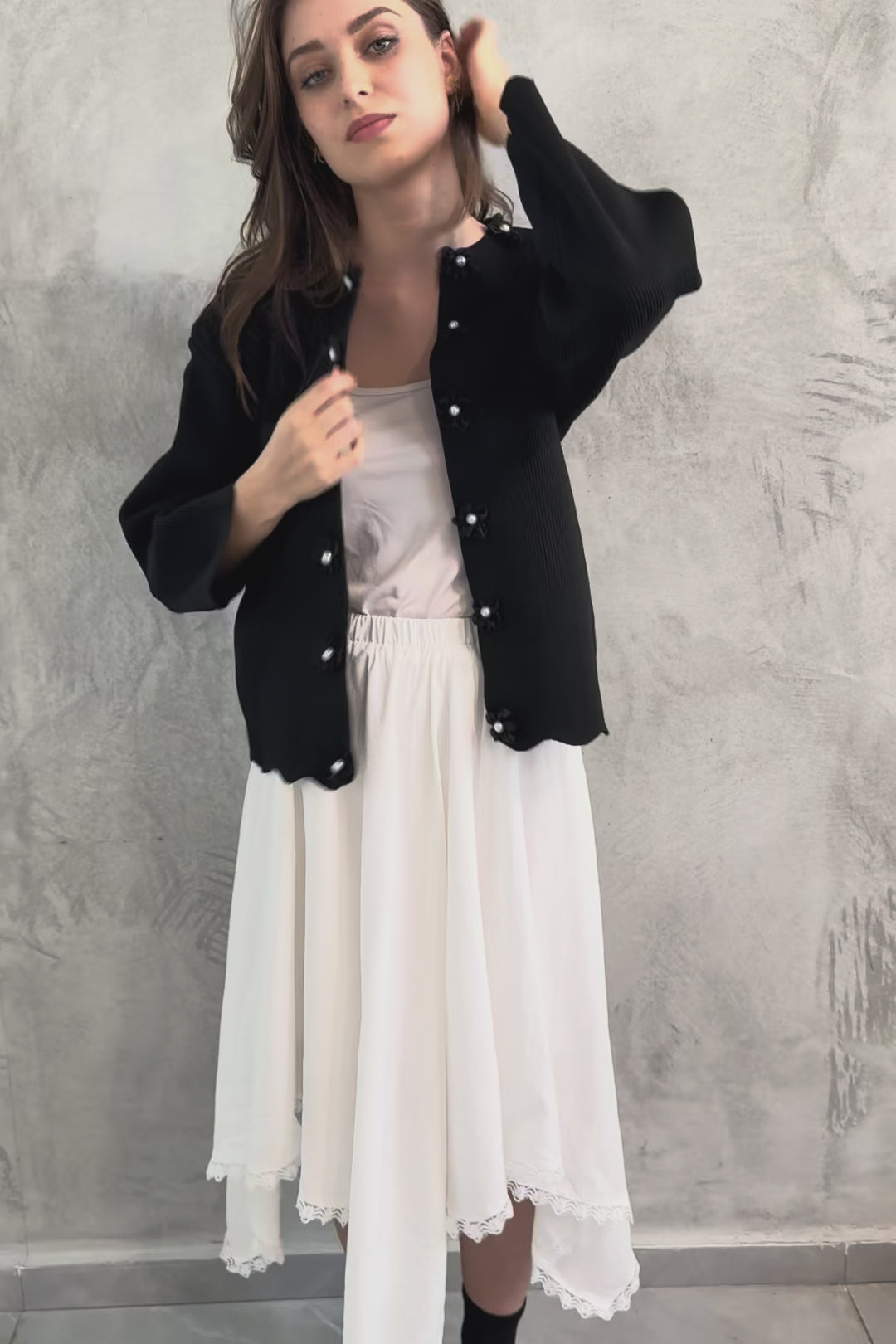 הקרדיגן פתוח ופרחי סאטן עם פנינה סובבים את המפתח.